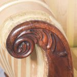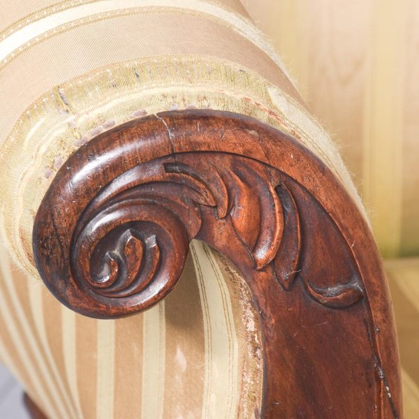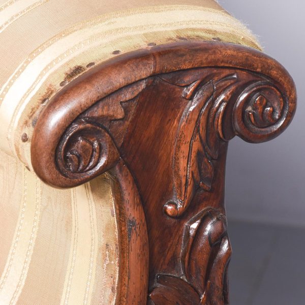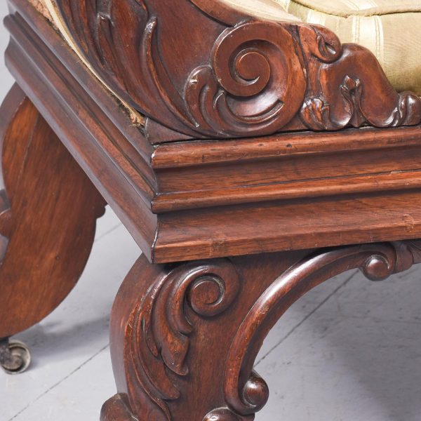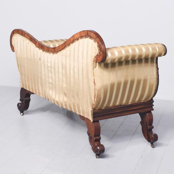 Circa 1825. A quality George IV rosewood framed chaise lounge of boudoir proportions. The shaped back in rosewood with curved facings, the back and arms upholstered, with a removable squab cushion. The facings are profusely carved with scrolling and foliate carvings, with a moulded seat rail, all resting on four shaped legs, front legs with foliate carving on the facings, finishing on original brass castors. (Requires upholstery)