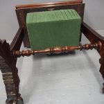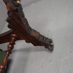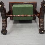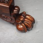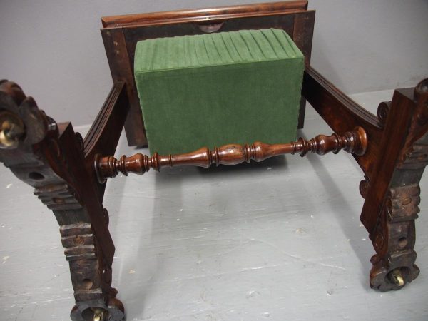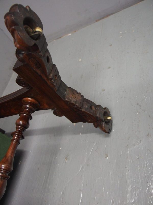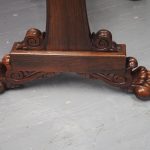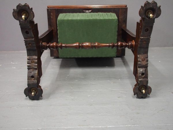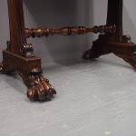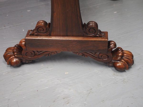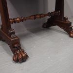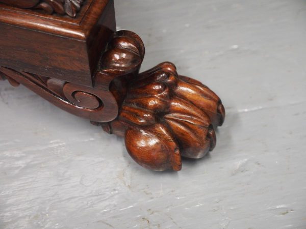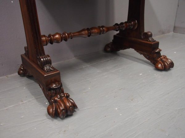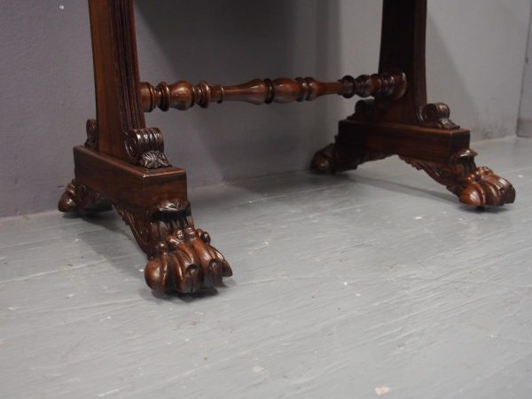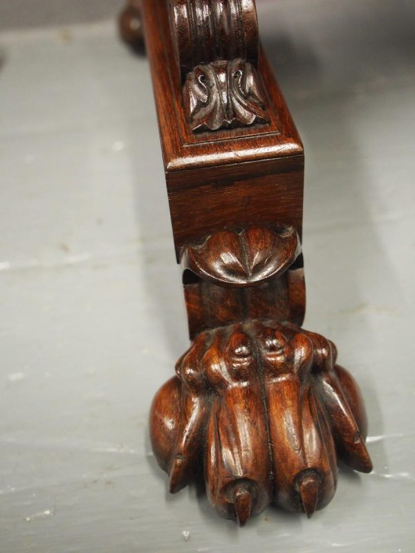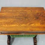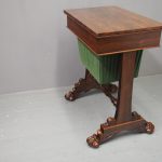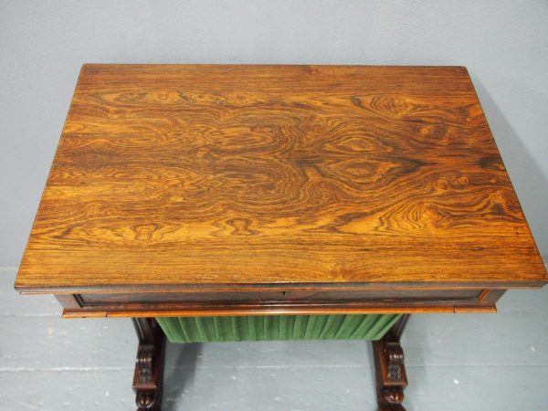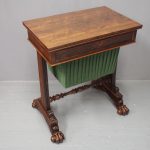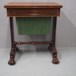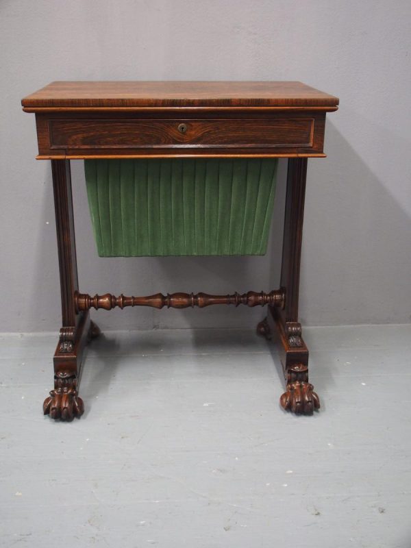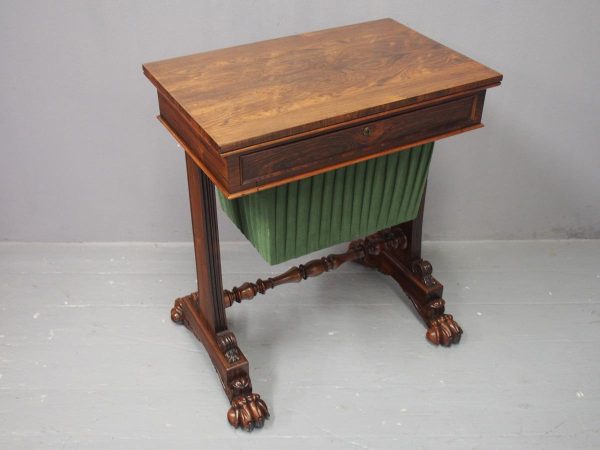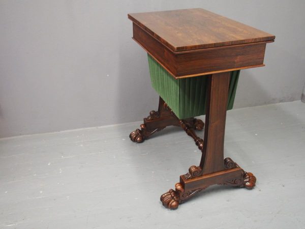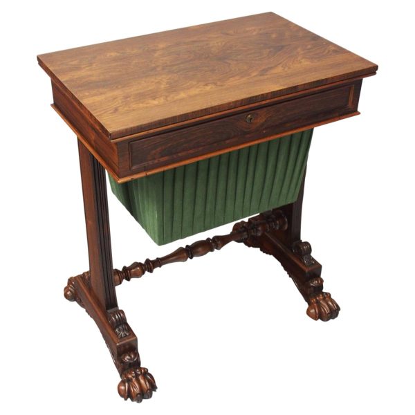 Circa 1825, George IV rosewood freestanding work table. The rectangular top in mirror matched rosewood veneers with simple edges, above a full length drawer with a Brahma style escutcheon, opening to a mahogany interior. Beneath is a recently reupholstered pleated bag for storing wool and needles all on tapering trestle end supports with a rib facing, and scrolling blocks finishing with foliate carving. A turned and ring turned stretcher unites them, and they finish on highest quality carved ball and claw feet with foliate carving to the top and base, scrolling blocks to the sides.