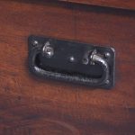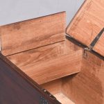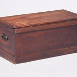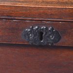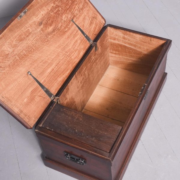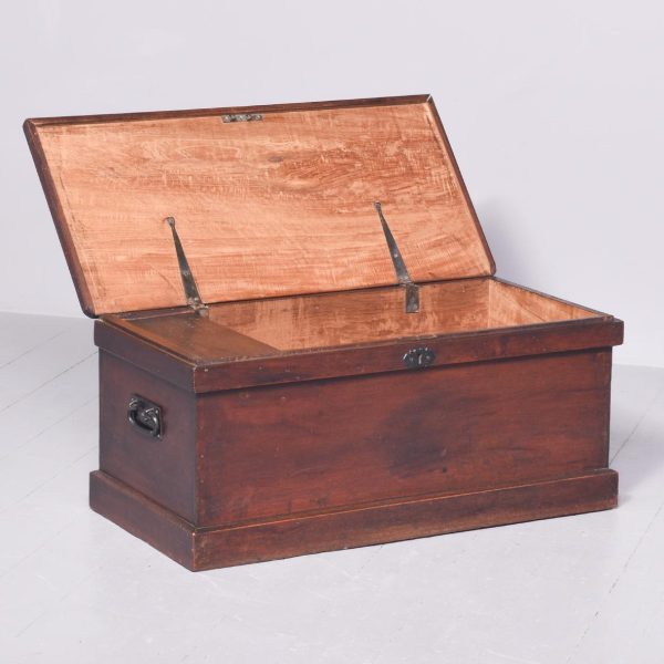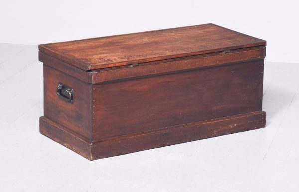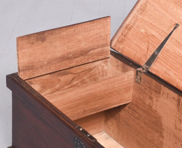 Circa 1830. A quality solid teak William IV trunk or kist. The rectangular solid top with moulded fore-edge and a flat section beneath, the top with blacksmith made strap hinges opens to reveal an uninterrupted interior with a small lidded candle box to one side. To the front an elegant pierced escutcheon, with blacksmith made iron lifting handles to the sides, resting on a large enclosed plinth with a chamfered top.