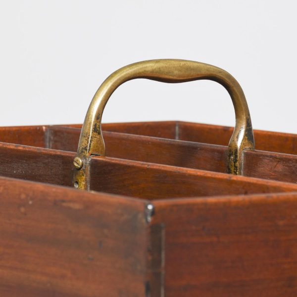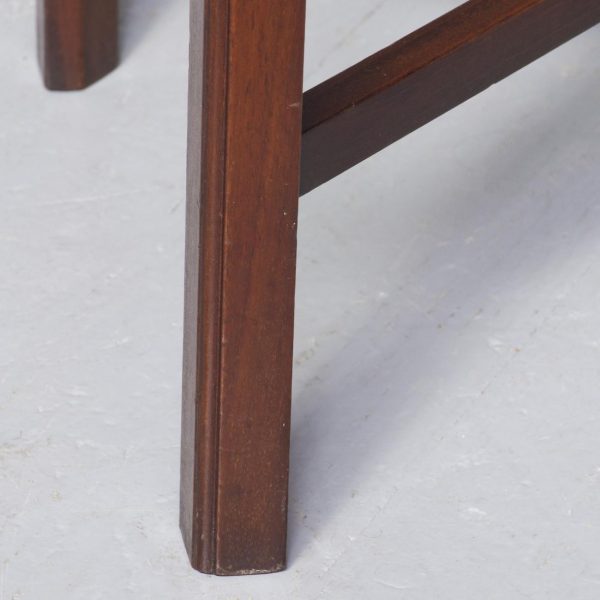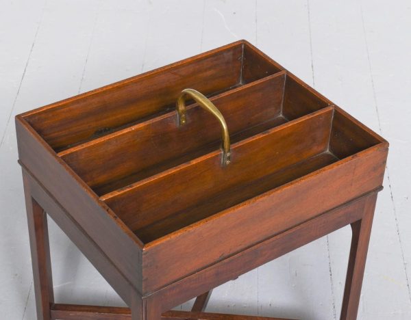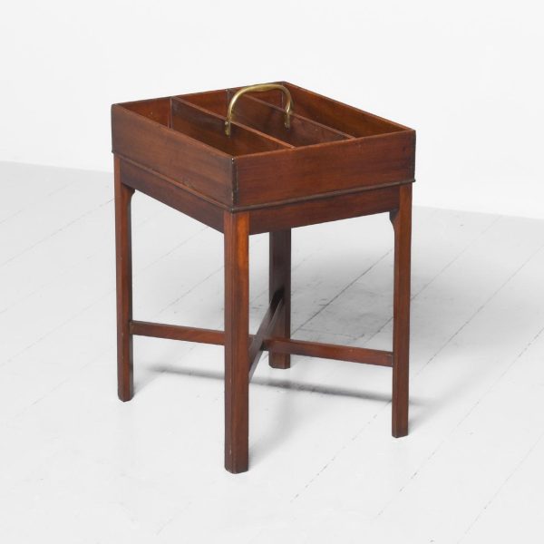 Circa 1790. An interesting George III mahogany butler’s cutlery tray on a later mahogany stand. With three polished divisions, with a large cast brass lifting handle in the center. Dove tails visible on the sides, the tray has been added to a rectangular stand with square legs with chamfered on the inside intersected by cruciform stretcher towards the base.