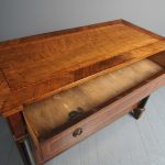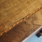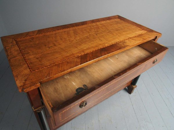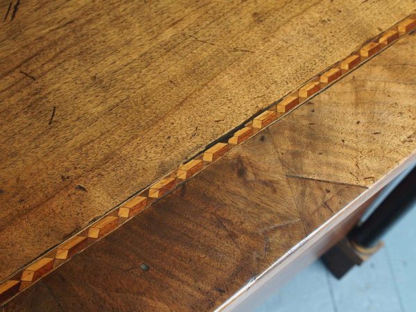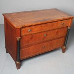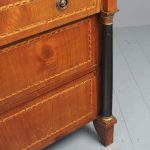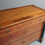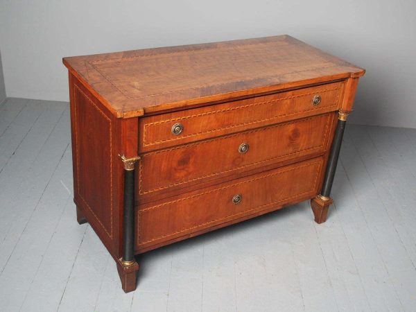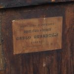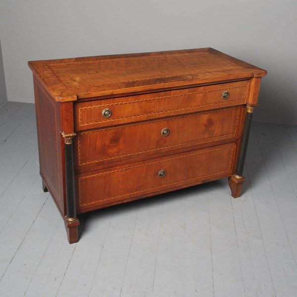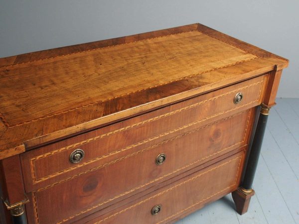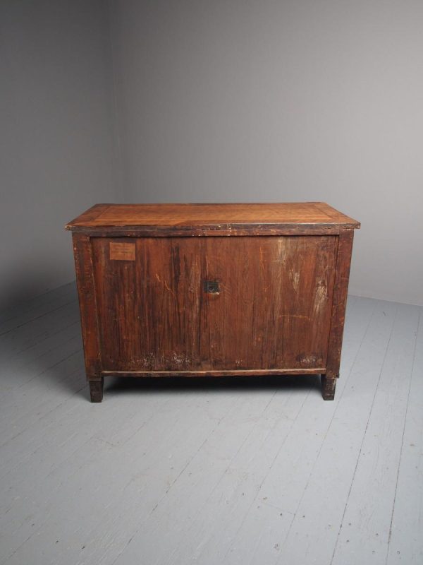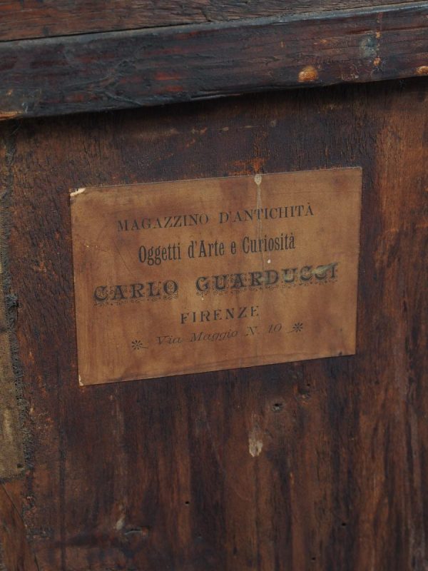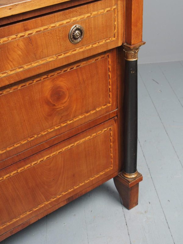 Circa 1780, Italian inlaid commode. The rectangular shaped top with breakfront section and unusual inlaid design, over a configuration of similarly inlaid drawers (1 short over 2 large). The gables with further inlay and with a pair of gilded, tapering columns leading to the raised block feet. With an Italian trade label to the back of ‘Magazzino D’Antichita – Oggett d’Arte e Curiosita – CARLO GUARDUCCI – Firenze – Via Maggio N.10’
