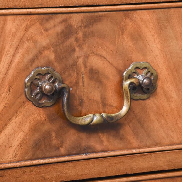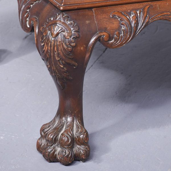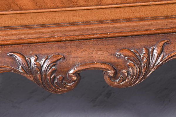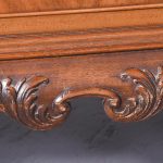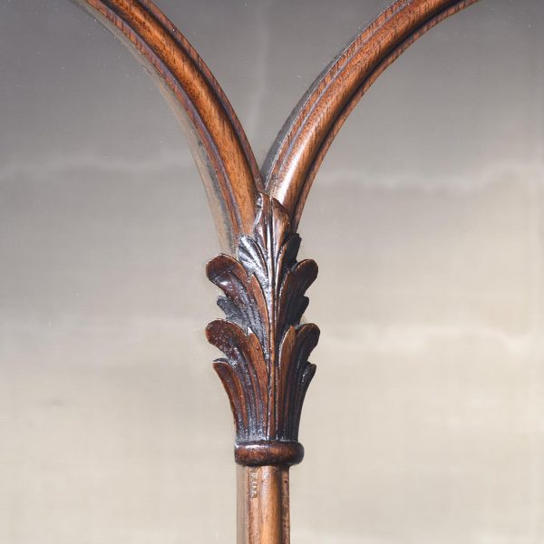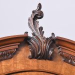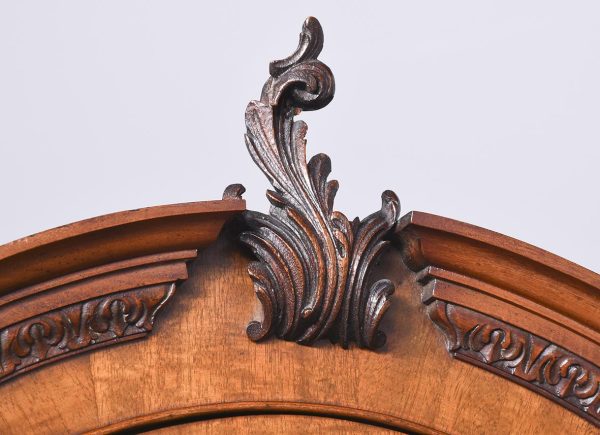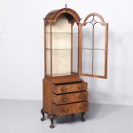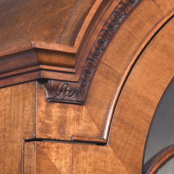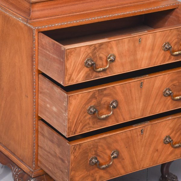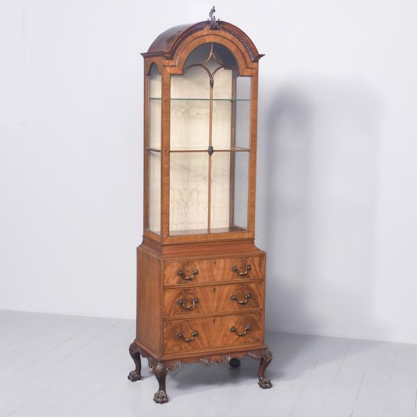 Circa 1900, a George III style cabinet on chest. The arched top surmounted with foliate carving on a broken shaped cornice, with further carving on the frieze. Single large door with elegant astragals and foliate carving, inside there are three adjustable glazed shelves. Beneath the door there is a concave section, the base with a beaded fore-edge and three graduating drawers, each with cast brass swan neck handles and pierced flower-head backplates. Beneath this there is a well carved foliate shaped frieze, all resting on four hairy paw feet.