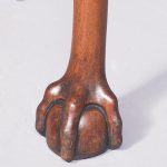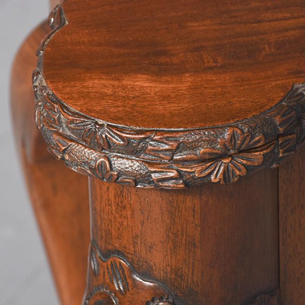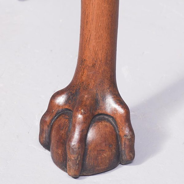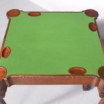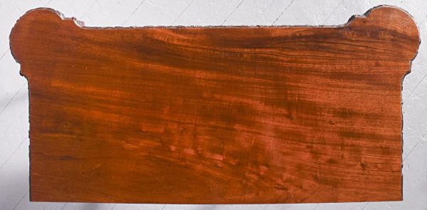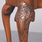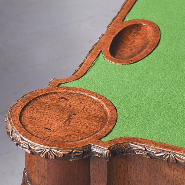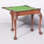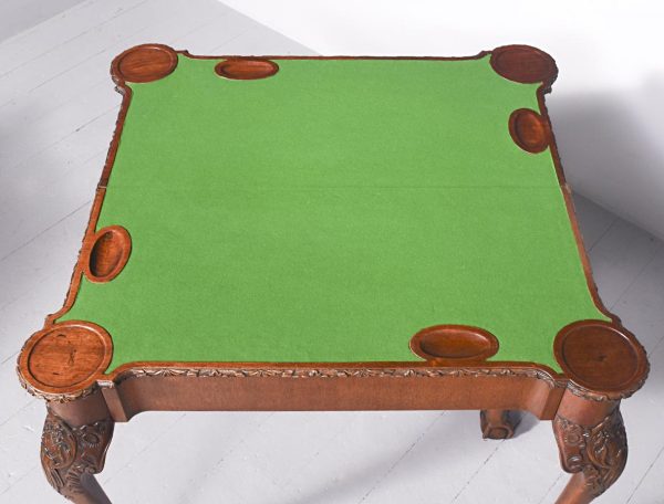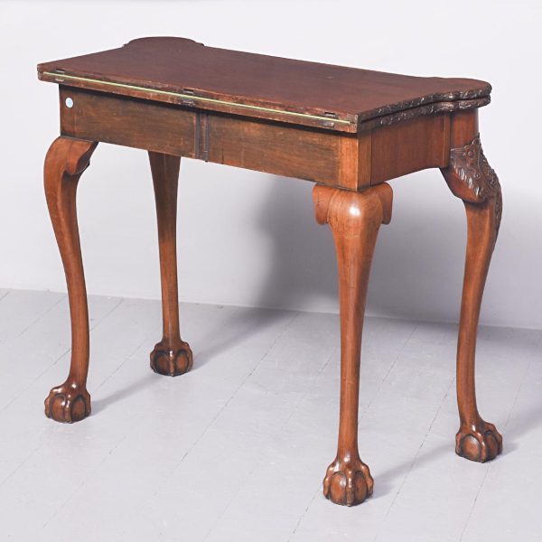 Circa 1840. A quality George III style mahogany shaped fold over card table. The rectangular top with bow ends and a finely carved foliate fore-edge, the top opens to reveal a felt lined interior with guinea wells and drink placements. One of the back legs is hinged and swings out to support the top when open, the deep shaped frieze conceals a full-length drawer which is oak lined, all resting on four elegant shaped cabriole legs, the front ones profusely carved on the facing with a pattern resembling a cartouche, all terminating on a ball and claw foot.