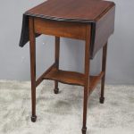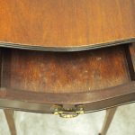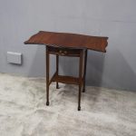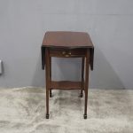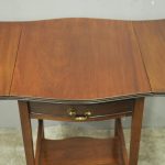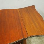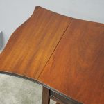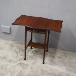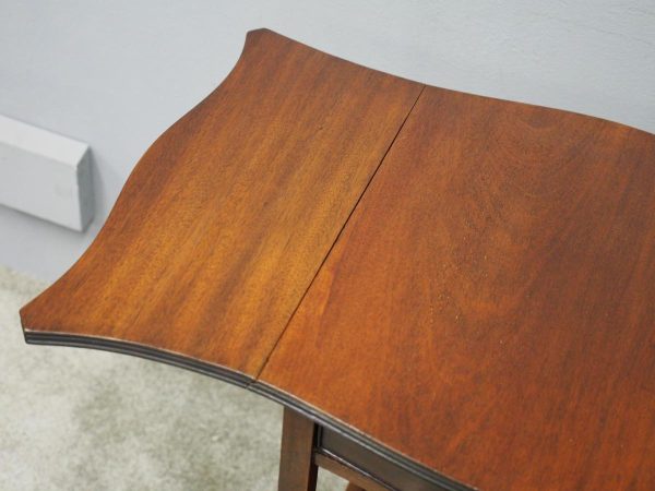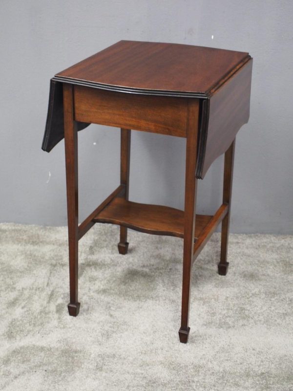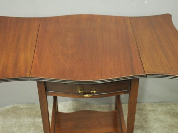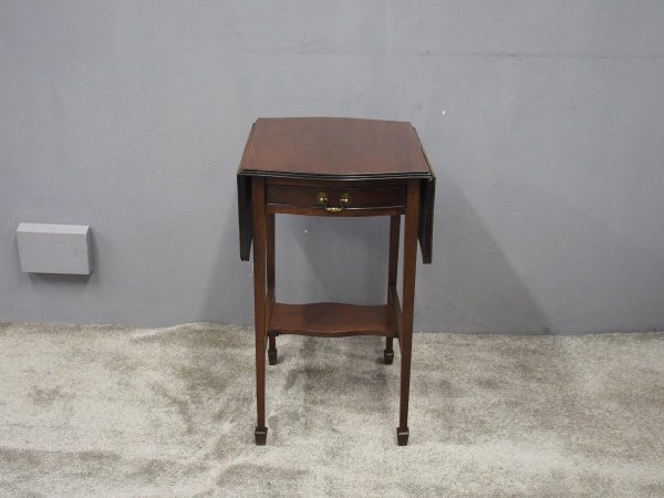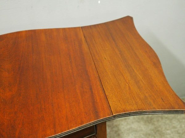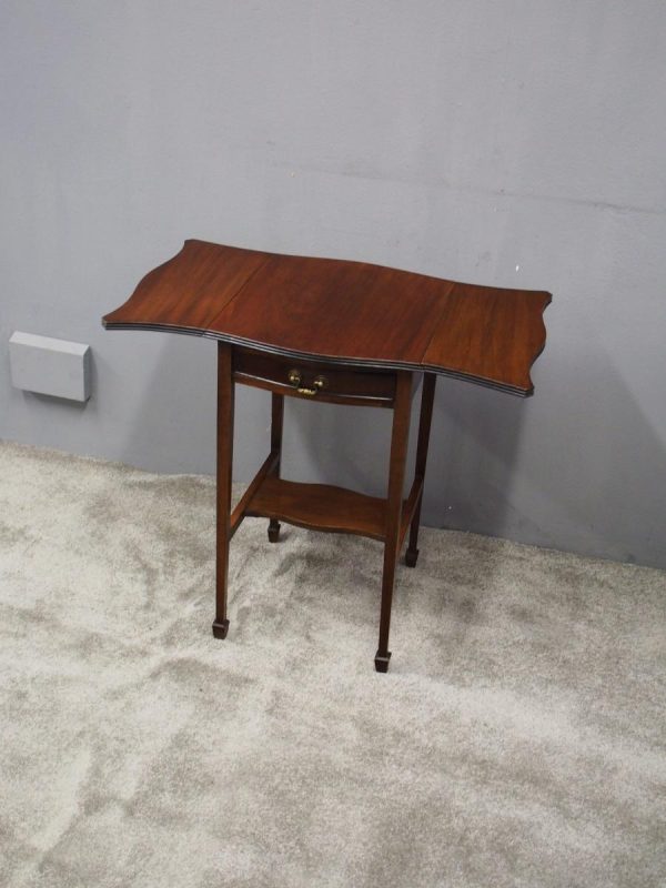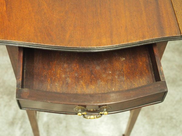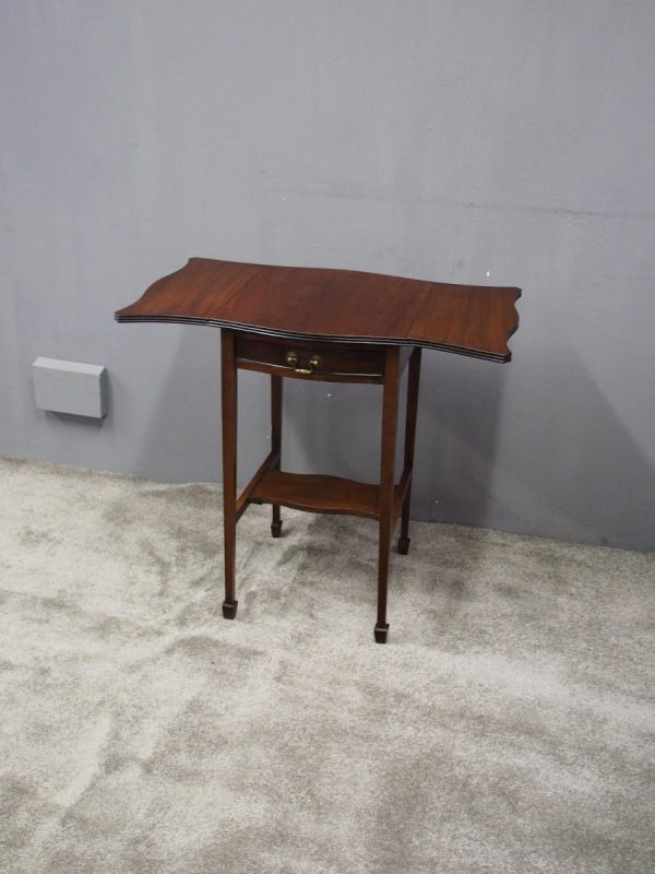 Circa 1900, Georgian style, neat-size mahogany pembroke table. The serpentine shaped top with fluted edges and shaped drop leaves over a bowfront drawer with brass swan neck handles. All supported on square tapering legs with a shaped under shelf and terminating in neat spade feet.