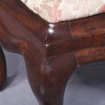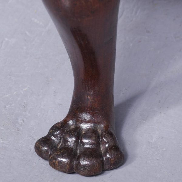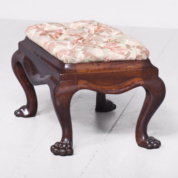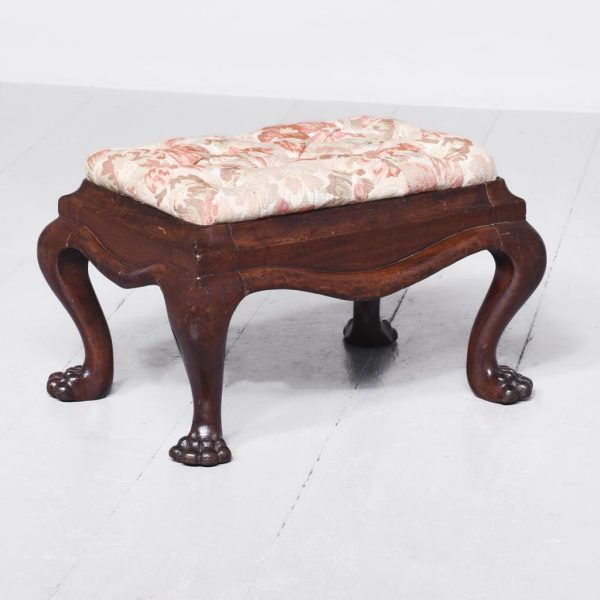 Circa 1900. George II style neat-sized carved mahogany footstool. With a detachable buttoned upholstered seat in a nice floral tapestry between moulded seat rails with shaped skirts. Supported on short cabriole legs with lion claw feet.