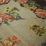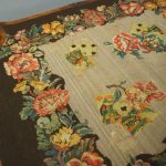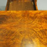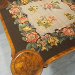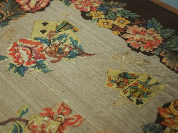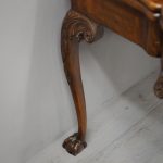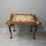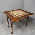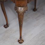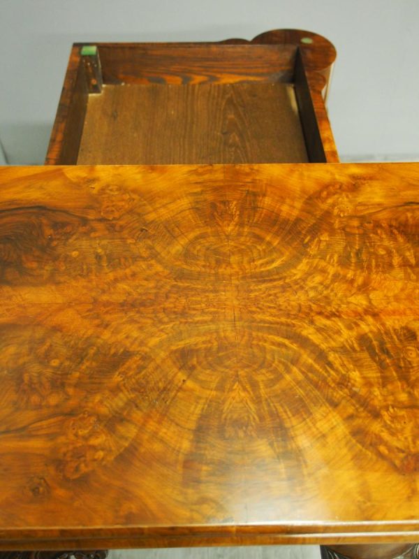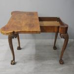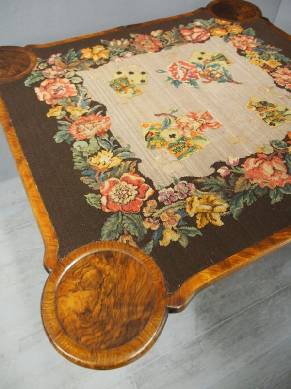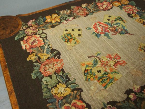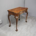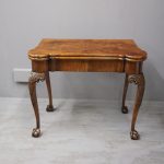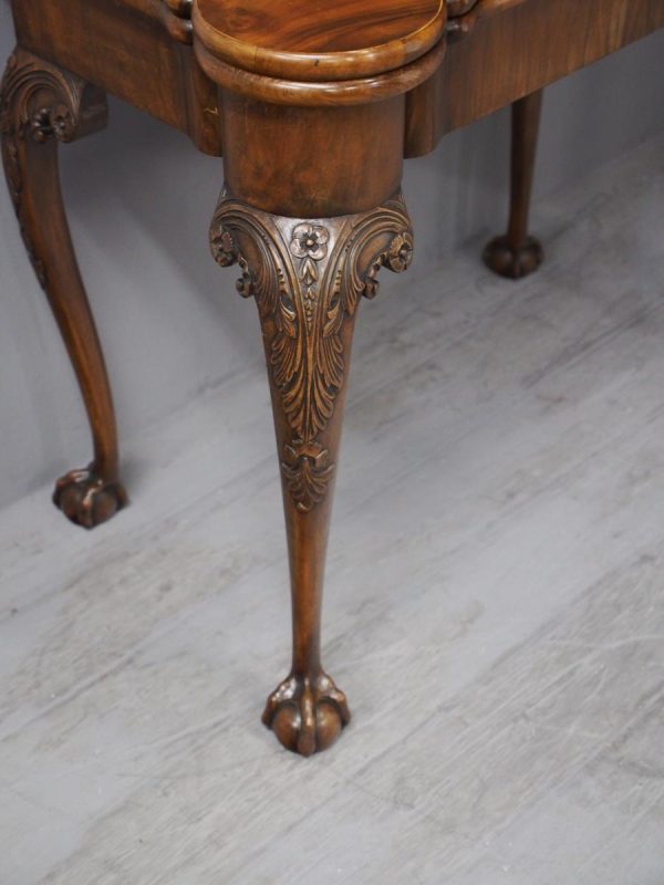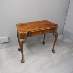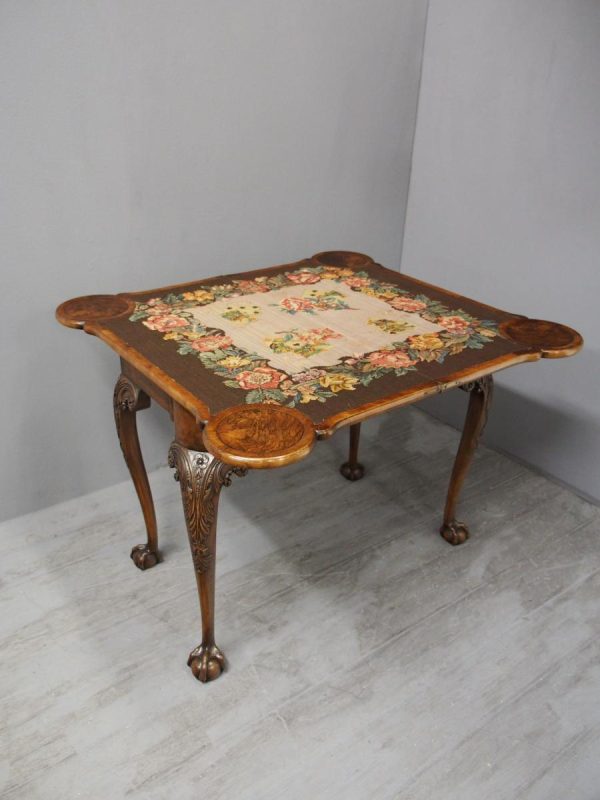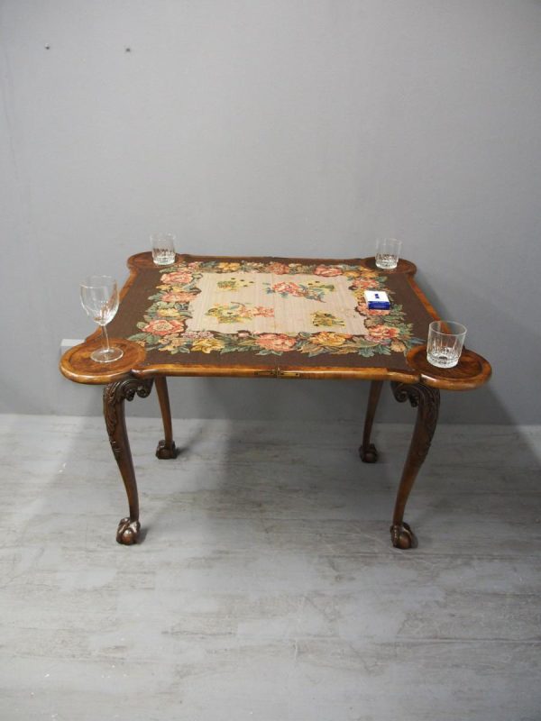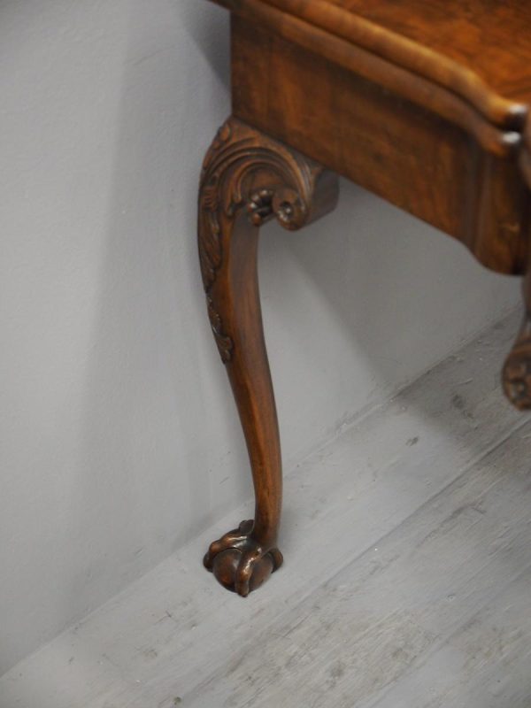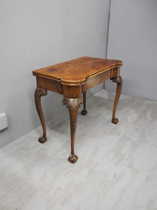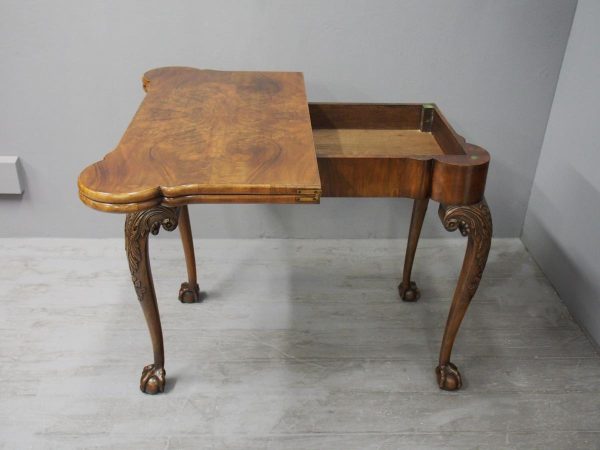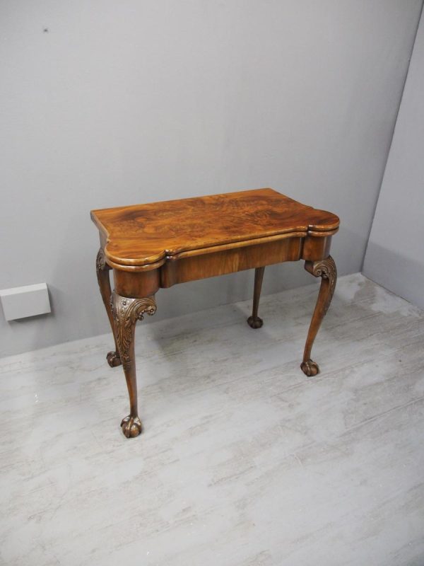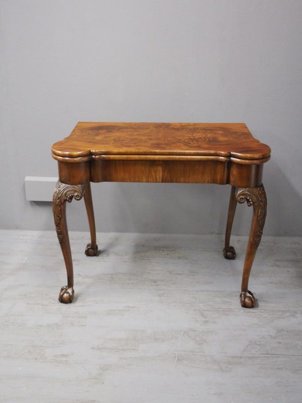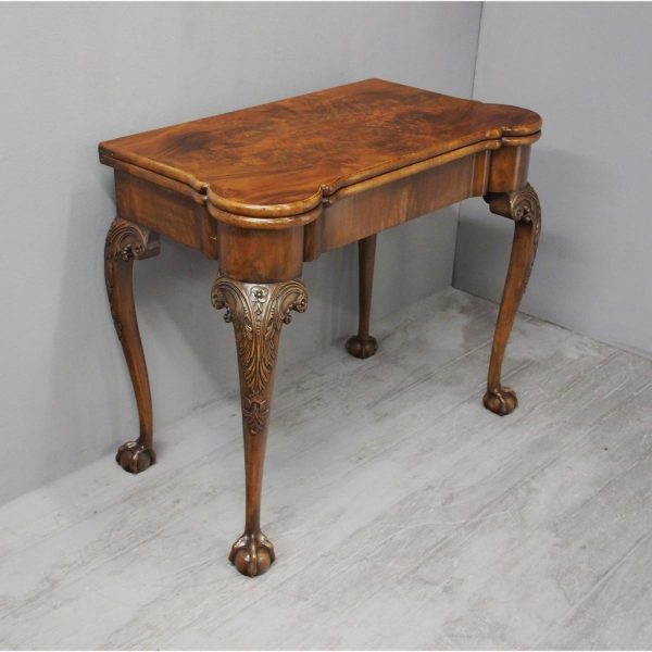 Circa 1900, Georgian style figured walnut fold-over games table. The serpentine-fronted top with outswept corners in quarter-veneered figured walnut revolves and opens to a banded interior with a floral and playing card decorated tapestry lining and figured walnut guinea wells at the corners. It has a cross banded frieze and is supported by deeply carved cabriole legs with acanthus and floral decorations to the knees, finishing on ball and claw feet.