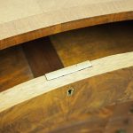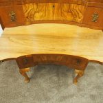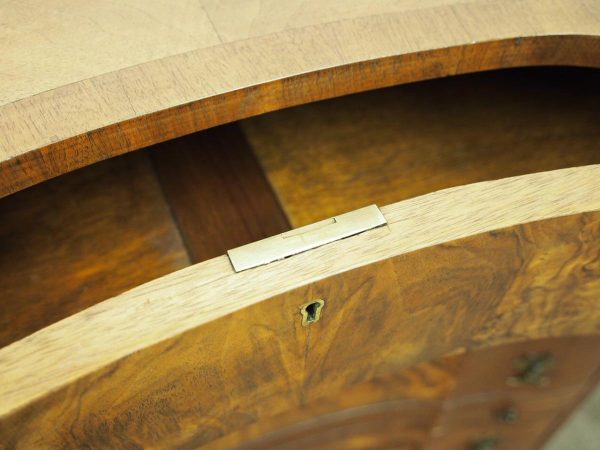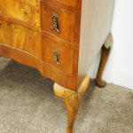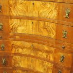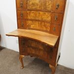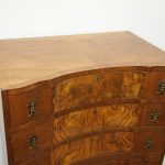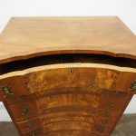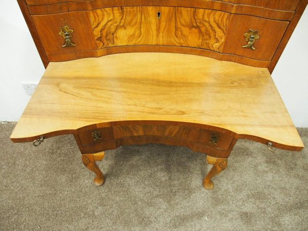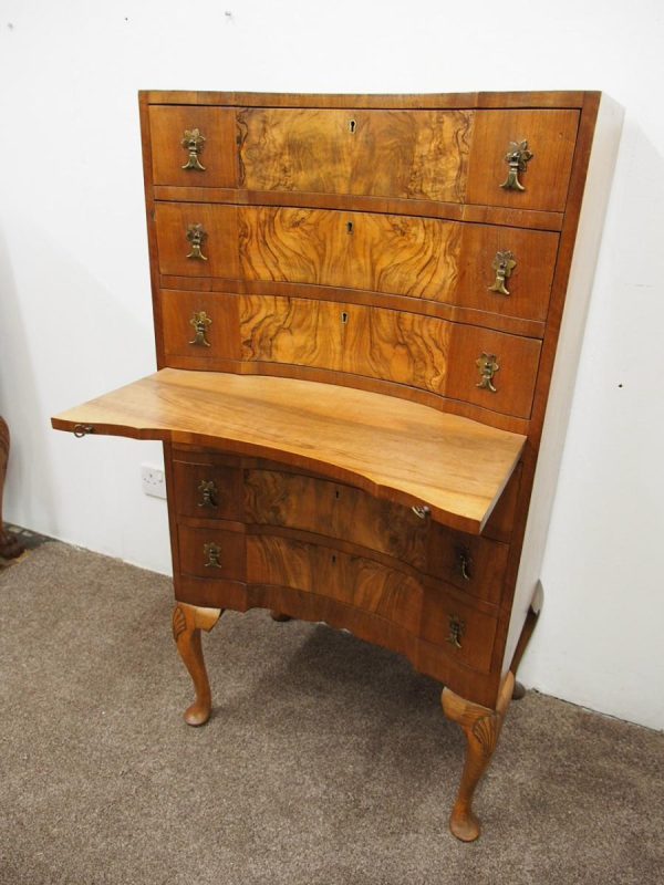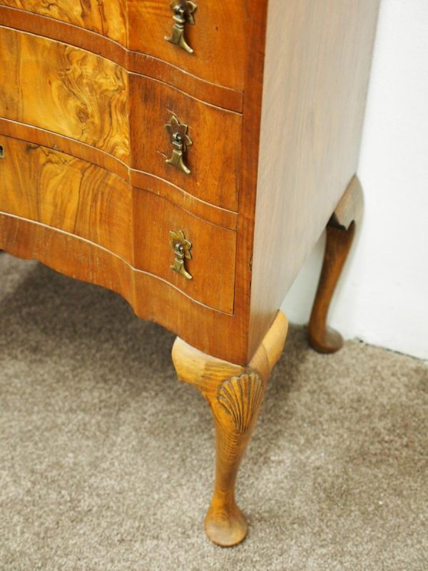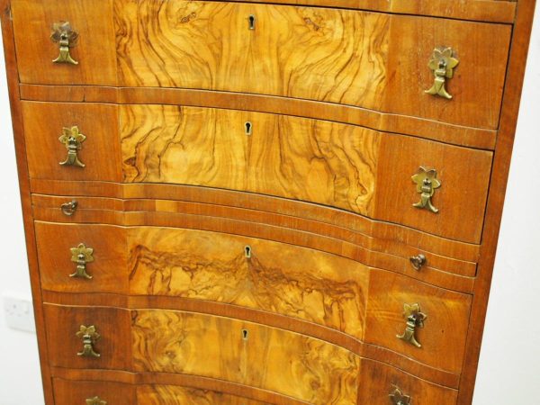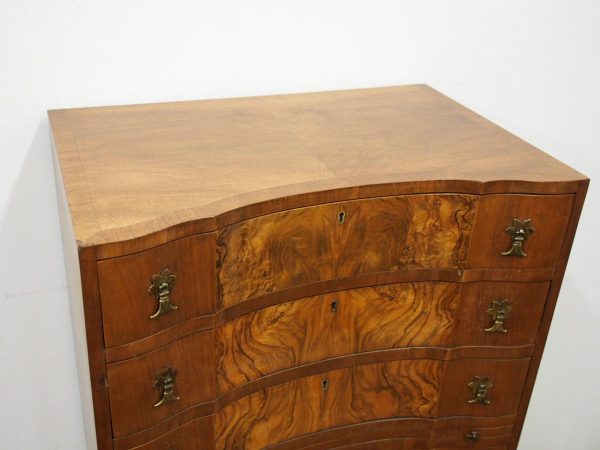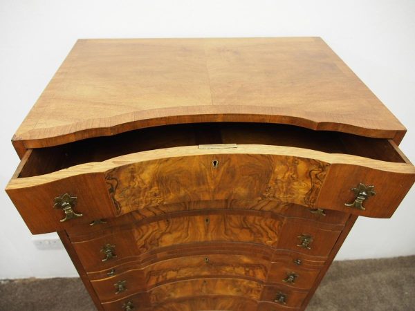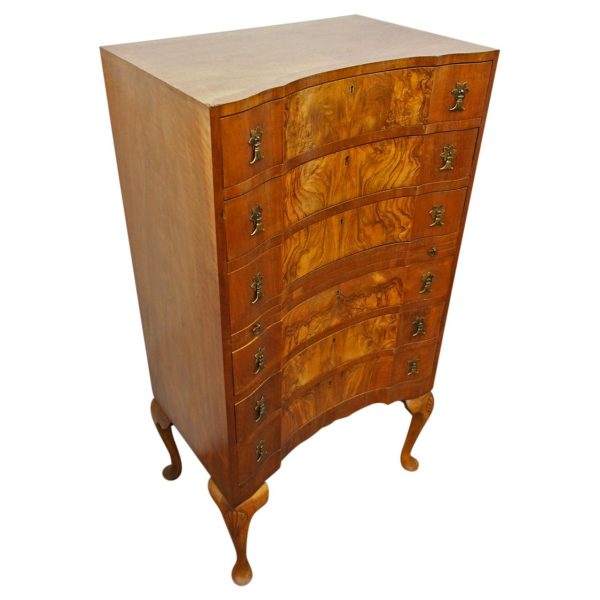 Circa 1930, Georgian-style, unusual concave-front, tall chest in figured walnut. The cross banded top over six graduated, alternating straight grained and figured walnut drawers, and a brushing slide. It stands on shell-carved cabriole supports with pad feet.