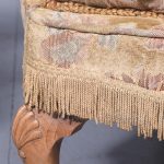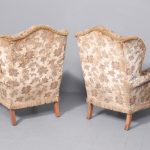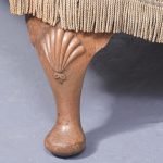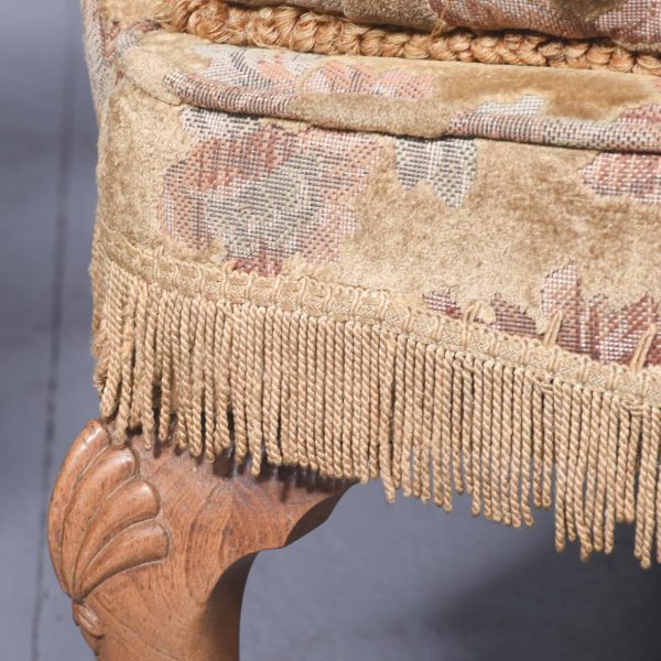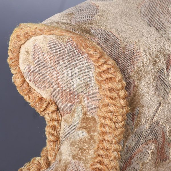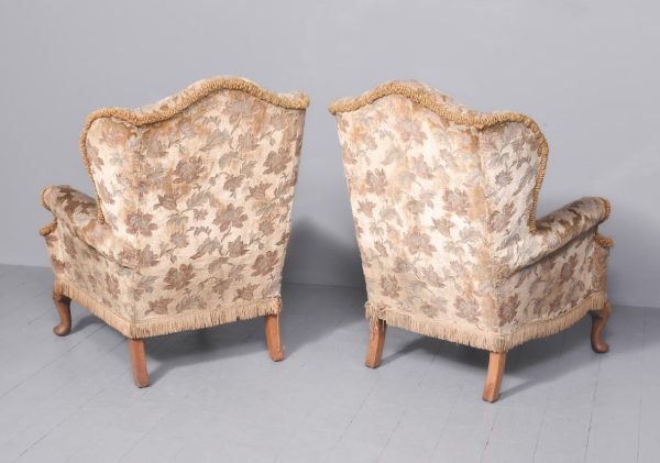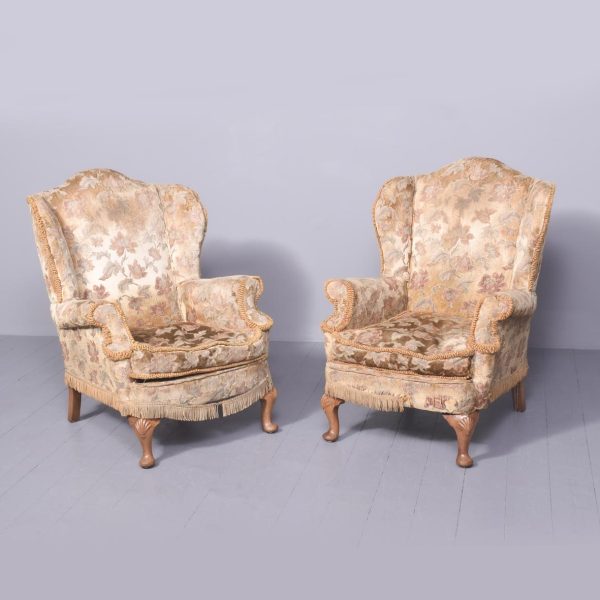 Circa 1920’s a quality pair of George I style wing chairs, the shaped chairs in cotton colour velour with a raised back with2 shaped wings, with all of the frame upholstered, with removable feather filled cushion, with simple slightly splayed back leg, the front legs with a short carved cabriole legs with shells on the top finishing on a simple elegant pad foot.