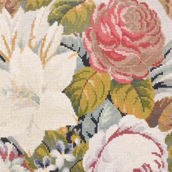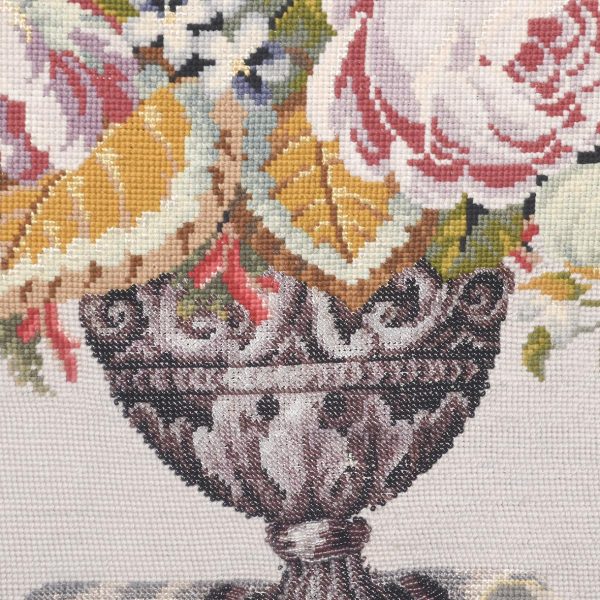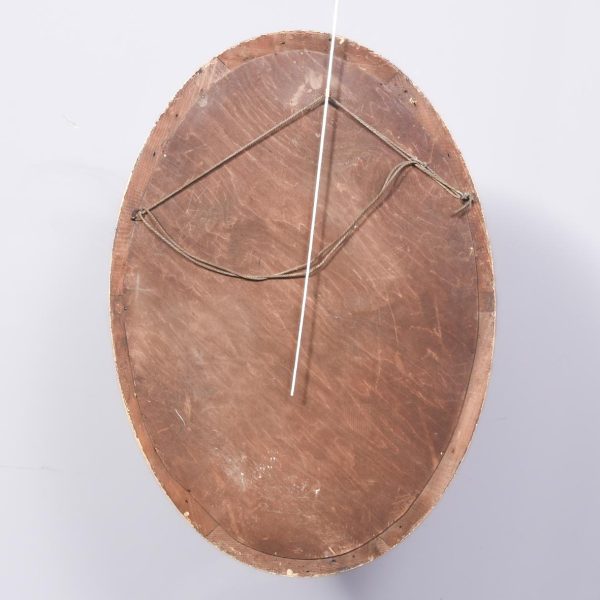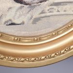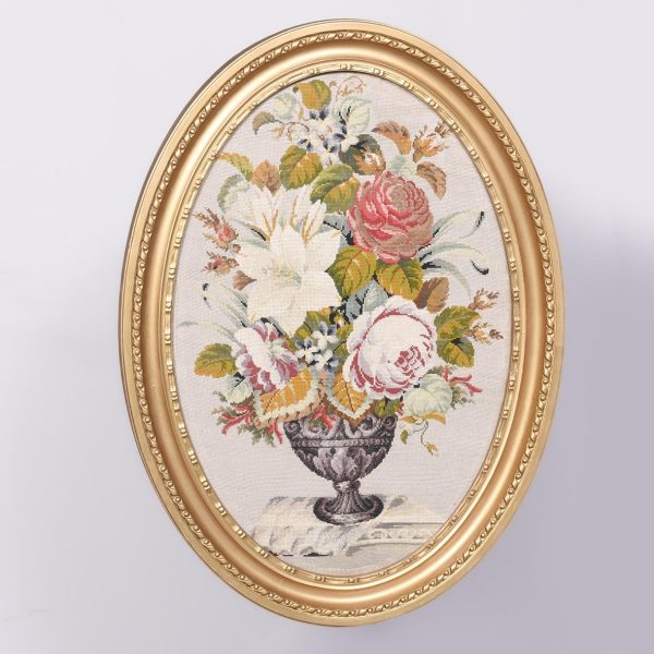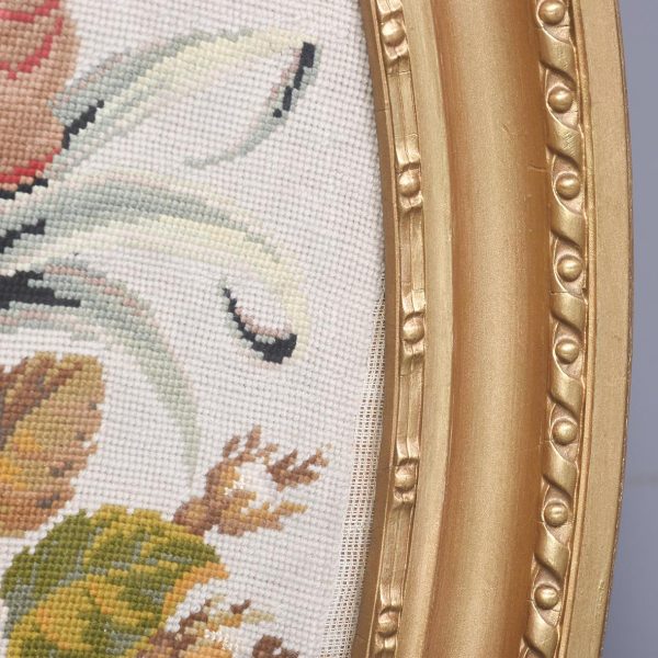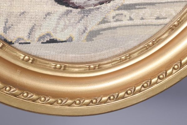 Circa 1860. A mid Victorian carved and gilded oval frame, with a fine egg and dart beading, flat surface, concave section and a carved and gilded moulding. The beveled edged glazed frame has a stylish needle-point and bead panel depicting flowers in a vase resting in a beaded blue coloured urn.