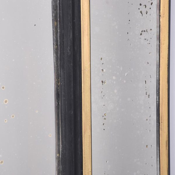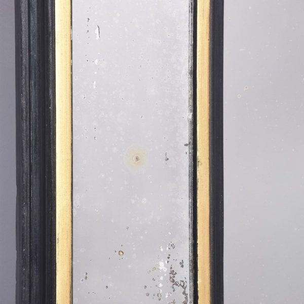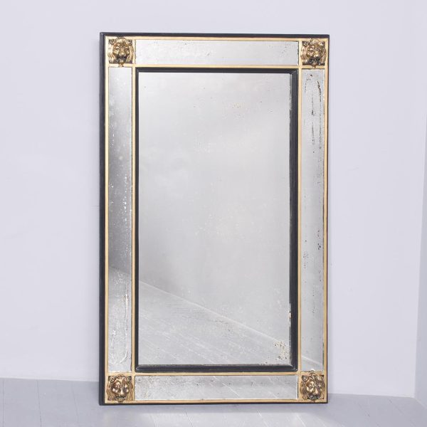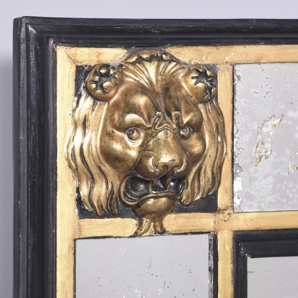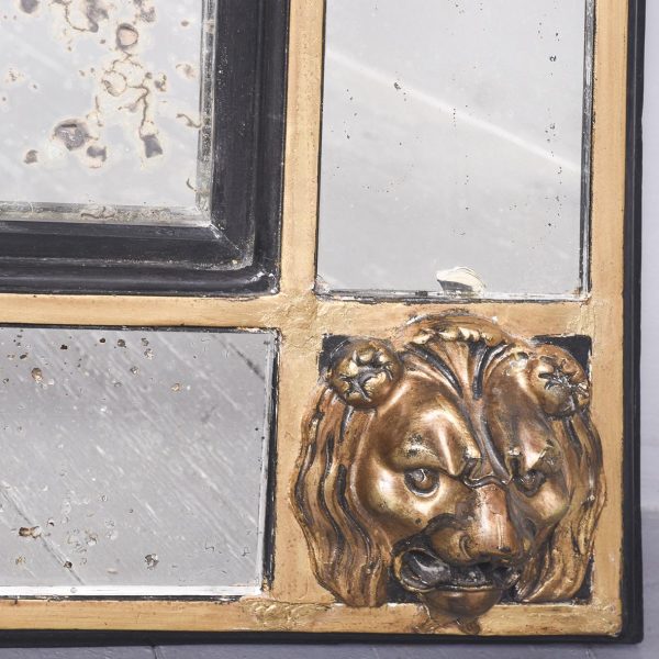 Circa 1880. A good George III style ebonized and gilded pier mirror. The large rectangular shaped mirror held in place by a stylish ebonized slip with four mirrors around it, in a gilded frame, with 4 large carved and gilded lion masks in each corner, with further mouldings to the outside, all the mirrors with slight foxing giving them a lovely mellow aged look.