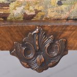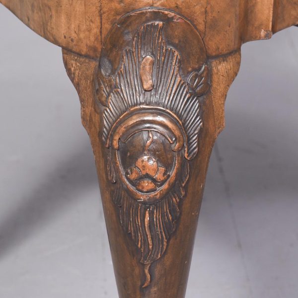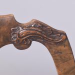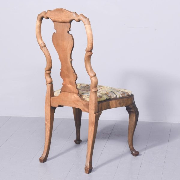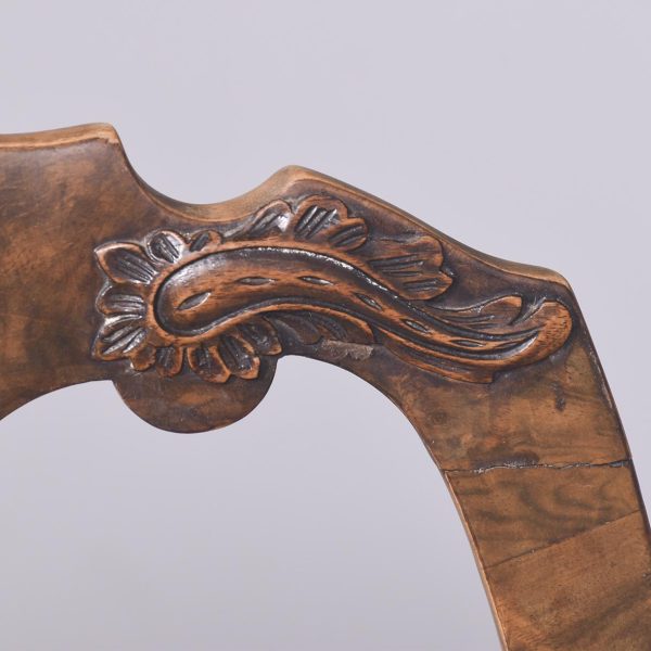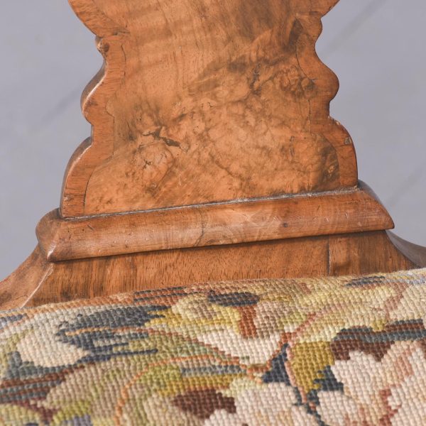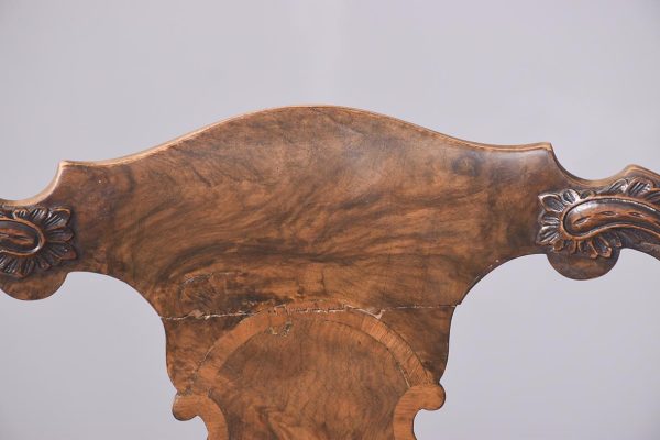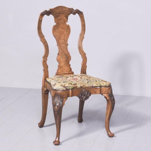 Circa 1900. An elegant walnut and burr walnut inlaid side chair in the manner of ‘Giles Grendey’. The shaped cresting rail with foliate carving on each side, with a crossbanded shaped and stylish curved walnut splat and uprights, and drop seat in needlepoint, The seat rail with a moulded top with foliate carving on the front, the seat rail following the form of the seat pad. Back legs are shaped and out swept, the front with cabriole legs with large foliate carving on the knees in the form of a cartouche, finishing on a turned pad foot.