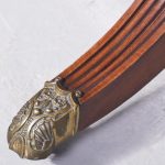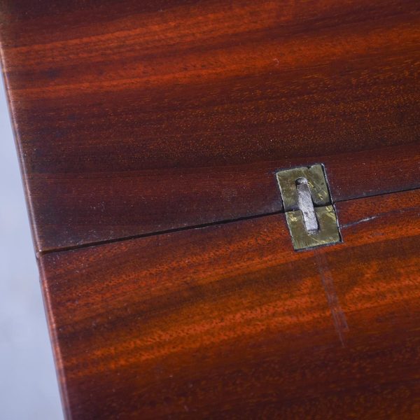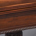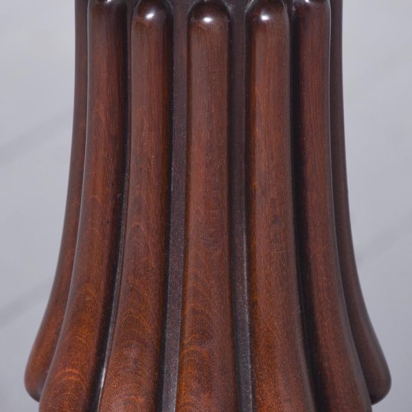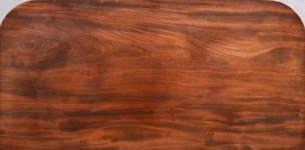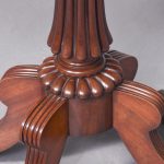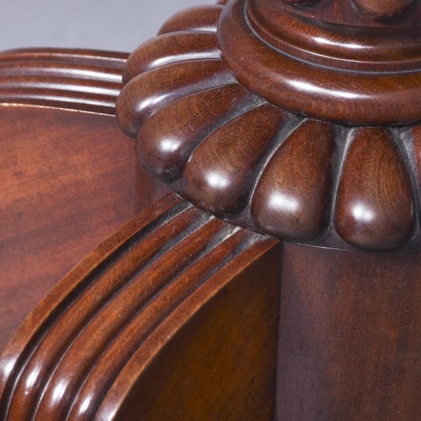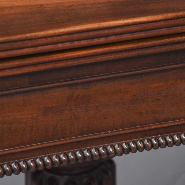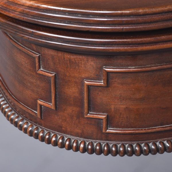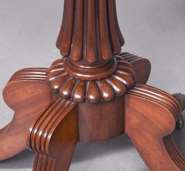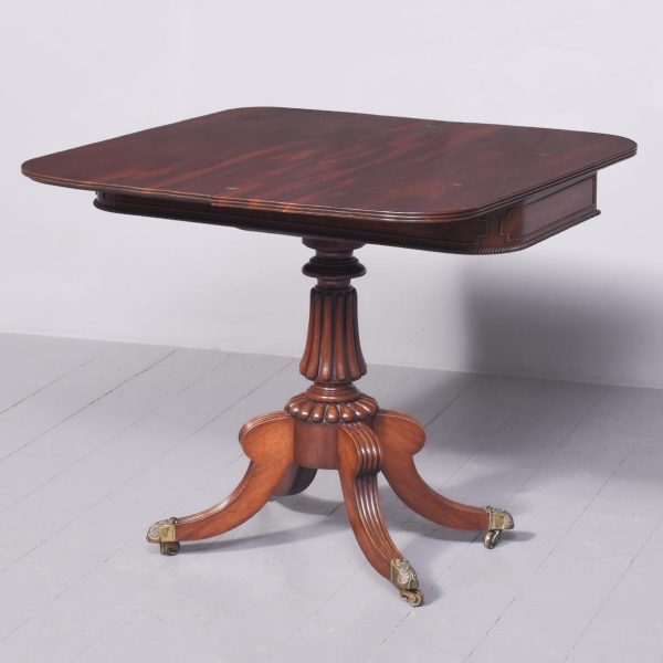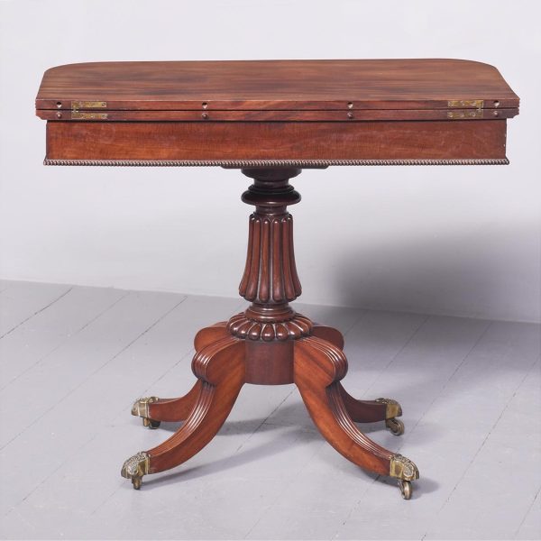 Circa 1820. Mahogany tea table in the manners of ‘Gillows of Lancaster’. The rounded rectangular fold-over top with reeded edge above a bead moulded frieze, raised on a reeded baluster support with a well carved collar, issuing three hipped reeded saber legs terminating on foliate cast caps with original castors beneath.