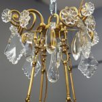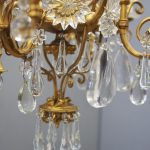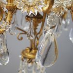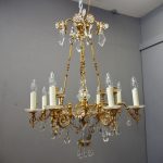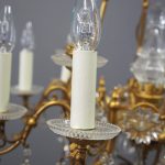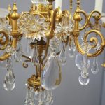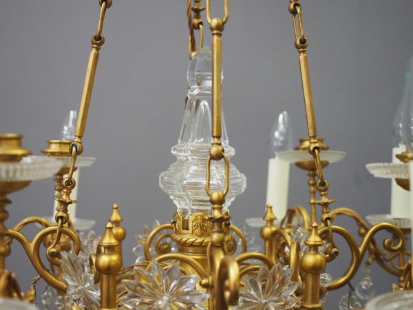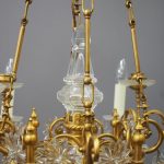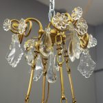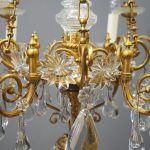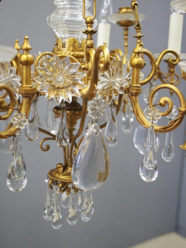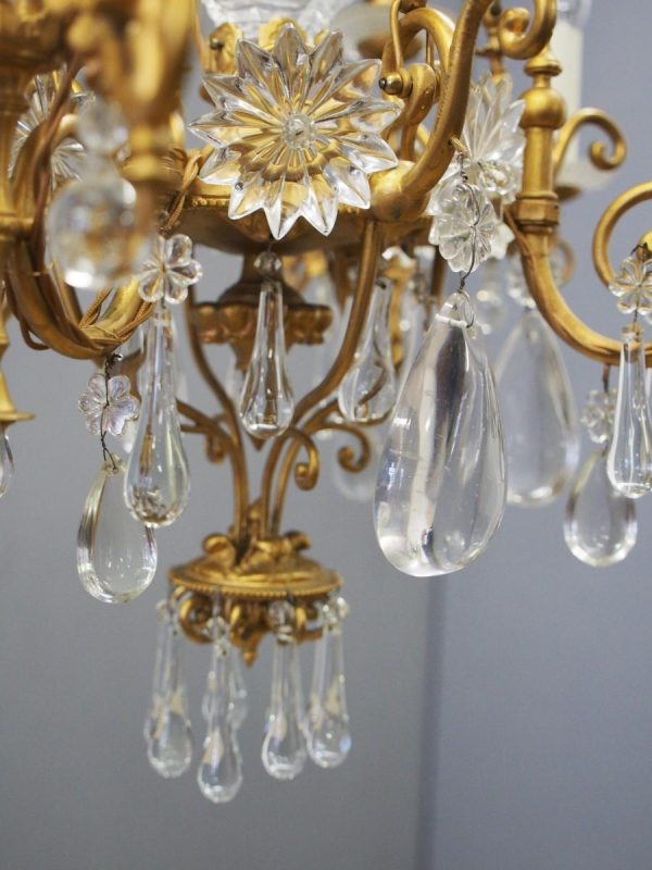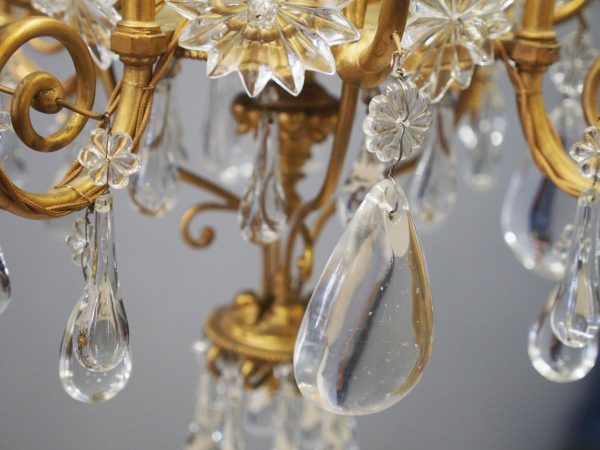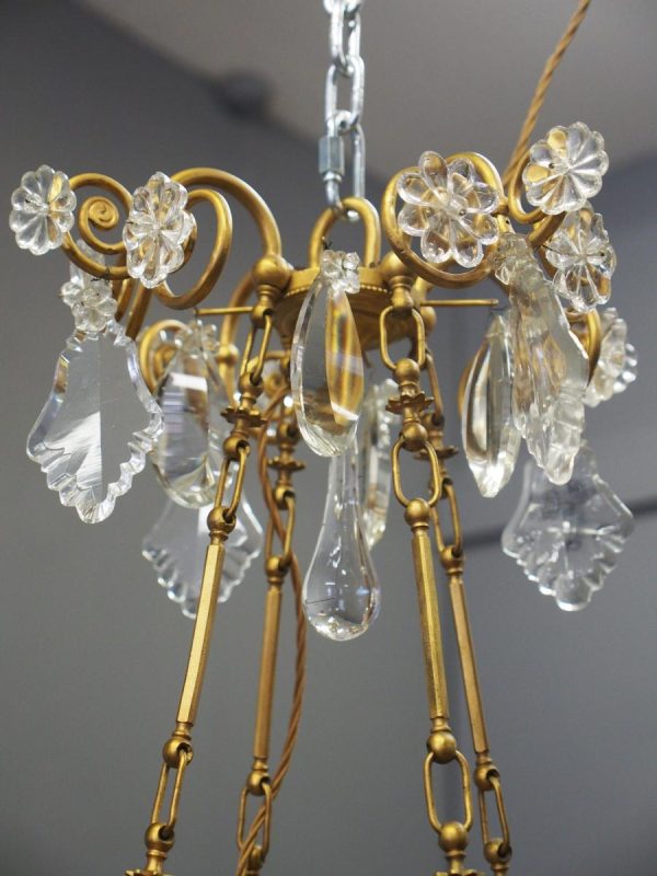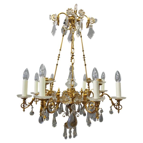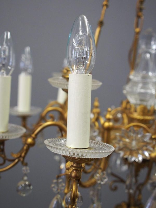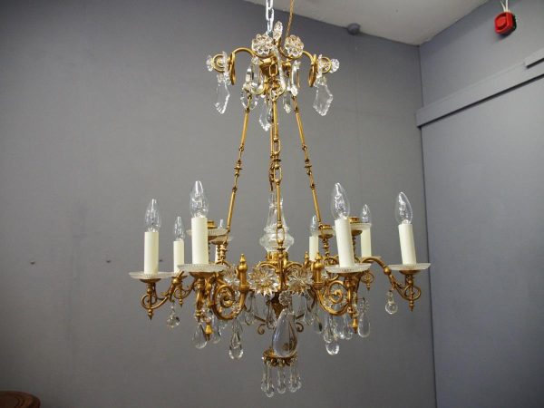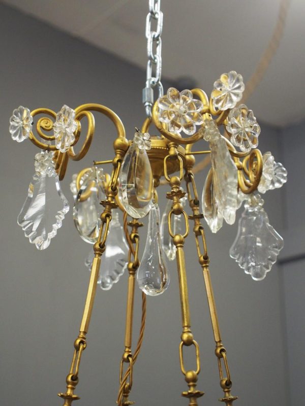 Circa 1930, unusual glass and gilded brass chandelier. The top with curled brass sections finished with glass flowers with brass studs and shaped glass, above a series of chains which connect to the rococo arms. With glass drip trays, faux double candle holders (with a few left un-wired), eight lamp holders (recently rewired) and hanging floral and droplet sections of glass.