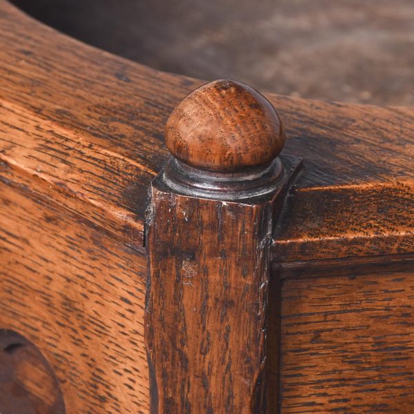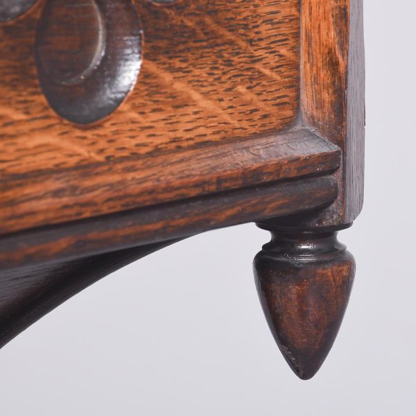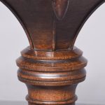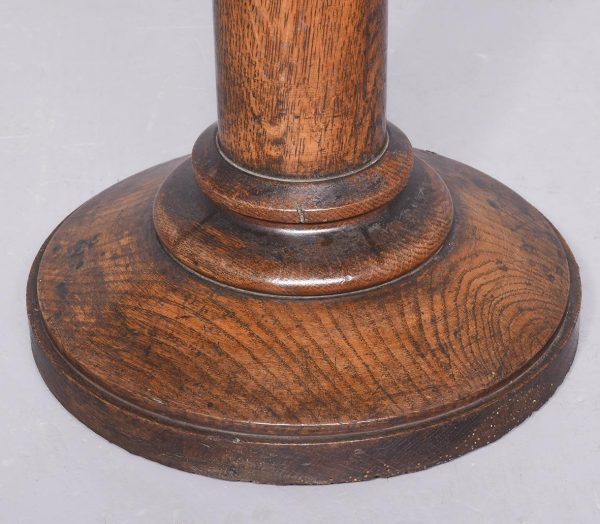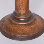 Circa 1860. A mid Victorian gothic style jardinière stand. The hexagonal shaped stand with a circular aperture in the center, and six elegant finials the deep sides with gothic tracery. The top rests on a coombed upright, resting on an oak turned ring turned column with a double collar, on a flared circular base.