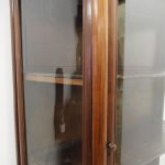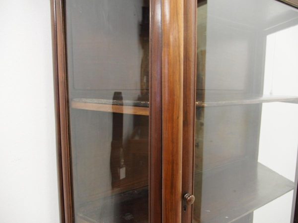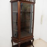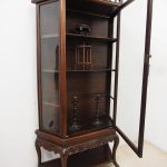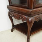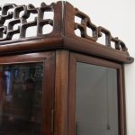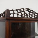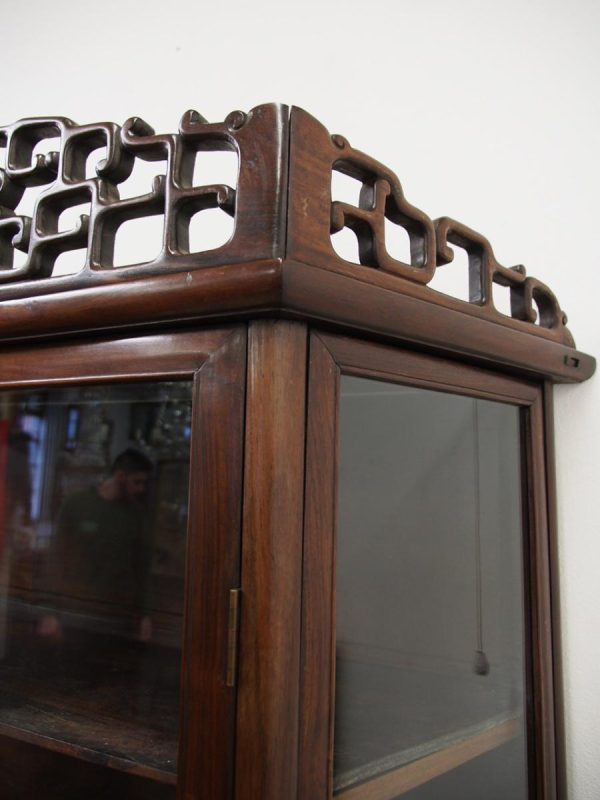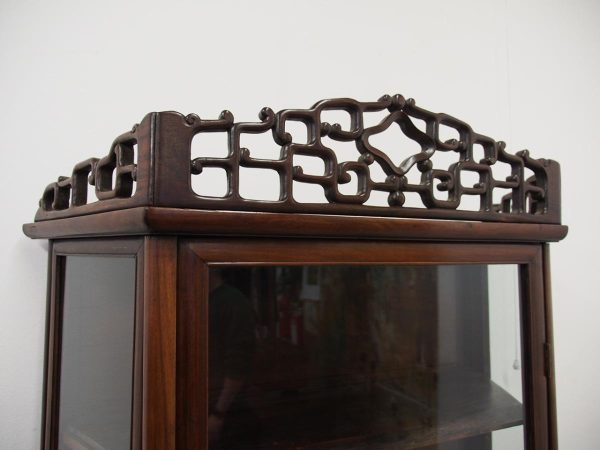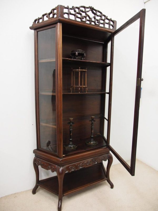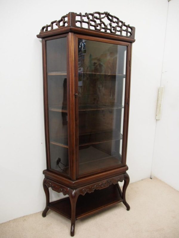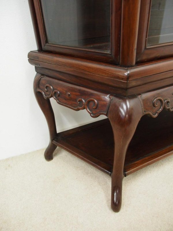 Circa 19th century, hardwood display cabinet. The top has a key pattern carved gallery above a central glazed door, flanked by glazed panel sides. With a shelved interior, it is all raised on a separate base with relief carved detailing and sits on cabriole supports joined by an under-tier.