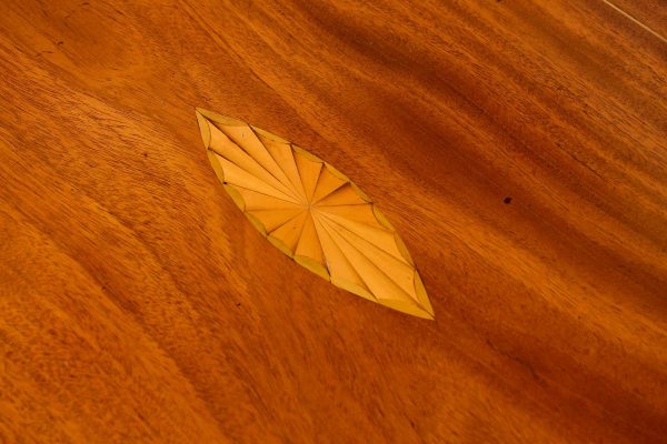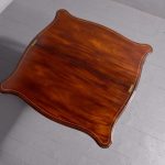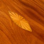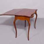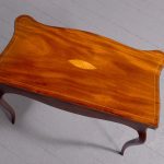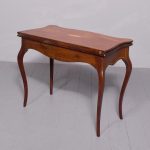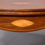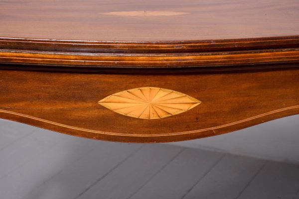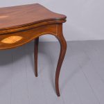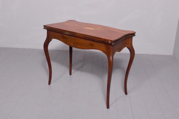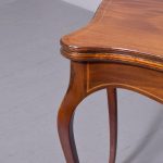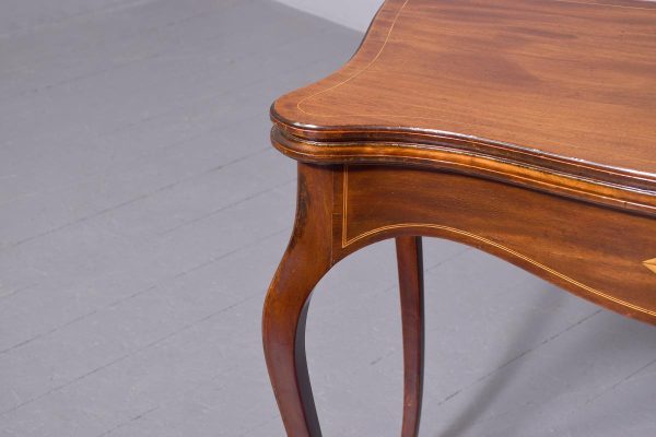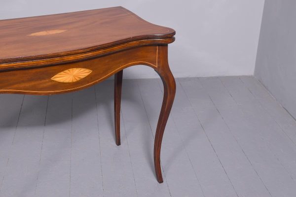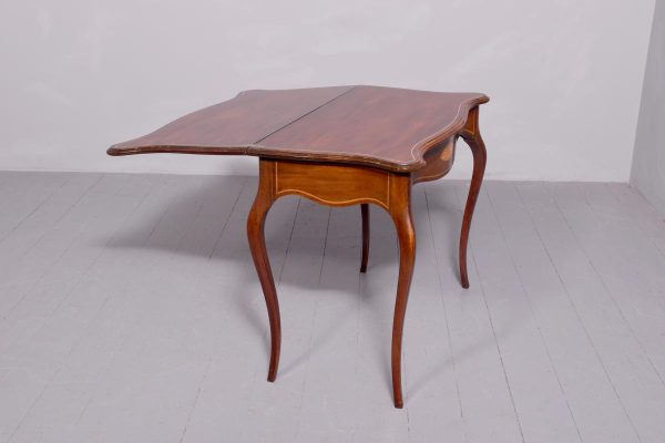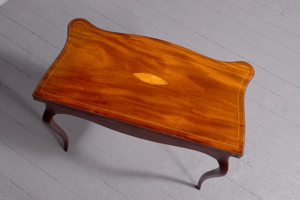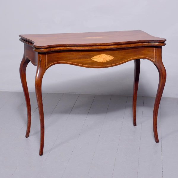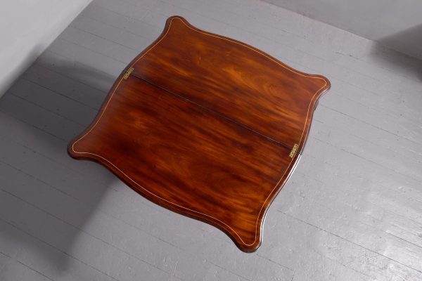 Circa 1900. A George III Hepplewhite style mahogany inlaid serpentine fronted fold over tea table, the hinged top with nice figuring with an elongated shell inlay and string inlay following the form of the top, when opened the top reveal a polished interior with similar inlay, with a small aperture beneath for storing cards, with a shaped frieze with a shell similar to the top and string inlay, all resting on four elegant cabriole legs