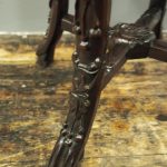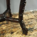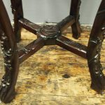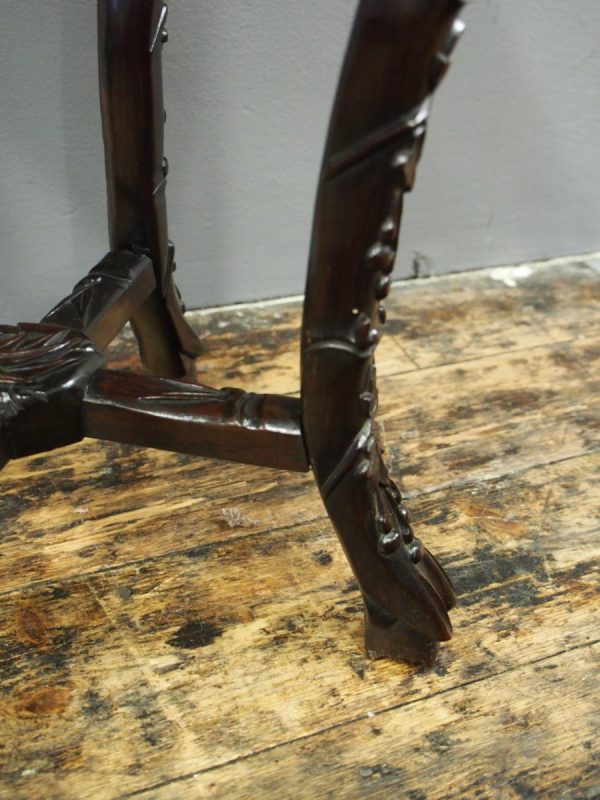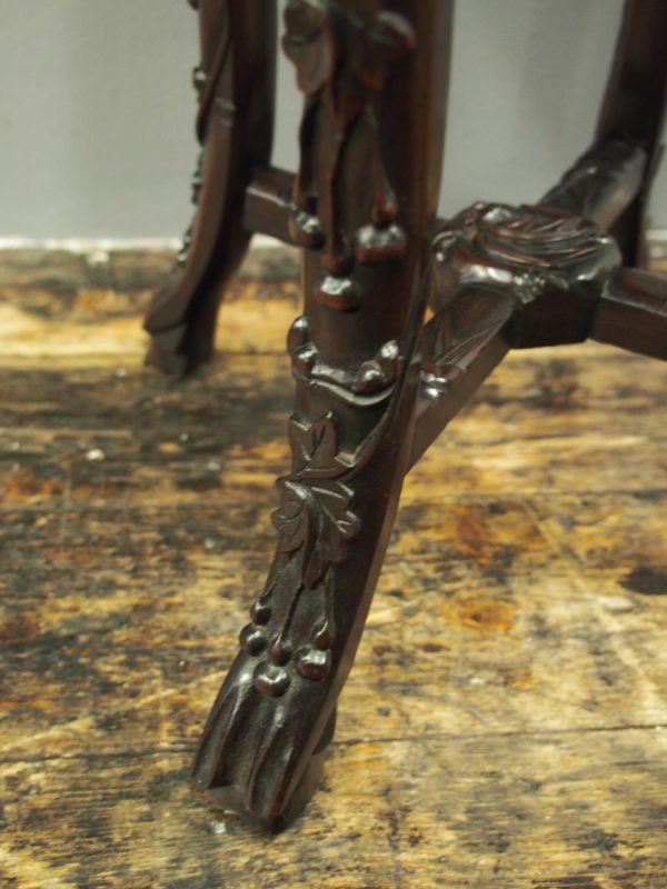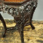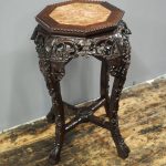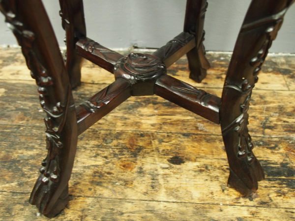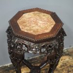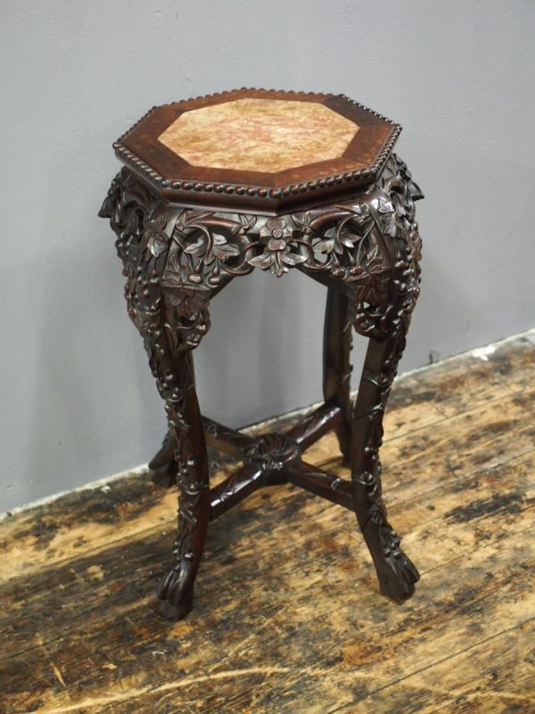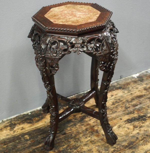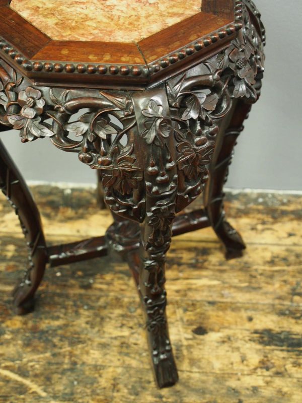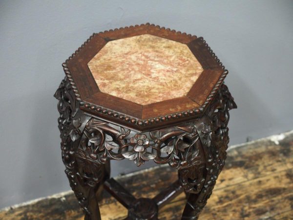 Circa 1890, Huanghuali Ming dynasty, octagonal shaped marble top plant stand. The pink variegated marble has a beaded fore-edge and beneath is a flared apron with cherry blossom and faux bamboo carving, which continues to the legs. There is a faux bamboo cruciform stretcher to the base, finishing on animalistic feet.