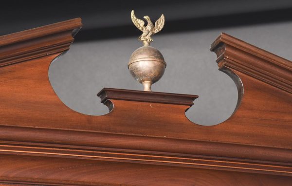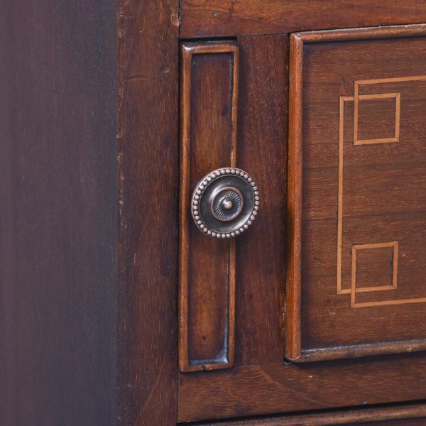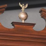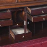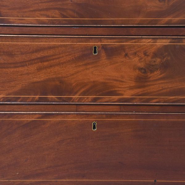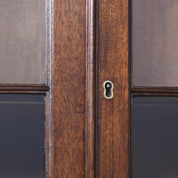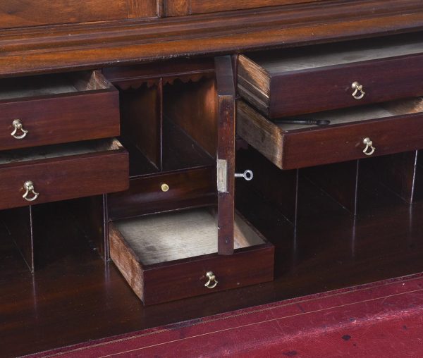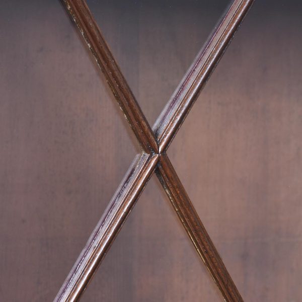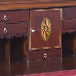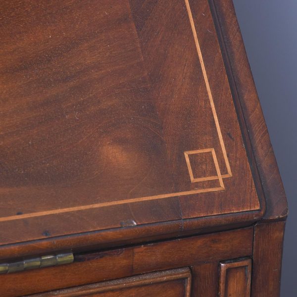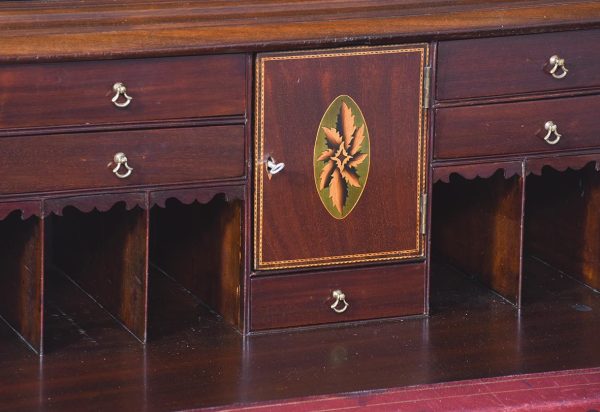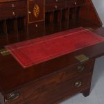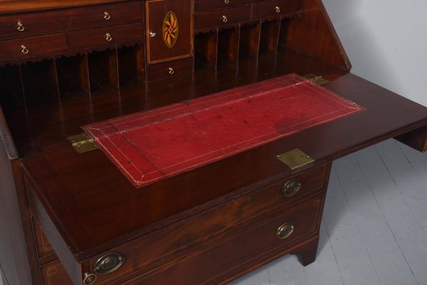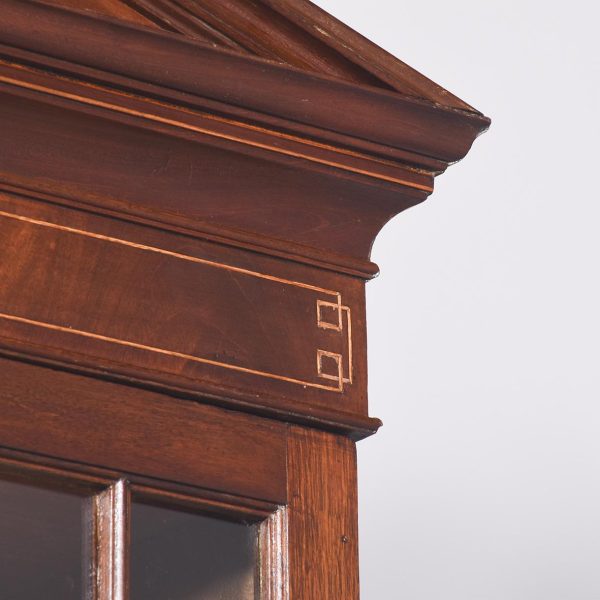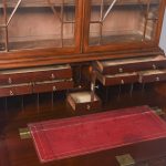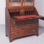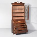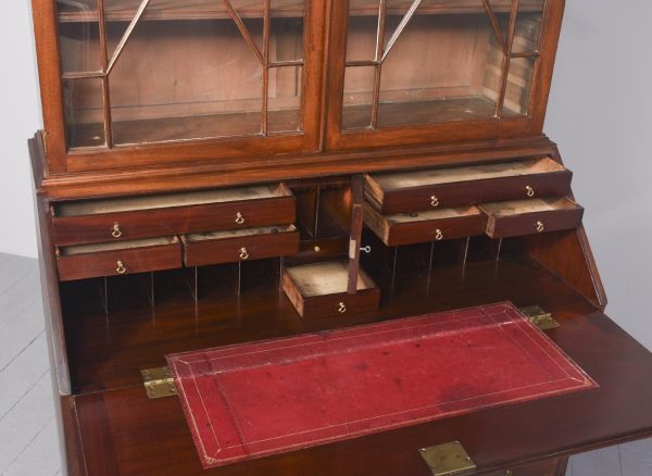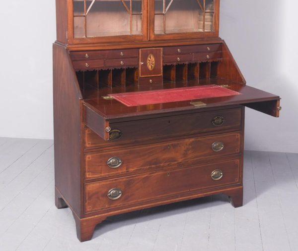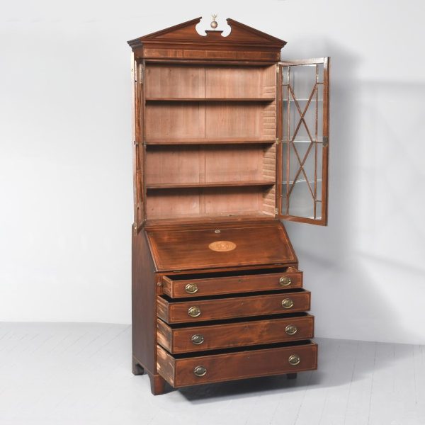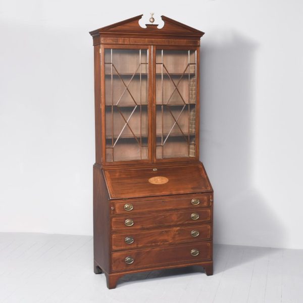 Circa 1790. Impressive George III inlaid mahogany bureau bookcase. Surmounted by a broken arch pediment over a moulded cornice and inlaid frieze, the twin astragal glazed doors with original glazing open to three adjustable bookshelves. The bureau with an inlaid flap opening to outstanding interior with inlaid doors, pigeon holes and a secret drawer over 4 graduated inlaid drawers with oval brass handles, all supported on a moulded base and bracket feet. Was £4500 now £3950.