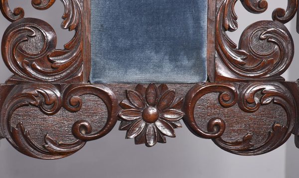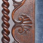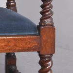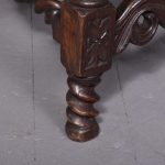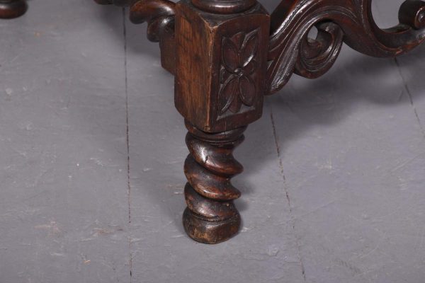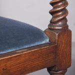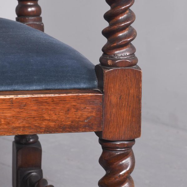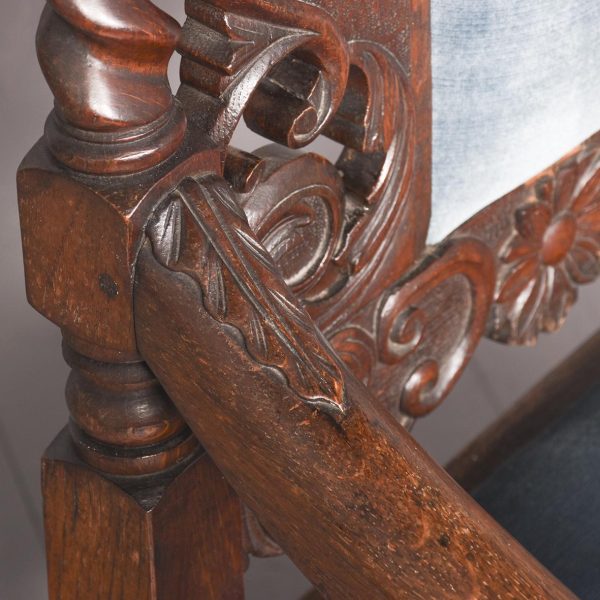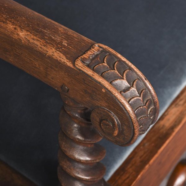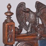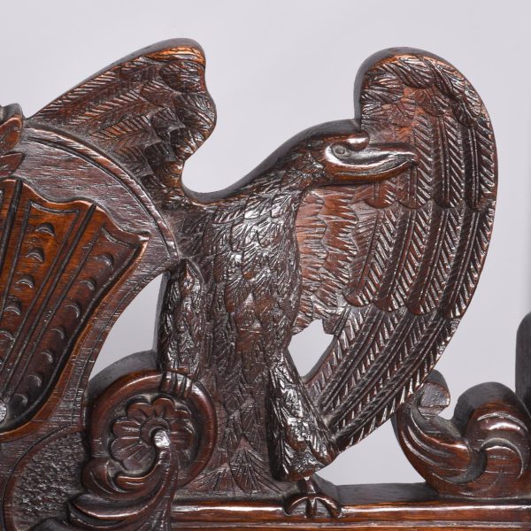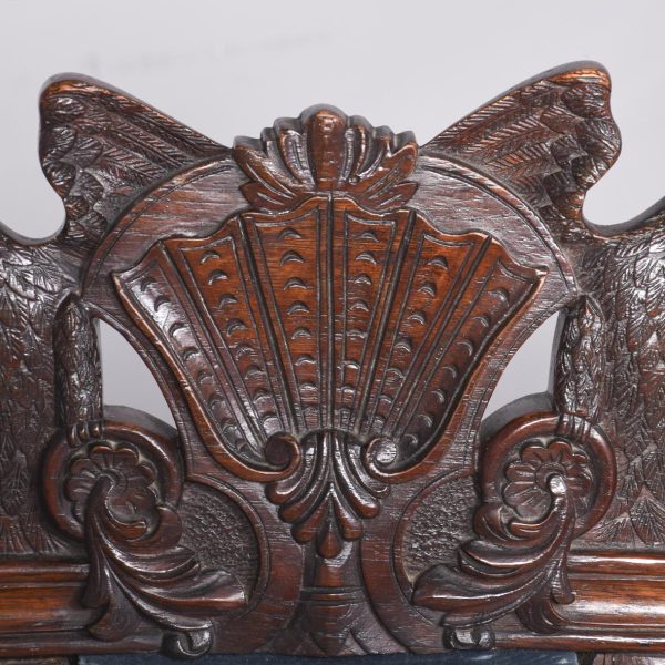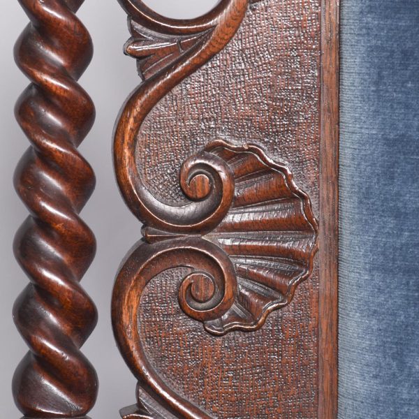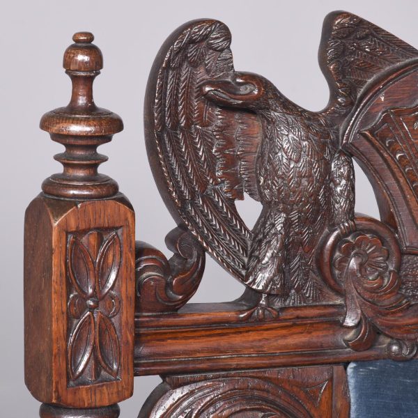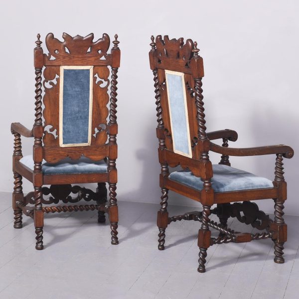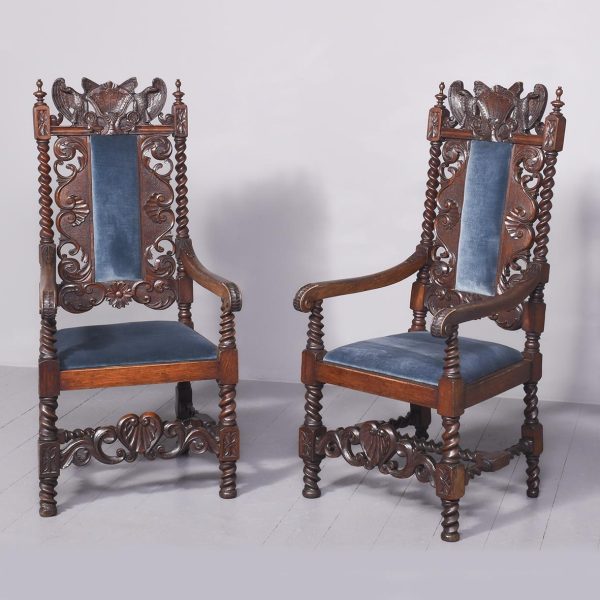 Circa 1860 Impressive pair of large carved oak throne or hall chairs. The part upholstered backs surmounted by finely carved pairs of eagles flanking a crest and supported on barley twist and open foliate carved backs. The shaped arms on barley twist supports above lift-out seats and supported on foliate carved and barley twist legs and stretchers. In excellent condition.