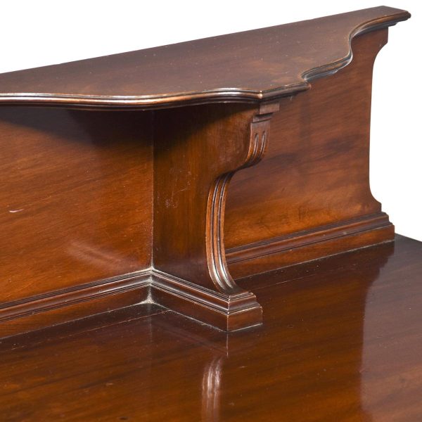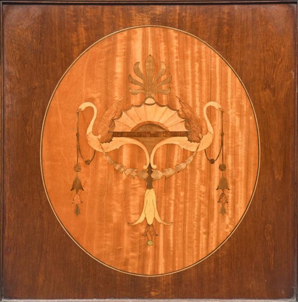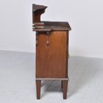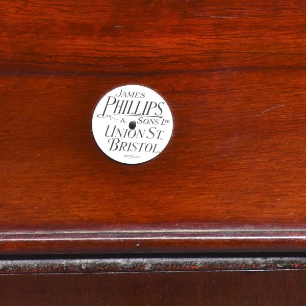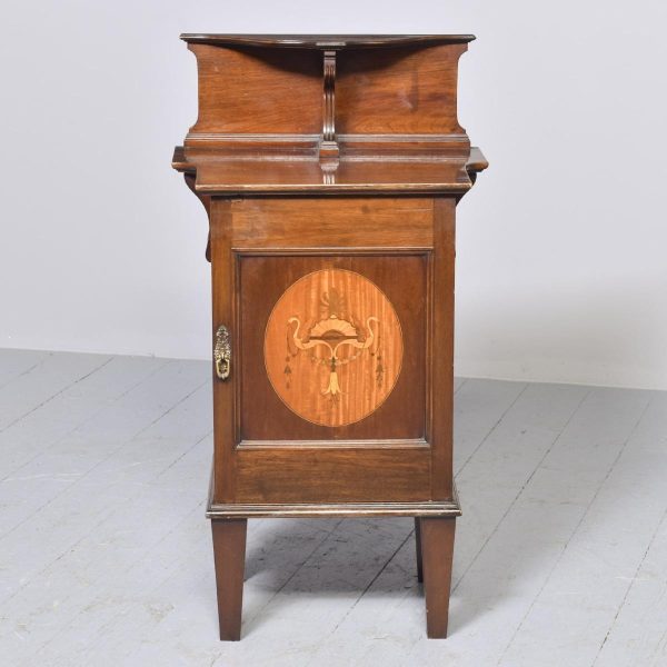 Circa 1900.  Inlaid mahogany Art Nouveau bedside cabinet. The shaped top with an unusual raised back supported by a ribbed shaped solid bracket.  The full-length door with a large inlaid oval panel opening to a single shelf and a maker’s label “James Philip and Sons, Union Street Bristol.”  The base with a moulding which continues around the sides.  The cabinet stands on four short square tapering legs.