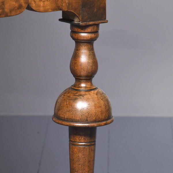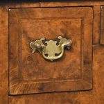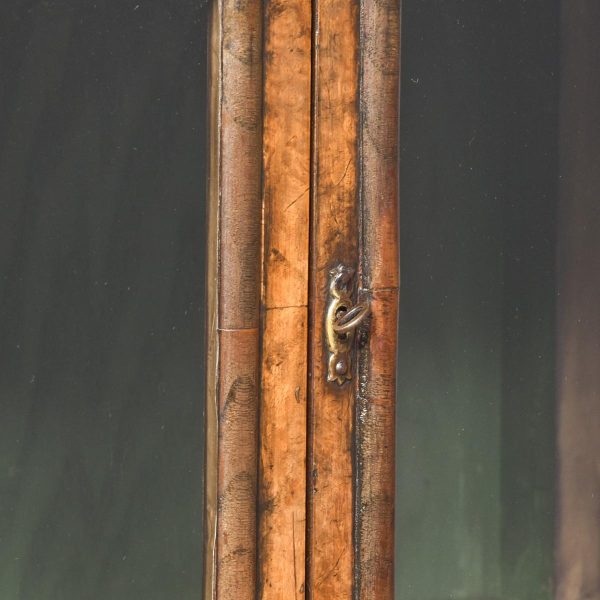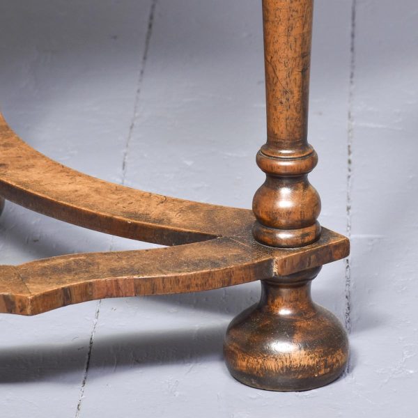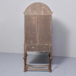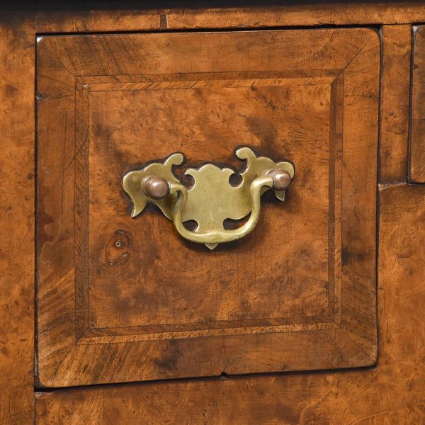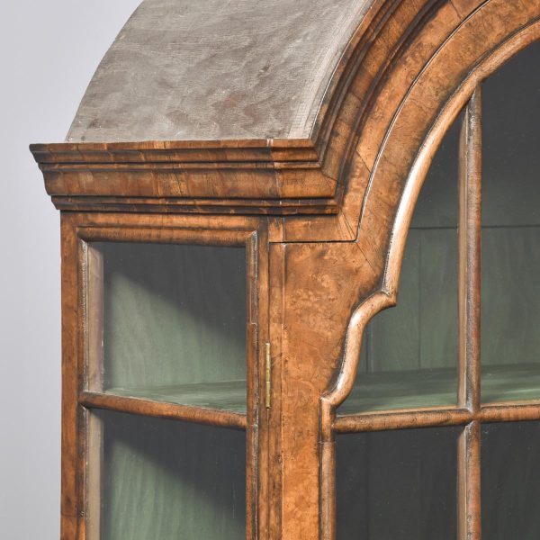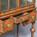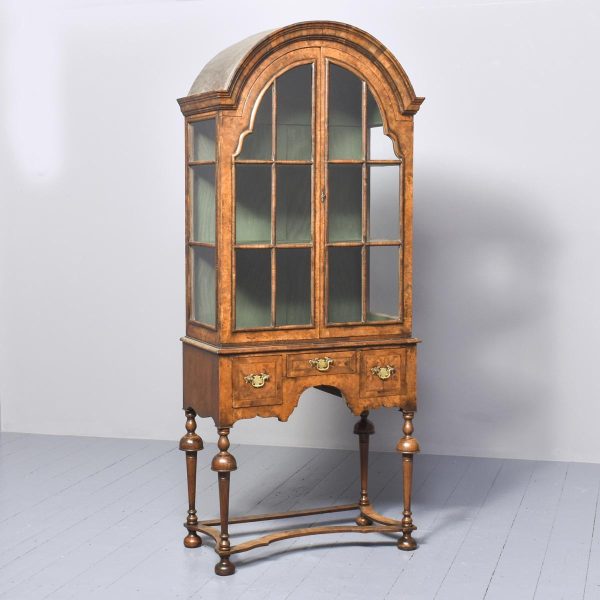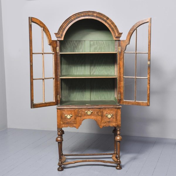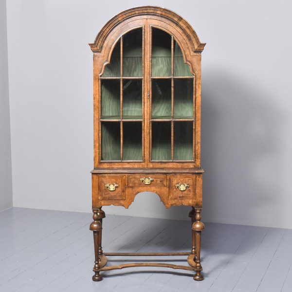Circa 1880. William and Mary style inlaid burr walnut bookcase on stand. The arched top with moulded cornice over two shaped doors with beaded astragals, opening to a shelved interior with walnut fronts. The separate base with a moulded rim and cross banding, and herein inlaid frieze drawers with oak liners and fretted brass handles, all supported on turned supports above shaped stretchers and neat bun feet. Lovely colour and patina and in excellent condition.