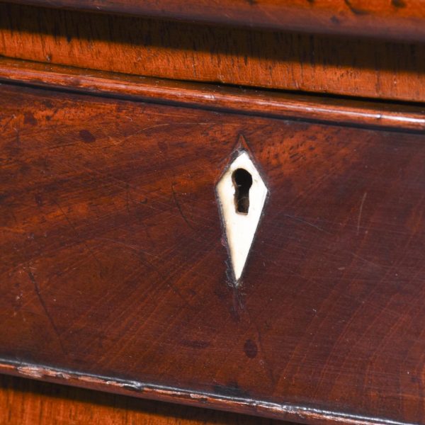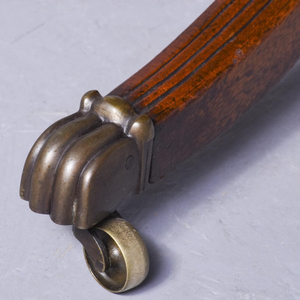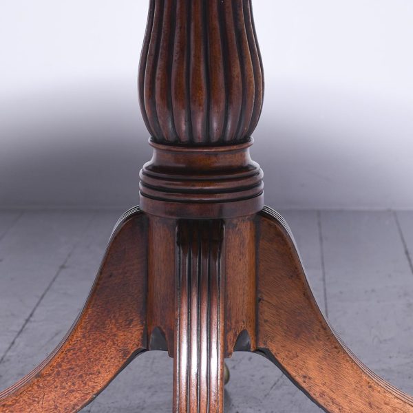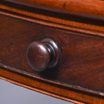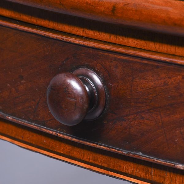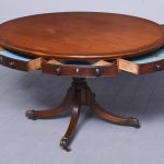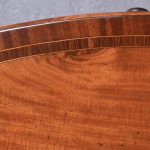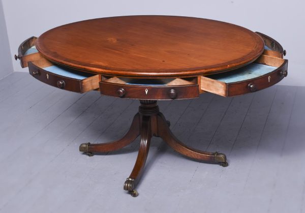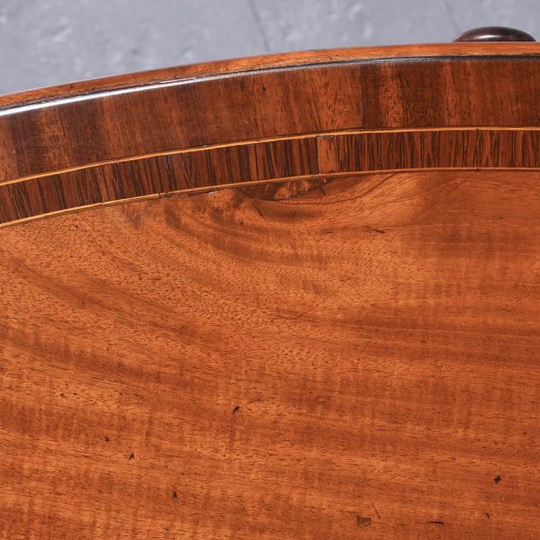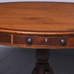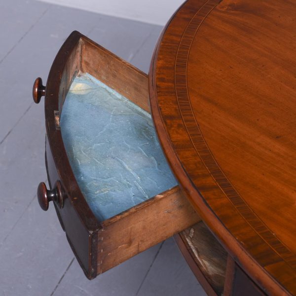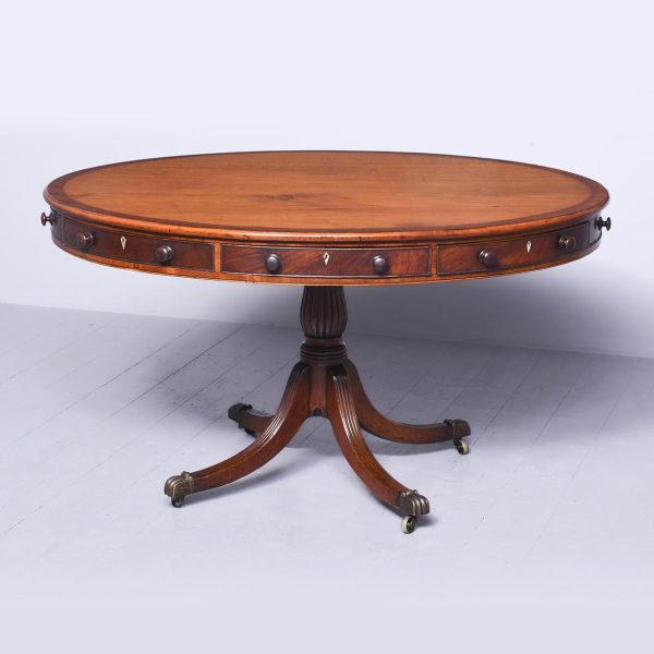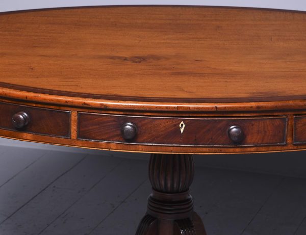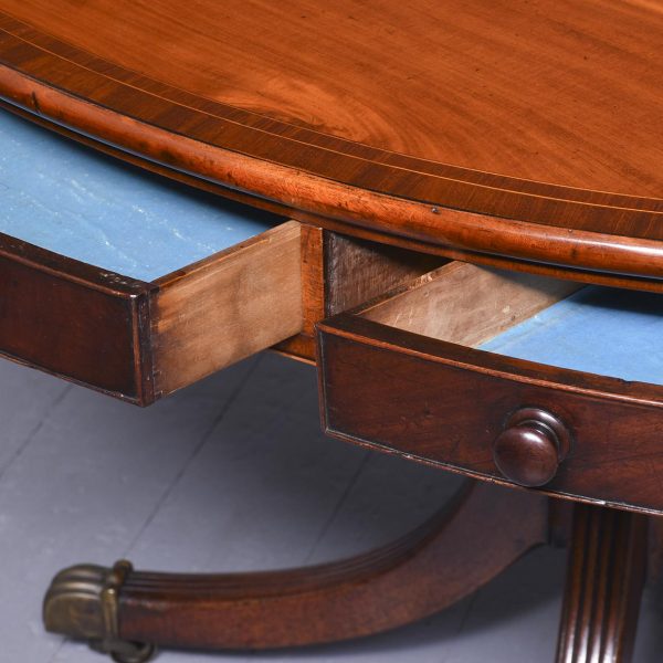 Circa 1810. Inlaid mahogany Regency free-standing oval library table. The oval top in a single piece of figured Spanish mahogany with peripheral kingwood and boxwood inlay and crossbanding above complete row of frieze drawers with original finely turned knobs, mother of pearl escutcheons. Supported on a fluted baluster stem supported on four outswept fluted legs with brass caps and castors. In exceptional condition.