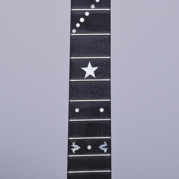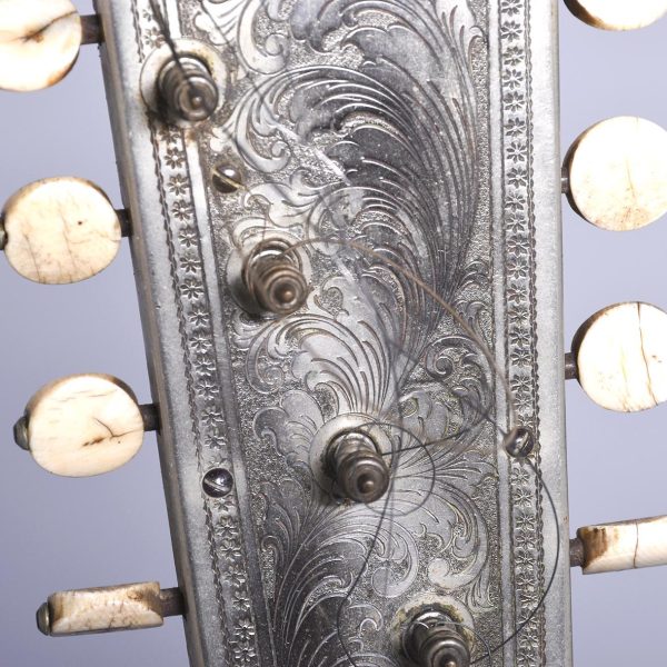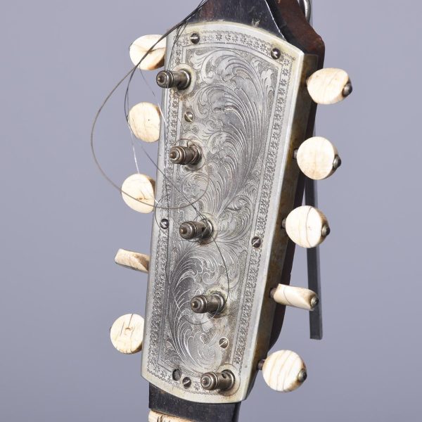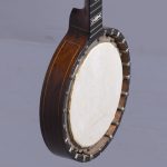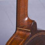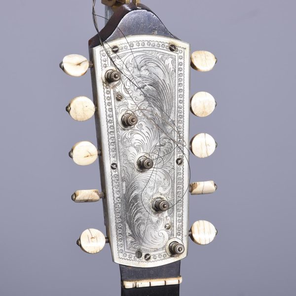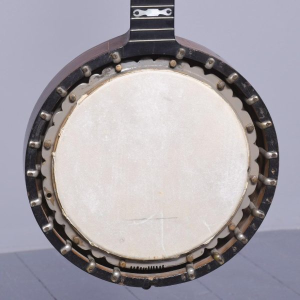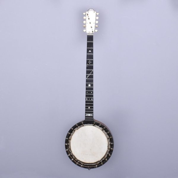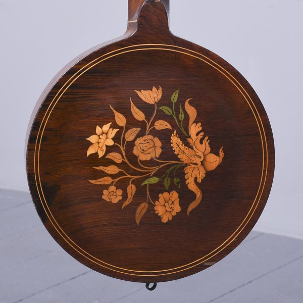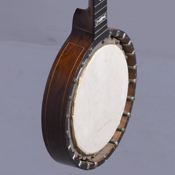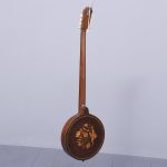 Circa 1900. Unusual and stylish rosewood inlaid ten string banjo. The circular head in rosewood with string inlay with floral marquetry on the back, on the fingerboard there is a mixture of mother of pearl and metal inlays. The headstock is engraved with polished steel with eight ivory adjustable turning pegs. (The ivory is registered).