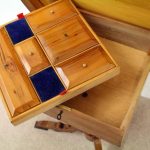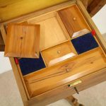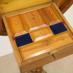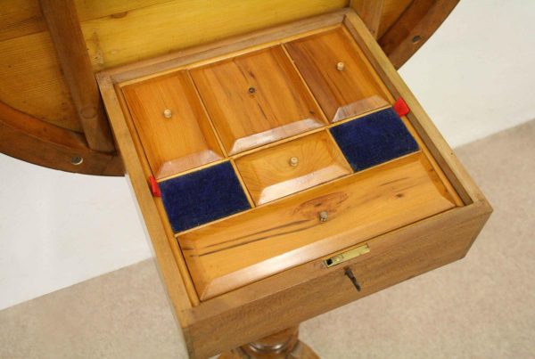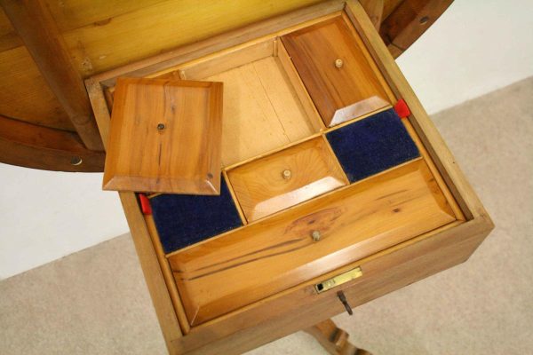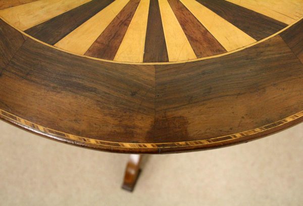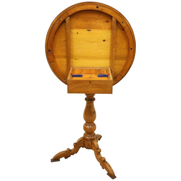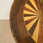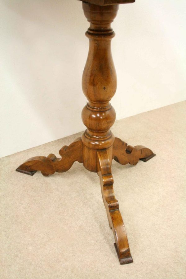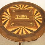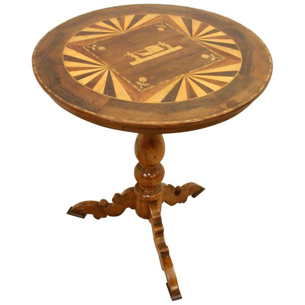 Circa 1880, very unusual Italian snap top occasional table. The circular top is crossbanded in various woods and inlays. In the centre is a motif of two gentleman carrying a lady in a Sedan style chair. The top is hinged, and at the back is a section with various compartments and a lift out central piece. An unusual feature of the table is that the top can be locked with a key. The whole piece stands on a turned and bulbous column, finishing on tripod feet. Good quality, good colour and sturdy.