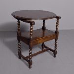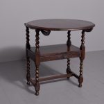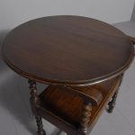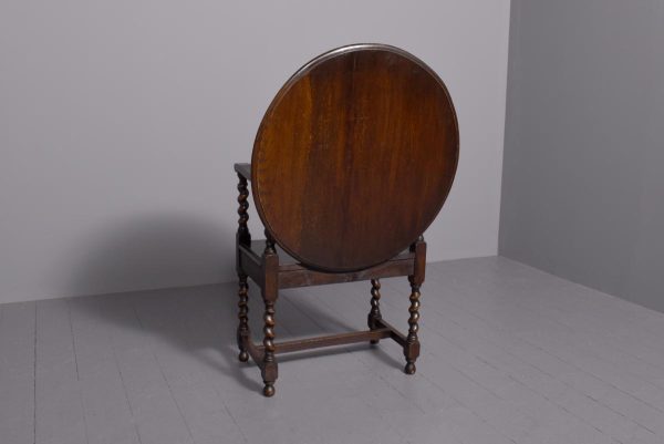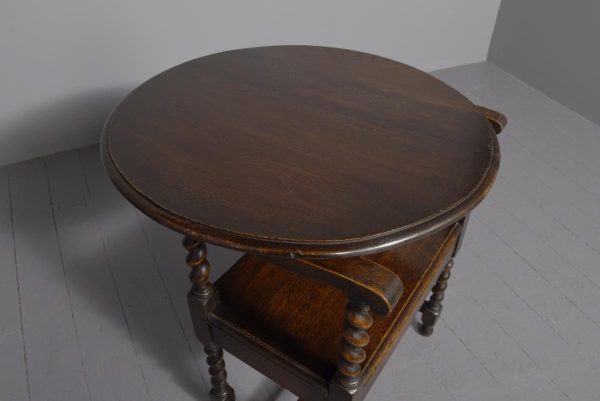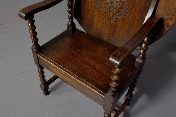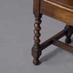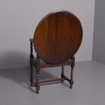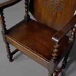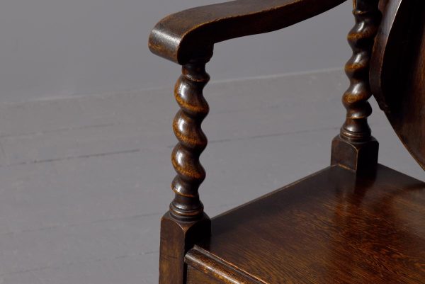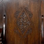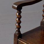 Circa 1900. Jacobean style folding-top oak single seat monk’s bench. The circular top with Jacobean carvings on the inside, swivels on the arms of the chair to form a hall table. The arms supported on barley twist columns to a solid seat with moulded fore-edges and a simple seat rail on barley twist legs connected by an H-stretcher
