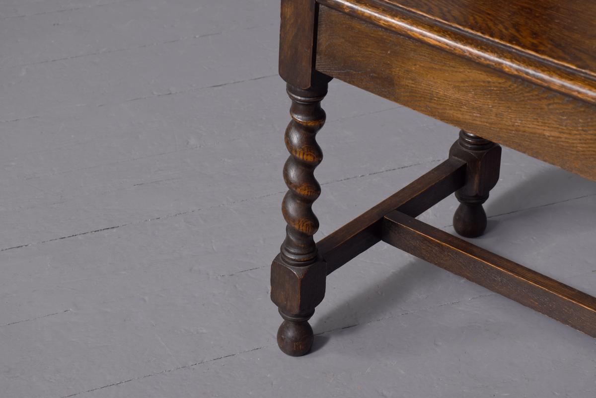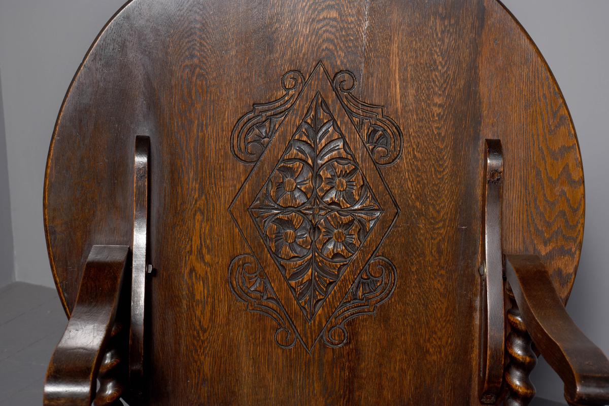 Circa 1900. Jacobean style folding-top oak single seat monk’s bench. The circular top with Jacobean carvings on the inside, swivels on the arms of the chair to form a hall table. The arms supported on barley twist columns to a solid seat with moulded fore-edges and a simple seat rail on barley twist legs connected by an H-stretcher