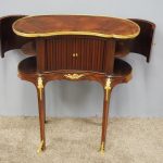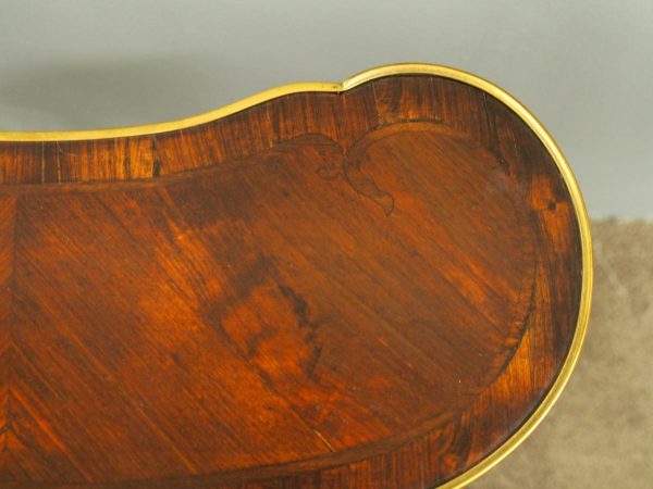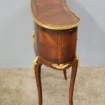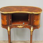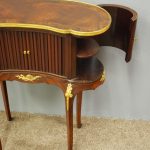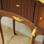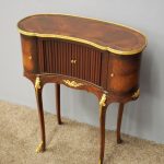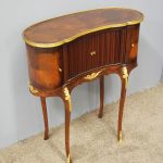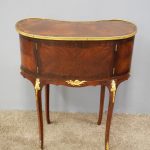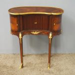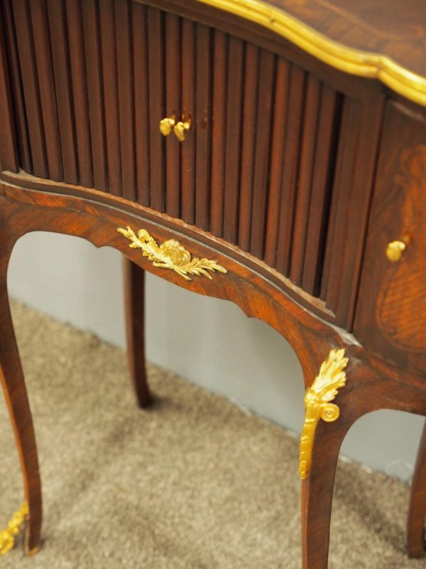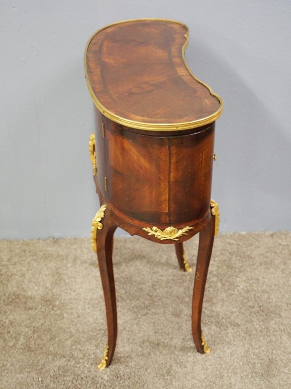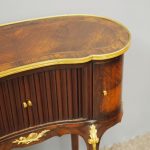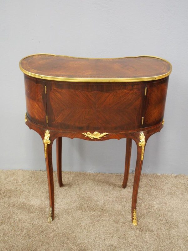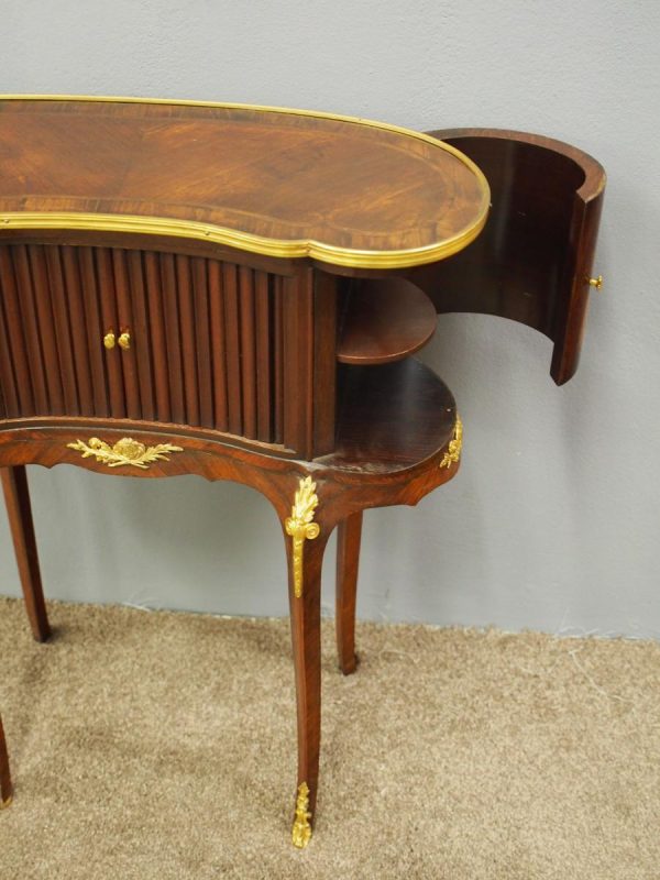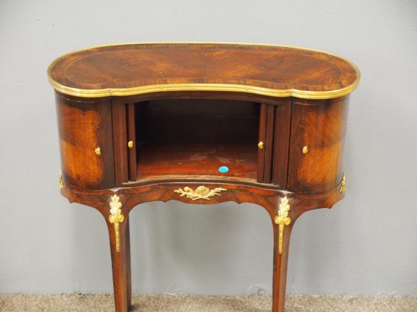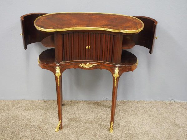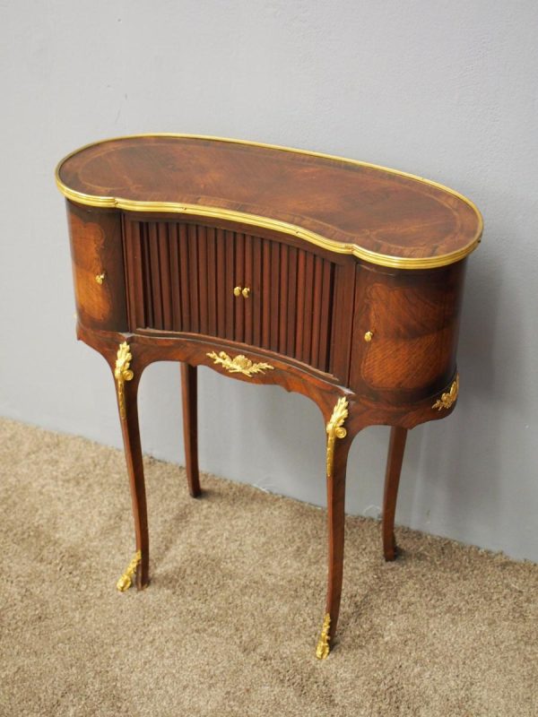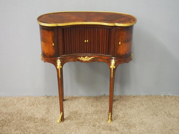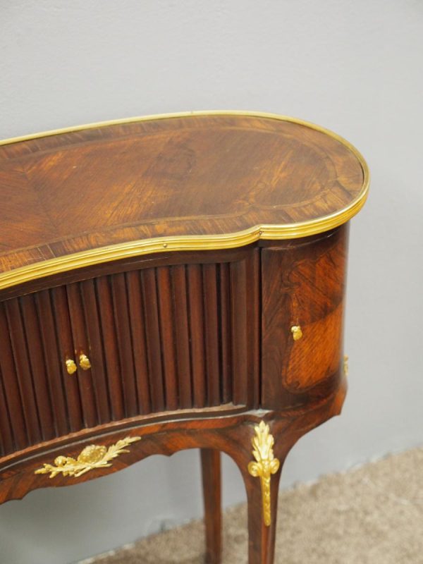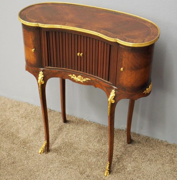 Circa 1860, kidney shaped side cabinet. With a kidney shaped top in cross-banded walnut and ormolu mounts, with a tambour front door beneath this opening to reveal an uninterrupted space. There are two bow end doors (either side) and it leads on to a shaped apron with ormolu, gilded mounts.