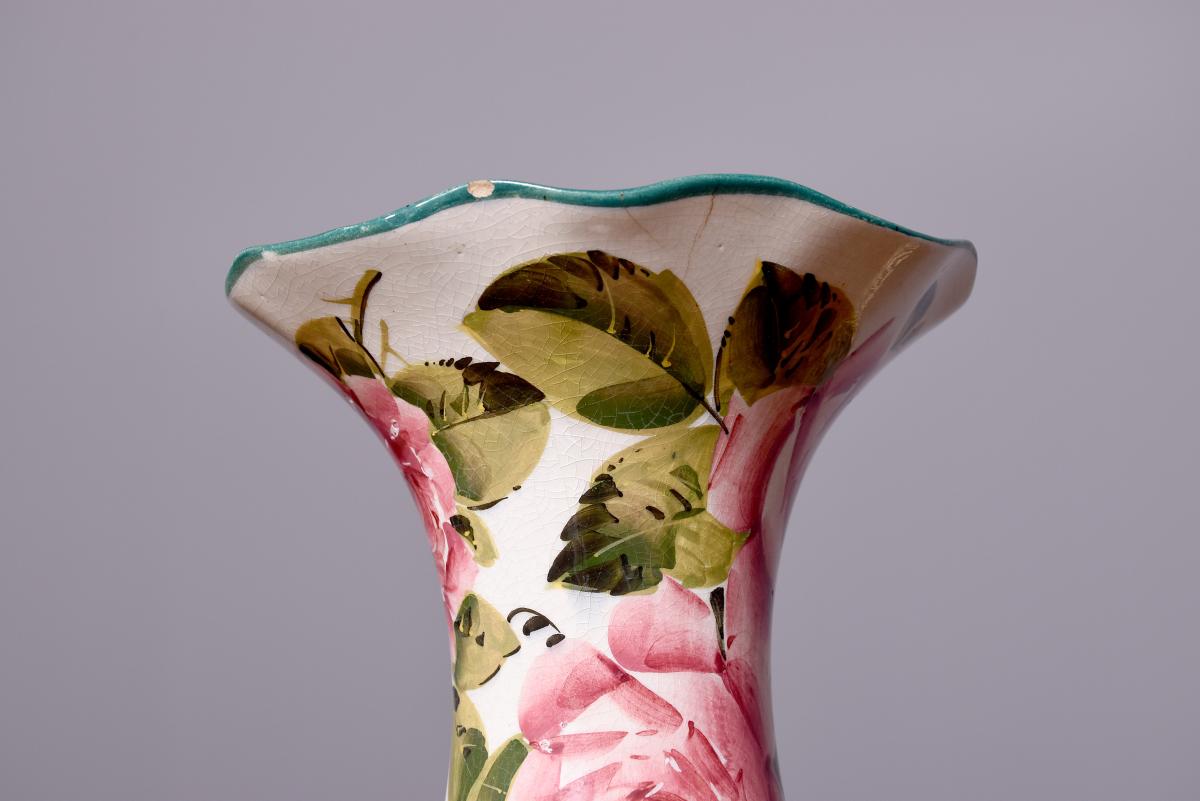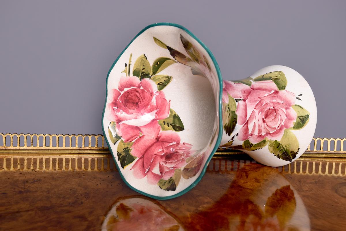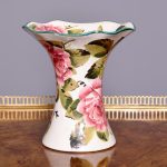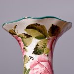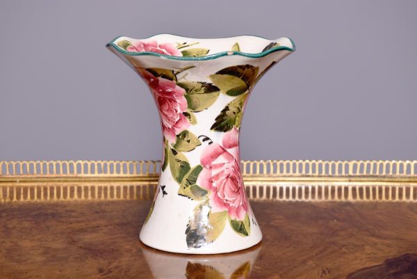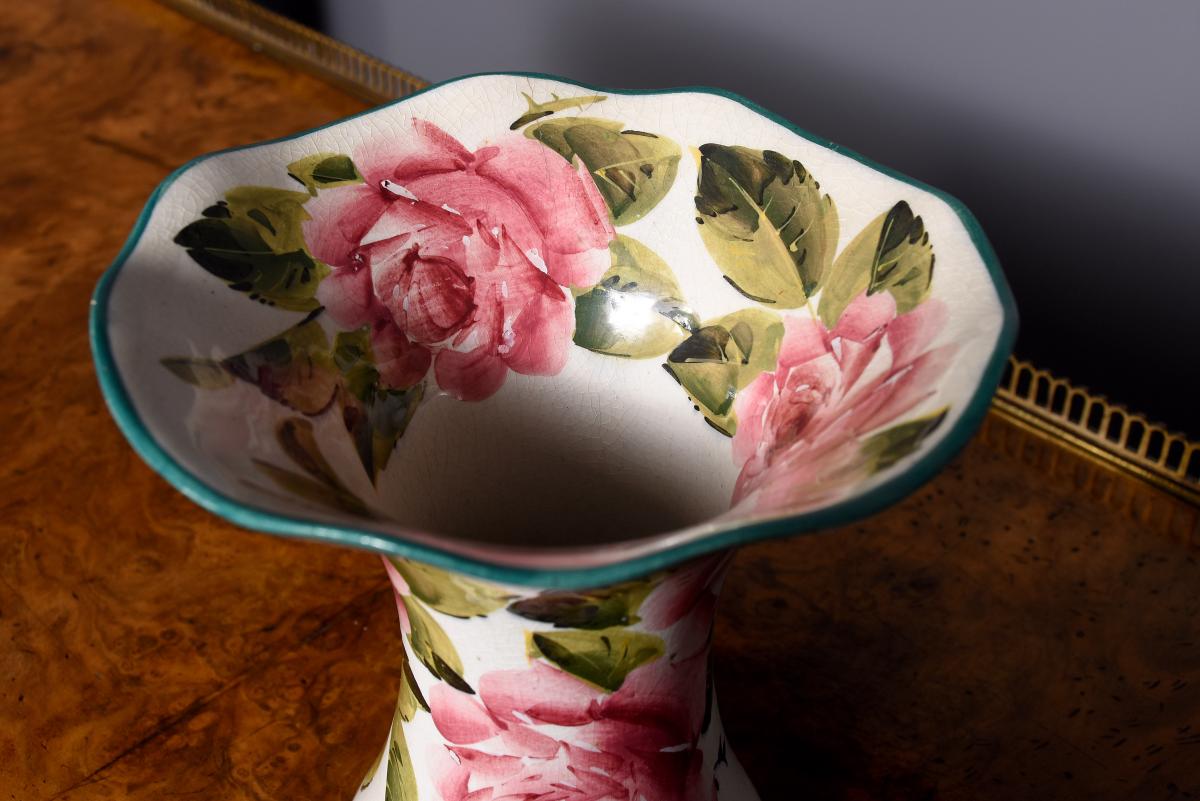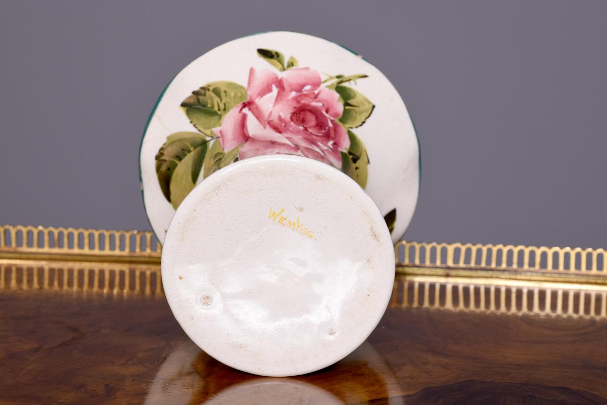 Circa 1900. A Wemyss Ware Lady Eva vase, the rim painted green, the dark roses to the inside of the flared top and to the body outside, the underside signed in yellow ‘Wemyss’, maker not known.