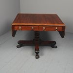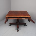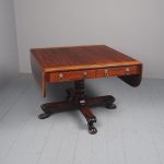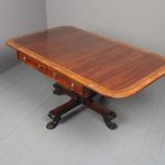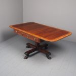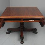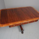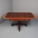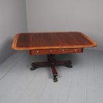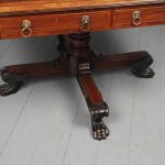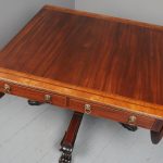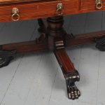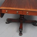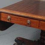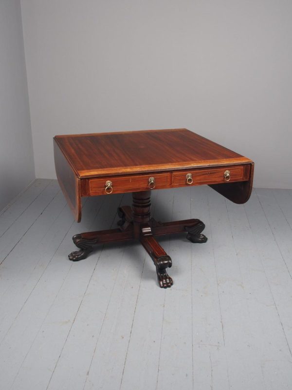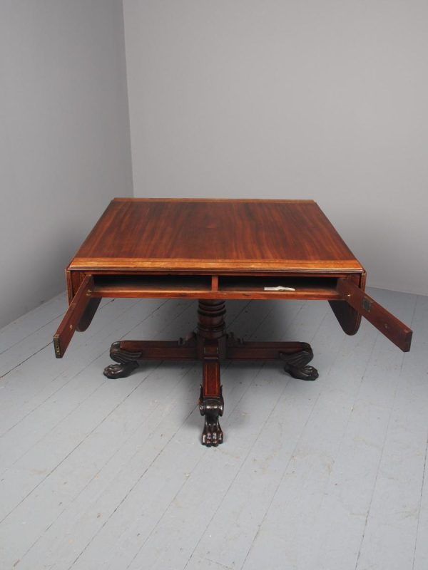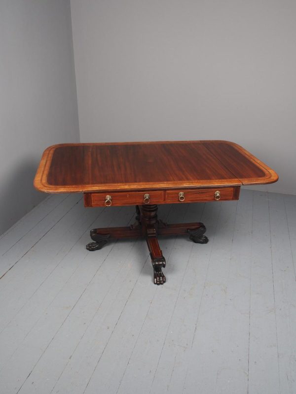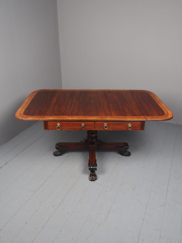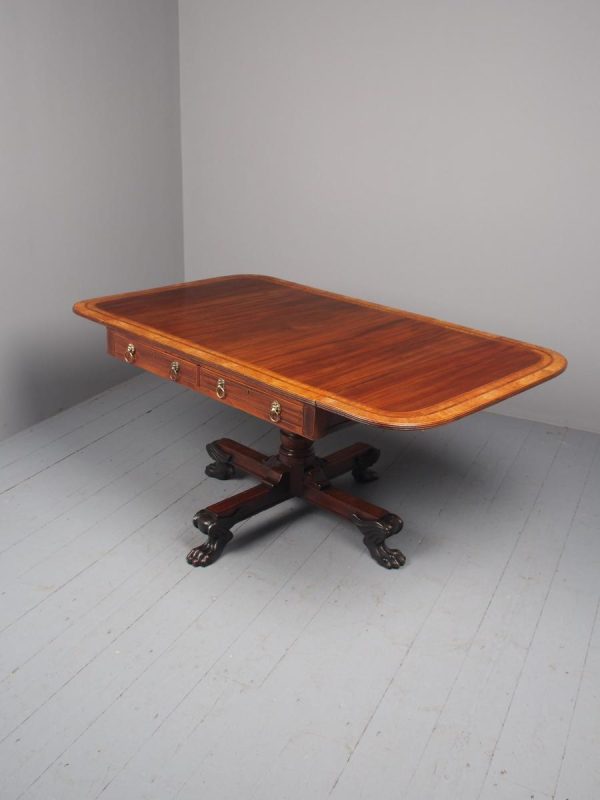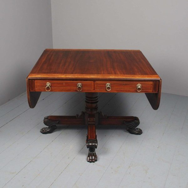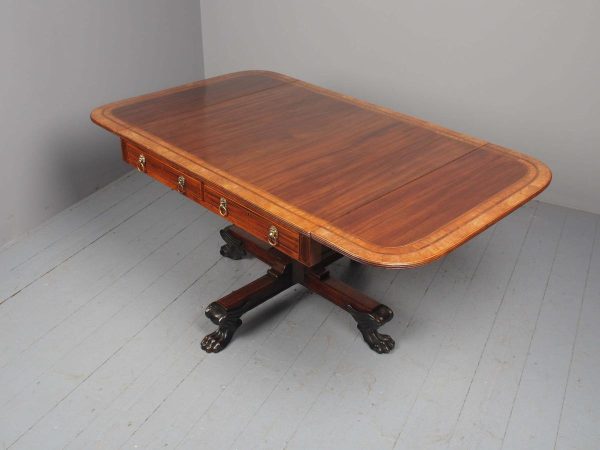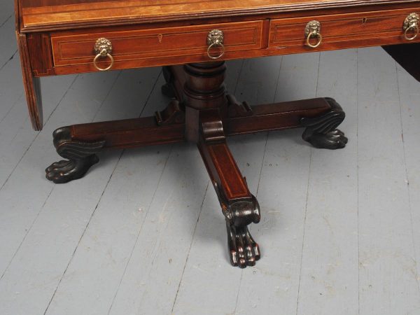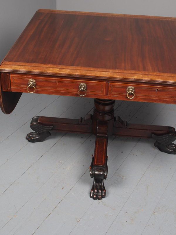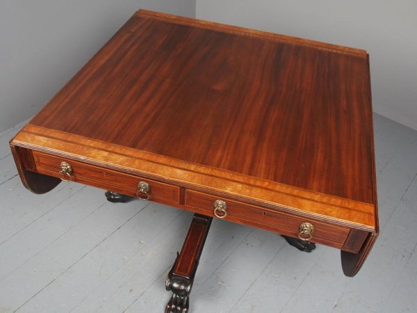 Circa 1800, large, unusual style, George III mahogany sofa table. The top is crossbanded in satinwood, birds eye maple and tulipwood, with rounded side flaps. An unusual configuration of inlaid drawer fronts with brass lion mask handles that hinge open, allowing 2 full table-depth sections for maps or architectural drawings. All supported on a ring turned, gun barrel stem over a cruciform inlaid platform base, supported on boldly carved griffin feet.