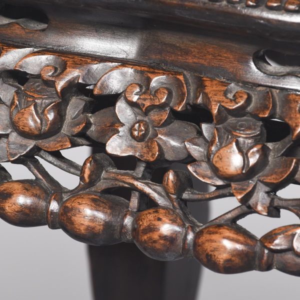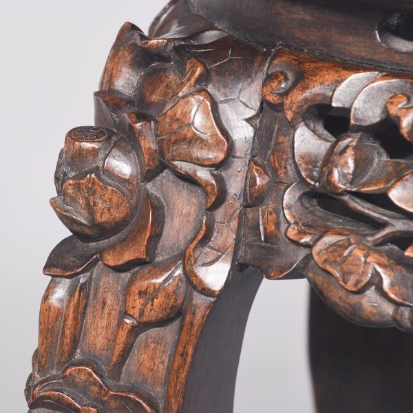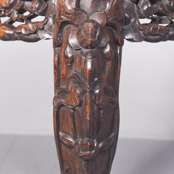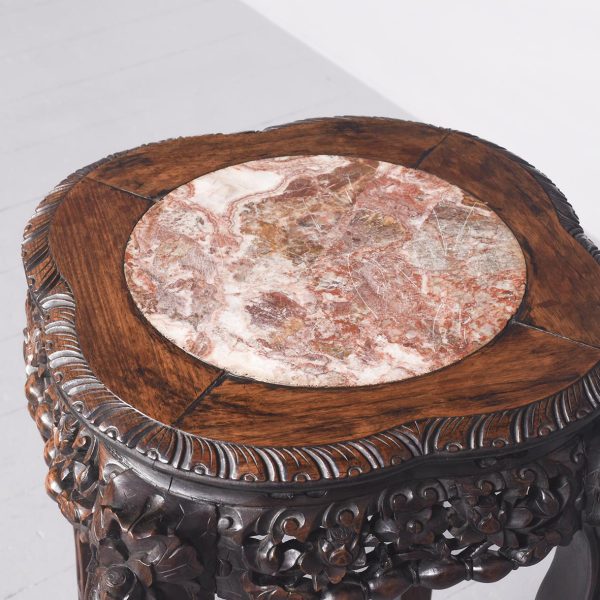 Circa 1890. Large carved hardwood Qing Dynasty plant stand. The shaped top with inset variegated white and pink marble inset and a carved dragooned edge above an open fret carved foliate frieze with hawthorn flowers and foliage. Supported on four cabriole legs with foliate carved knees terminating in carved toes with a shaped under stretcher.