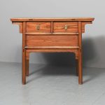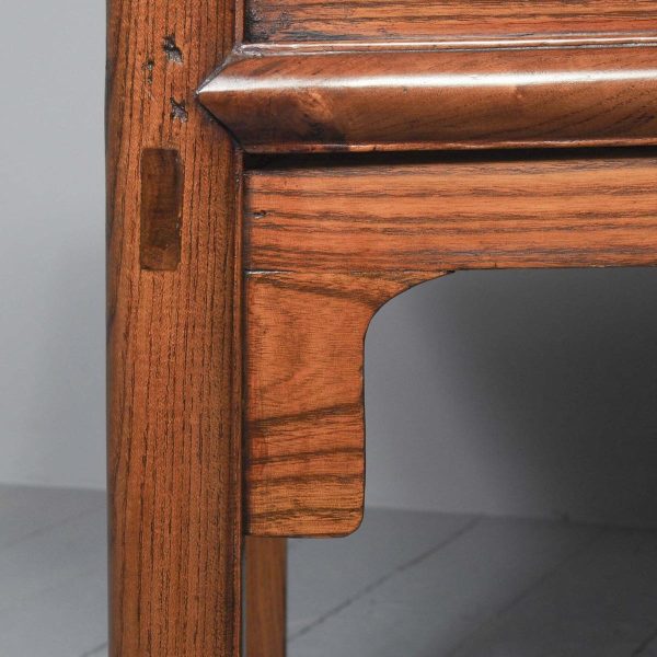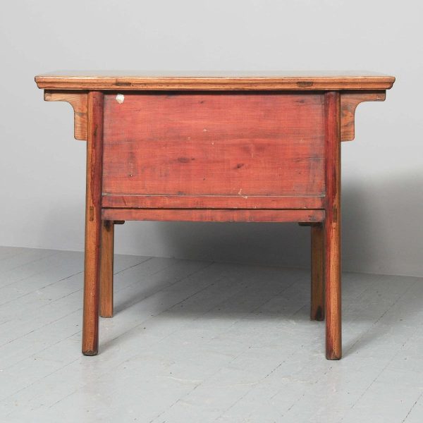 Circa 1900, large Chinese elm (and possibly ash) altar style table. The rectangular top with good figuring and a mellow colour, over 2 frieze drawers with solid liners and cast brass handles. With storage area access beneath the drawers and a shaped apron to all sides, all supported on shaped feet.