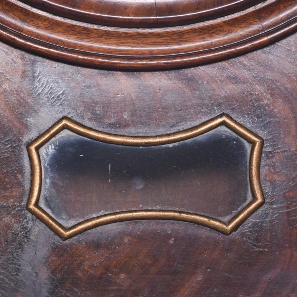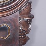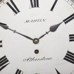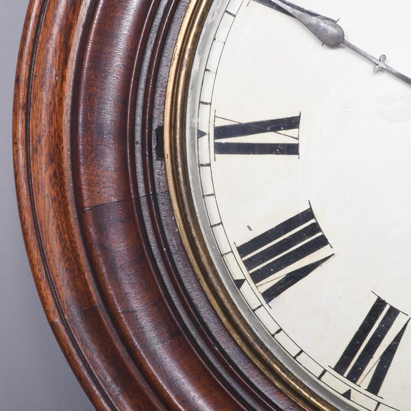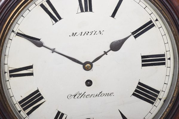Circa 1870. A mid Victorian mahogany framed drop-dial fusee wall clock. The circular hood with various mouldings, white enamel face with Roman numerals, inscribed, ‘Martin Arthastone’ and a single winding hole. The glass sits in a cast brass bezel, below a panel with a glazed cut for viewing the pendulum, with foliate carving on each side. In the base a curved section with a small hatch for accessing the pendulum. There are also two hatches to the sides of the clock, clock has recently been serviced and is working.