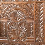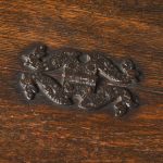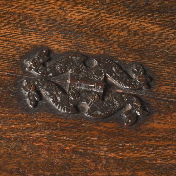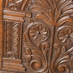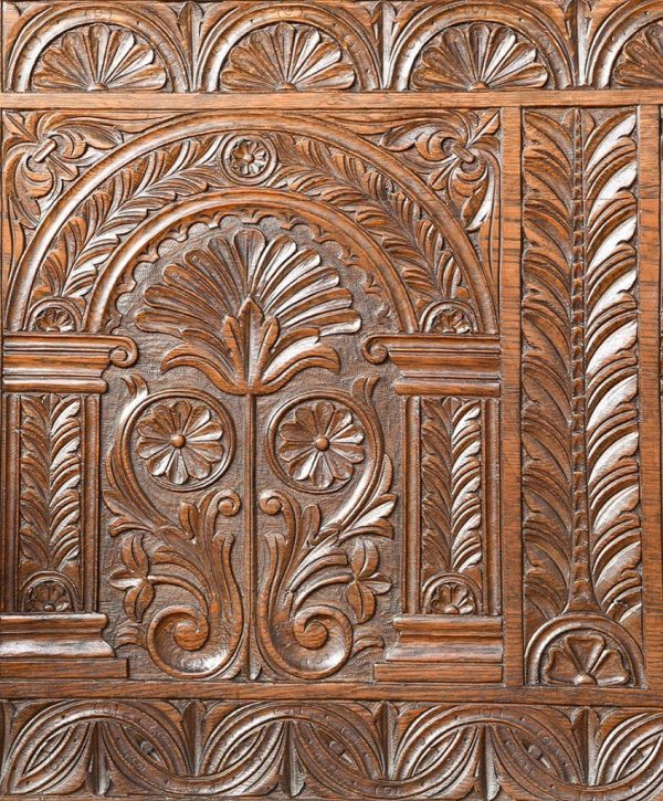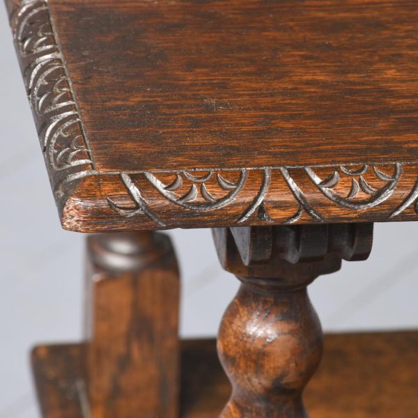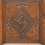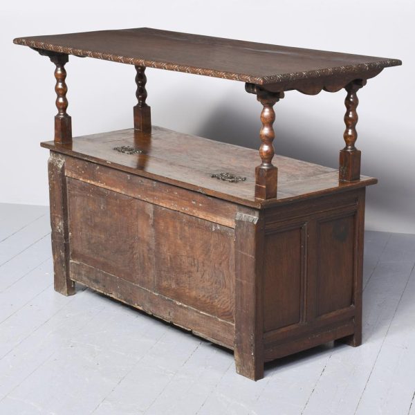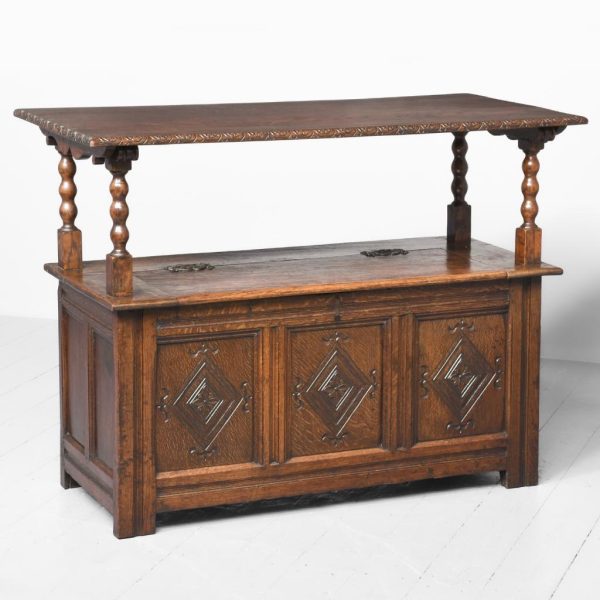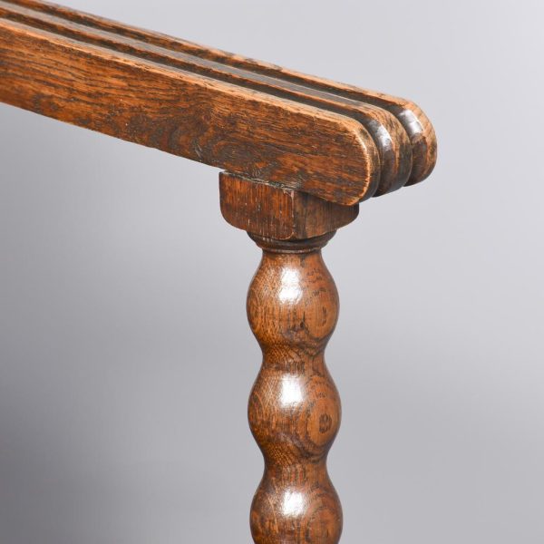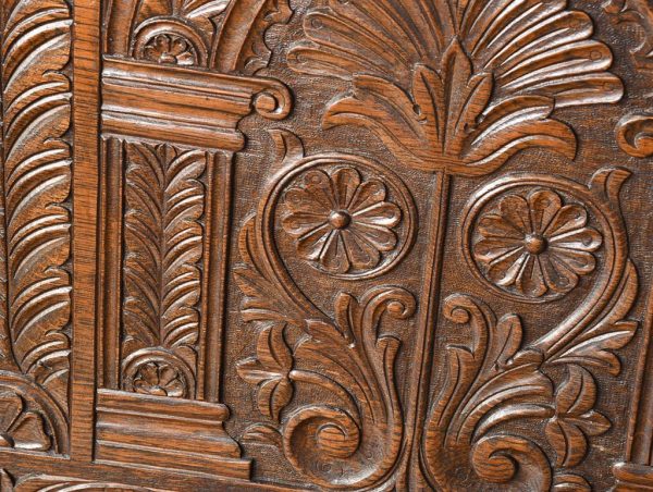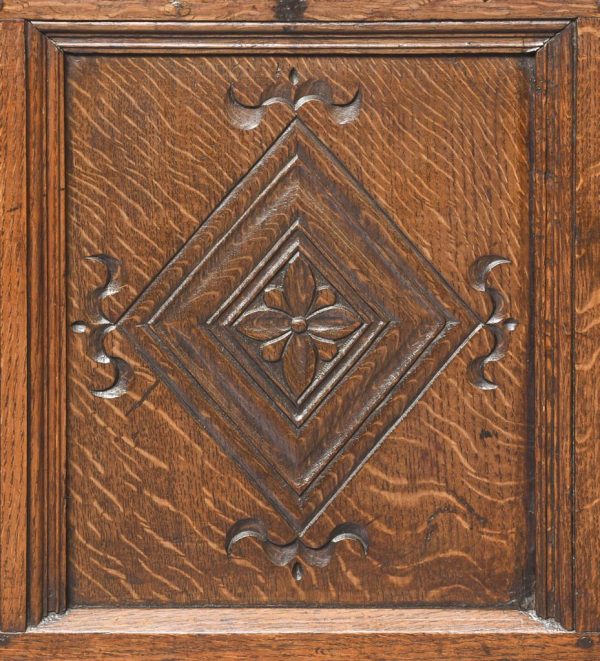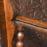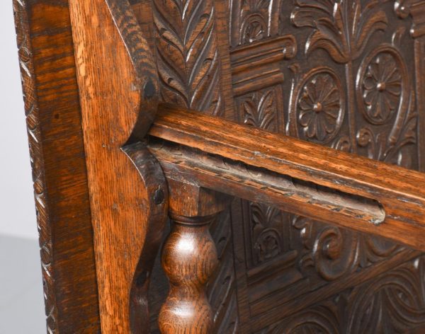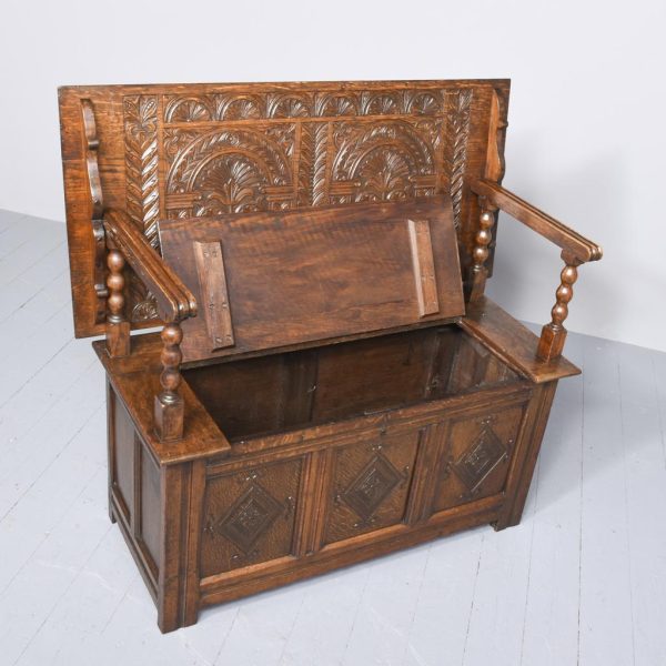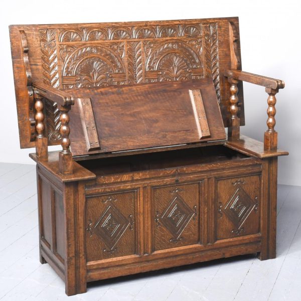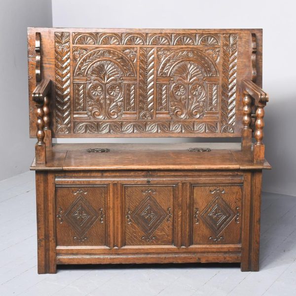 Circa 1890. Large finely carved Victorian oak monk’s bench. The folding top with carved edge with exceptional foliate carved panels supported on a scrolled arm on bobbin supports. The large seat with decorative external metal hinges opens to a large storage space. The bench paneled front with Jacobean-style lozenge carvings and the side with twin panels all on styled feet. Large size and exceptional quality carving and lovely patina.