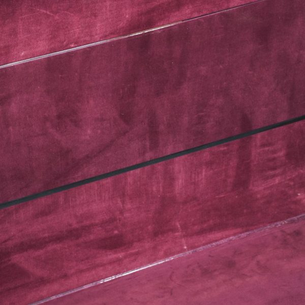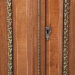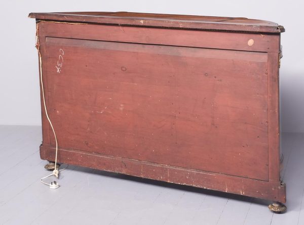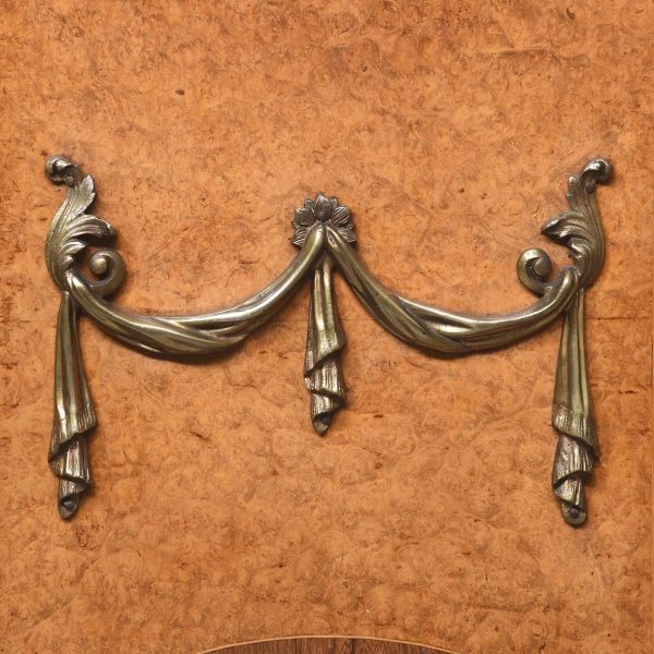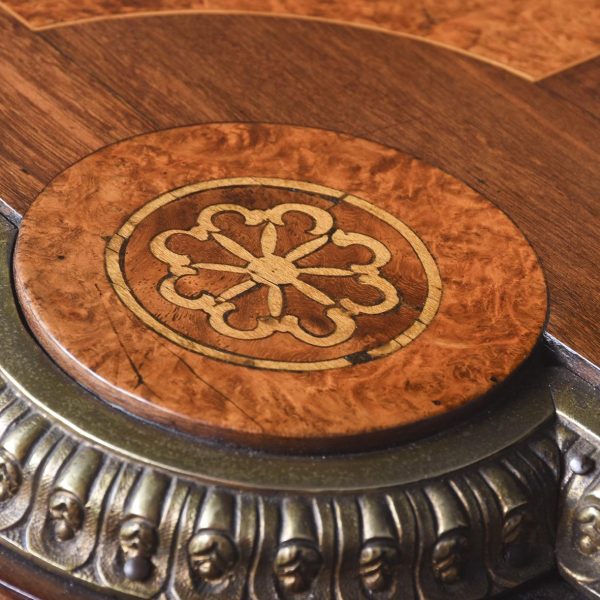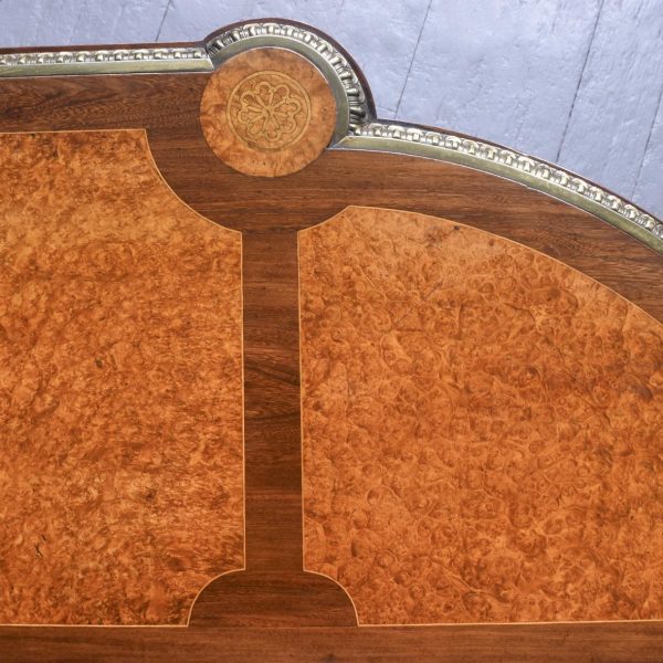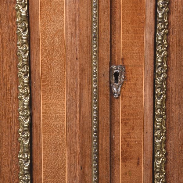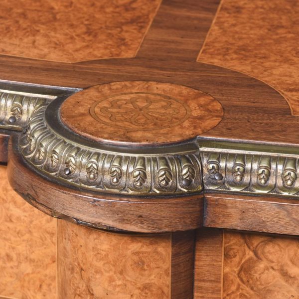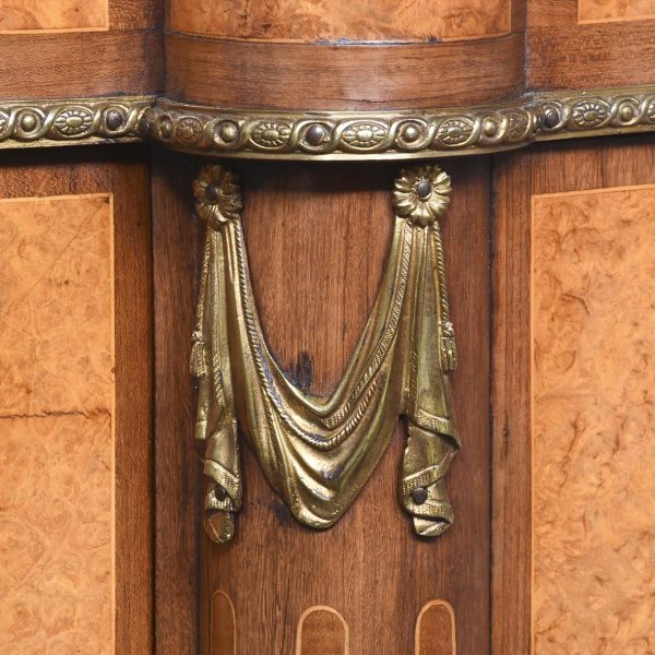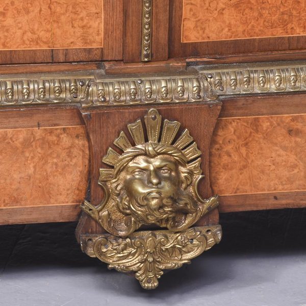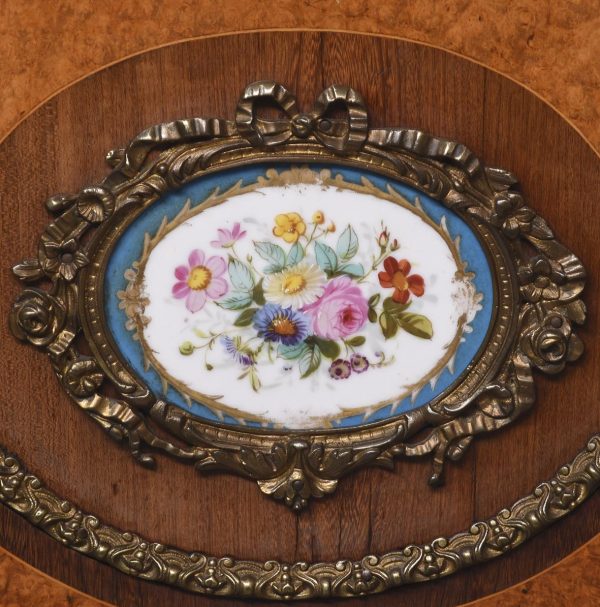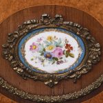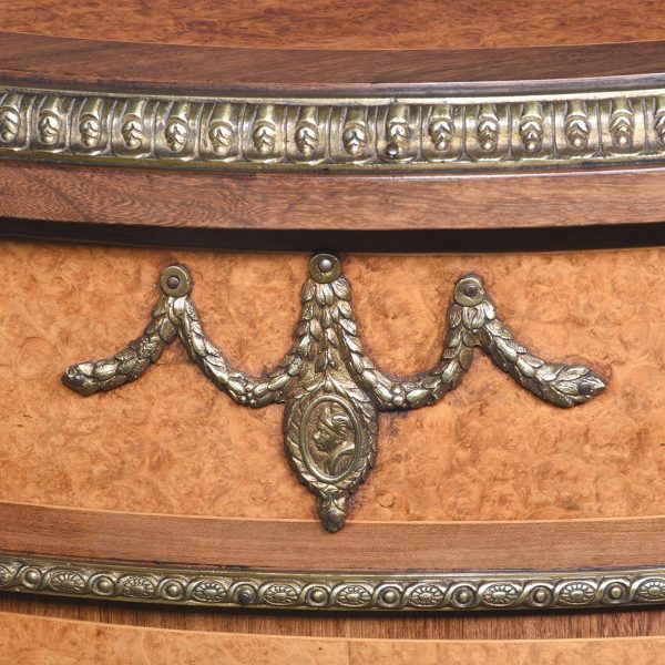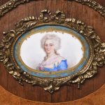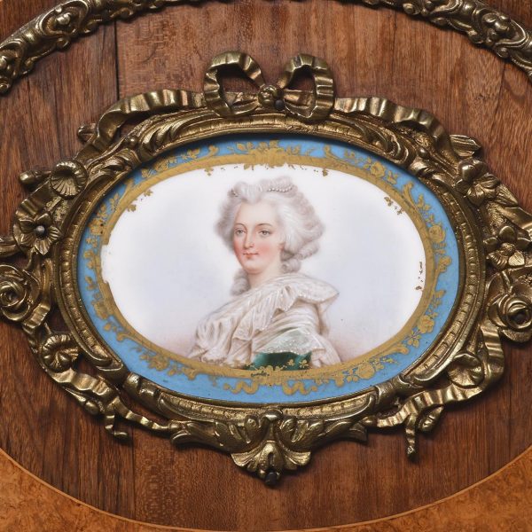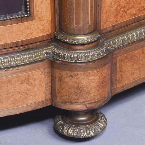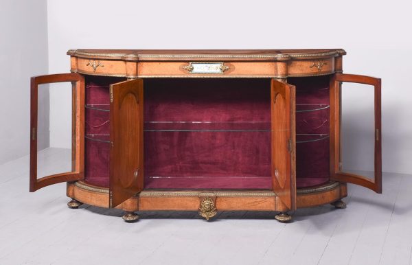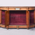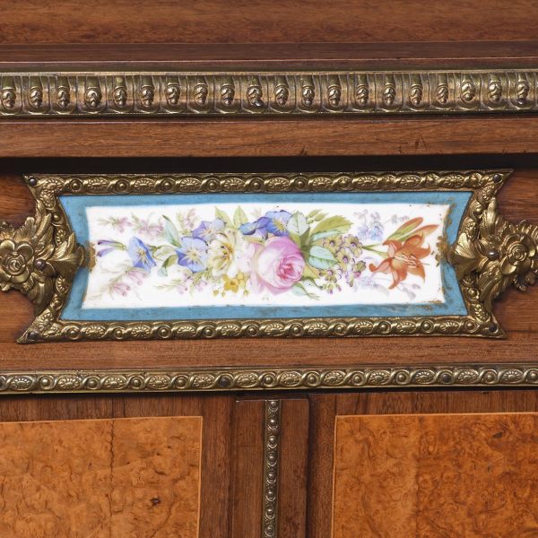 Circa 1860. A French amboyna amaranth and porcelain mounted credenza. The breakfront D shaped outline, the crossbanded top with metal banding and porcelain panel, above a pair of cupboards mounted with four oval Sevres plaques depicting 18th century ladies and floral bouquets, flanked by a pair of curved display cupboards enclosing glass shelves with plush interior on a plinth base raised on toupie feet with gilt bronze mounts. Provenance ‘Ashley Hall, Cheshire’.