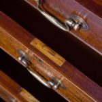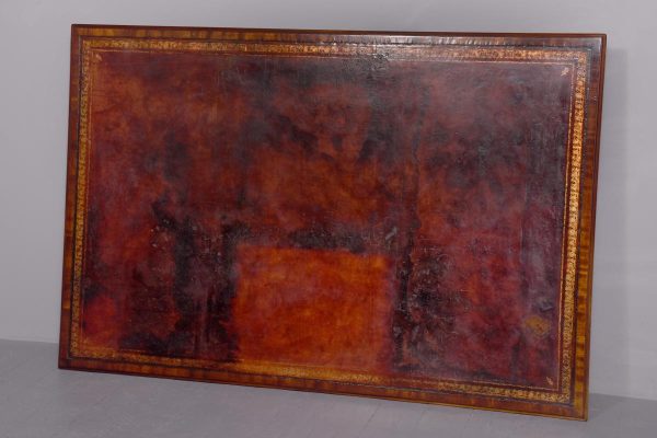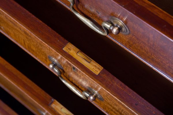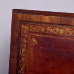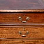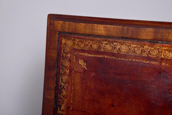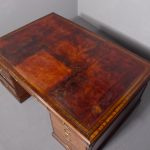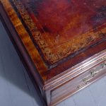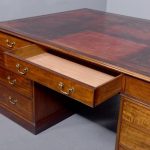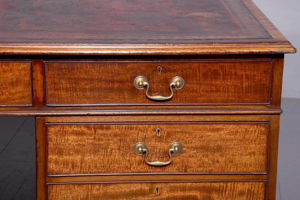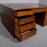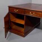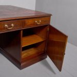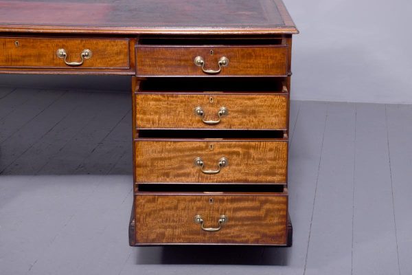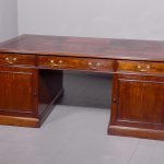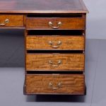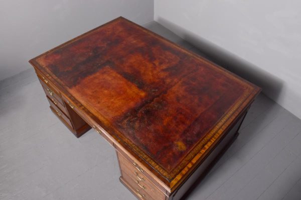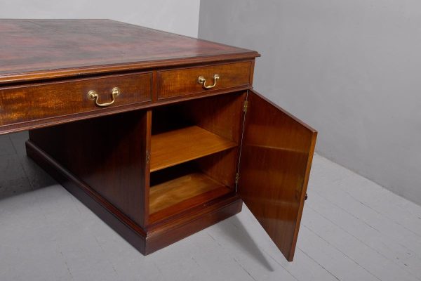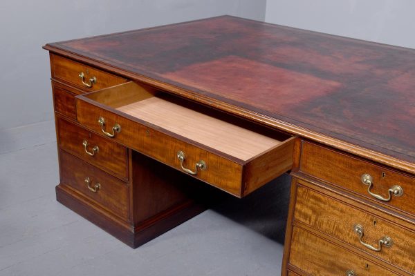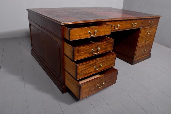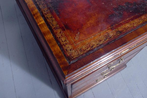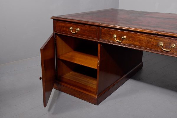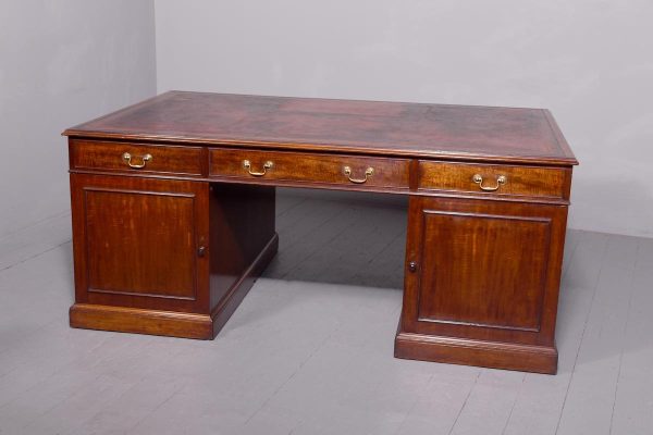 Circa 1820s. George III style mahogany three part partners pedestal desk, the top with insert tooled in gilded red leather with stylish banding and elegant moulded fore-edge, the front with a configuration of one full length drawer flanked by two shorter drawers, resting on pedestals each with a bank of three drawers, all have cock beaded fore-edges, cast brass swan neck handles and mahogany lining’s, the gables with panels with canted corners, the back with a pair of cupboards with three faux drawers on the top, the desk comes with several keys and the original label’s from when it was retailed by ‘Whytock and Reid of Edinburgh.’