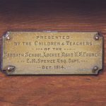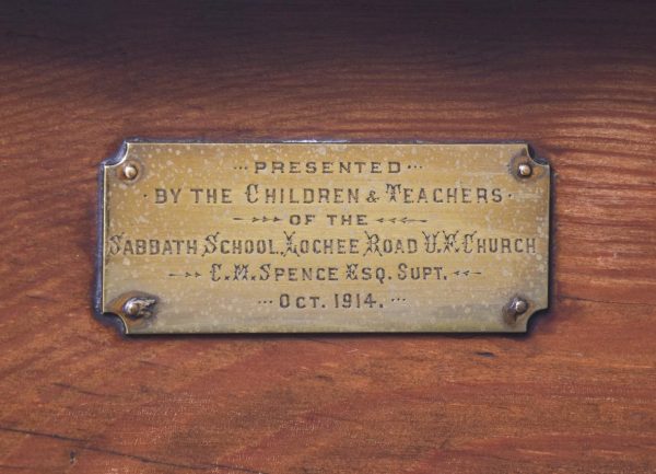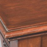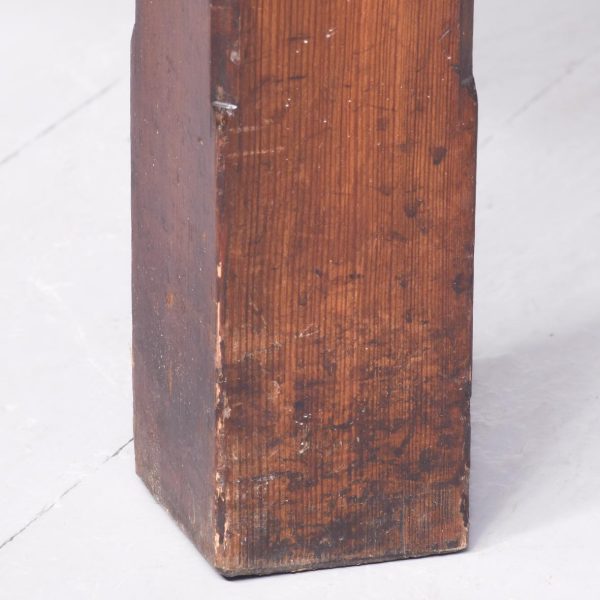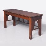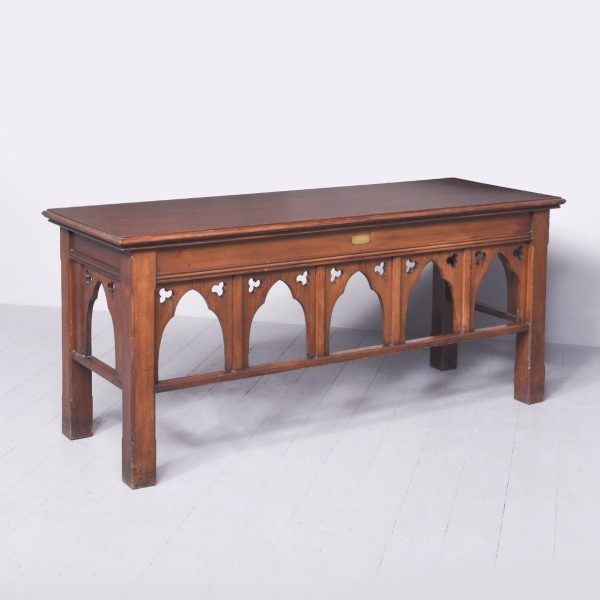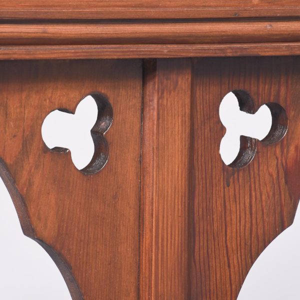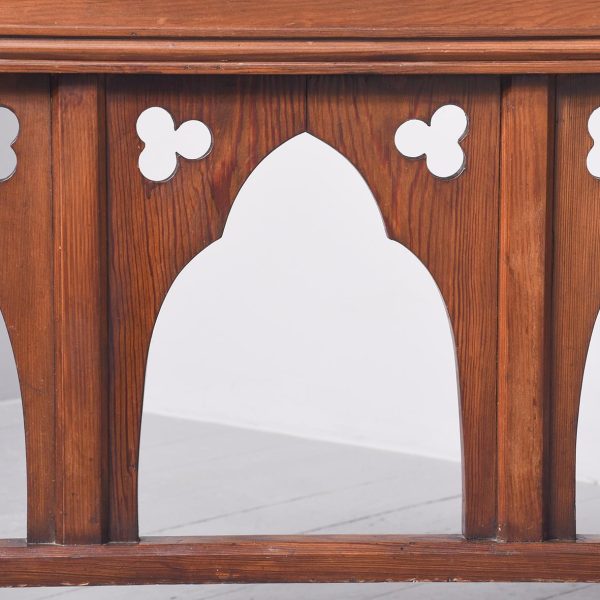 Circa 1880. A stained pitch pine gothic influenced side or serving table. The solid top with a moulded edge, deep frieze with triple beadings and five gothic arches with quatrefoil piercings, with one arch on each end, the back of the table is open, the arches rest on a simple pine stretcher with chamfered fore-edge, all resting on four stout chamfered square legs.
