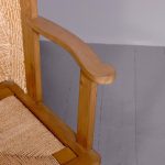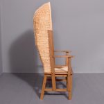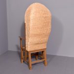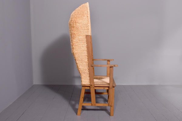 Circa 1990. Large handmade hooded Orkney chair of traditional form. Made with 5 large sheaves of hand-cut, oat straw woven and bound to the wooden frame with marram grass bindings, the drop in seat pad in woven marram grass. The David Kirkness style, shaped arms supported on rectangular uprights which continue down the side of the frame, resting on traditional chamfered square legs. In pristine condition.