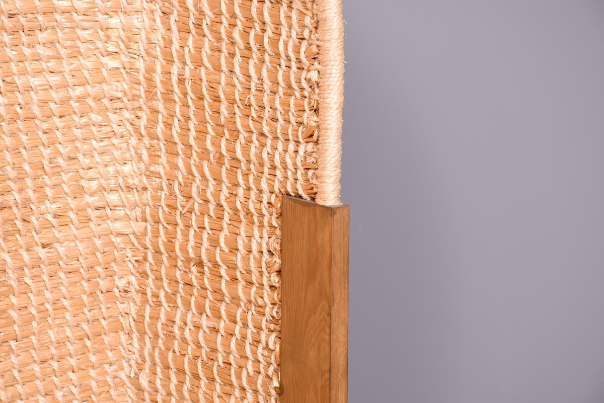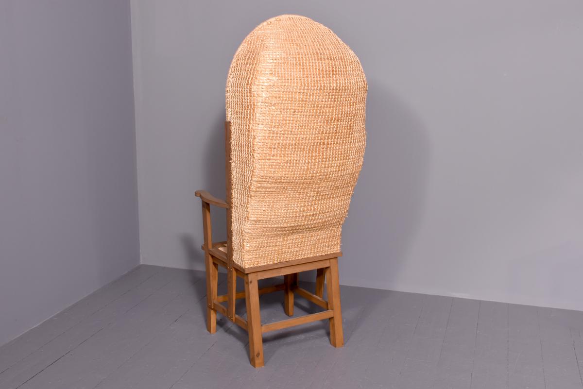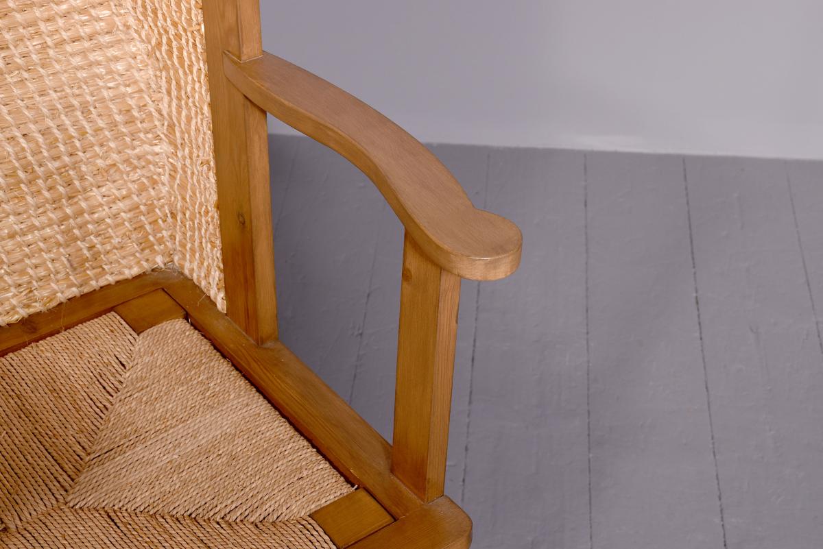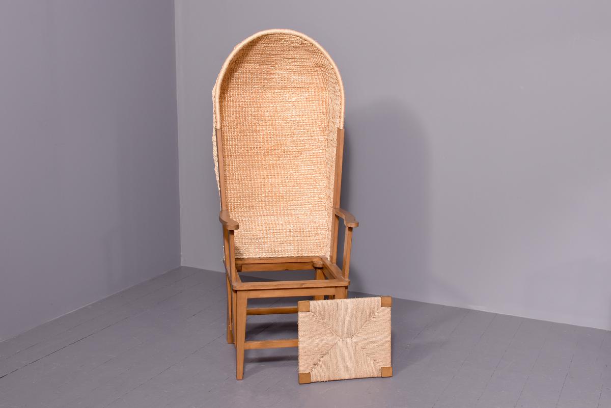 Circa 1990. Large handmade hooded Orkney chair of traditional form. Made with 5 large sheaves of hand-cut, oat straw woven and bound to the wooden frame with marram grass bindings, the drop in seat pad in woven marram grass. The David Kirkness style, shaped arms supported on rectangular uprights which continue down the side of the frame, resting on traditional chamfered square legs. In pristine condition.