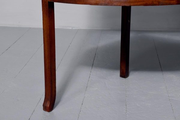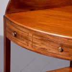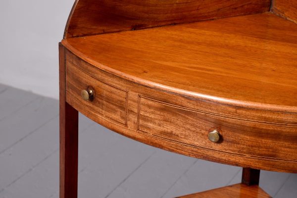 The two-sided, shaped back above the polished top with 3 inlaid faux drawers with brass pulls. Beneath is a second tier with two faux drawers and a real drawer centrally. All supported on square supports with splayed toes. Lovely colour and condition, and in perfect order.