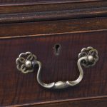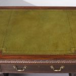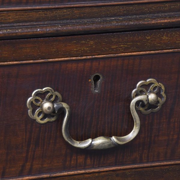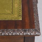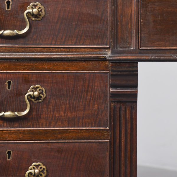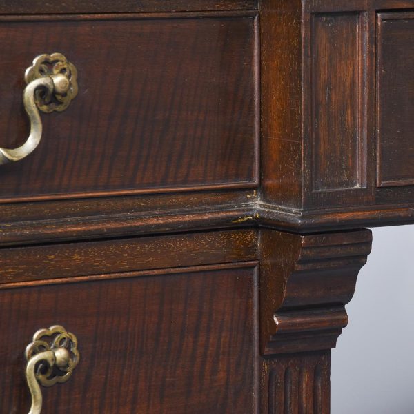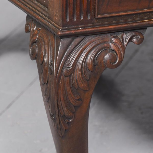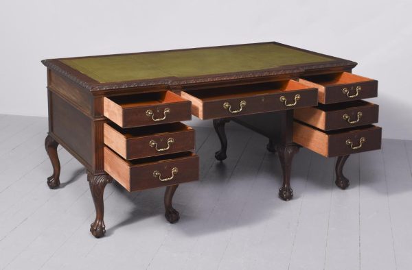 Circa 1890. Large late Victorian Chinese Chippendale-style mahogany breakfront desk. The top with a new git-tooled, green leather writing surface and foliate carved edges over one long and two short frieze drawers with solid mahogany drawer linings and cast brass swan handles above two shorter drawers flanked by fluted columns. With polished sides and back and supported on cabriole legs with acanthus carved leaves and brass and claw feet.