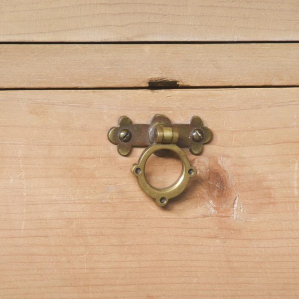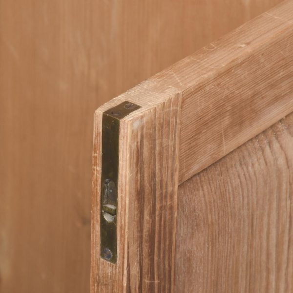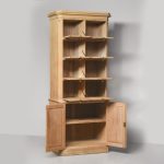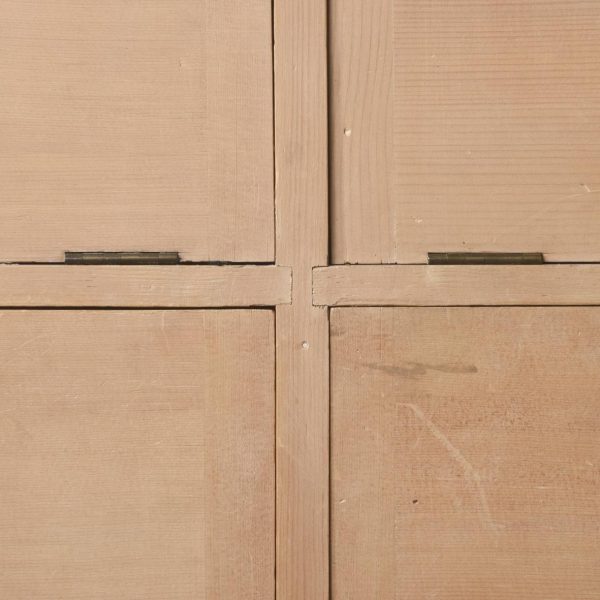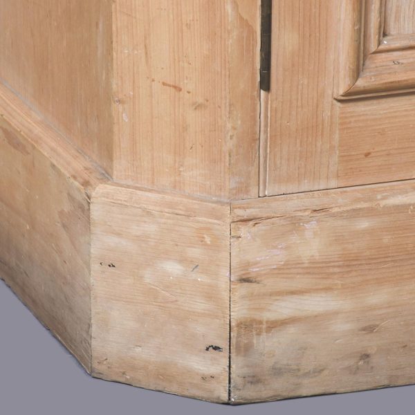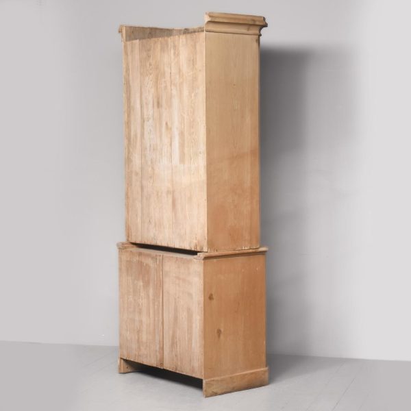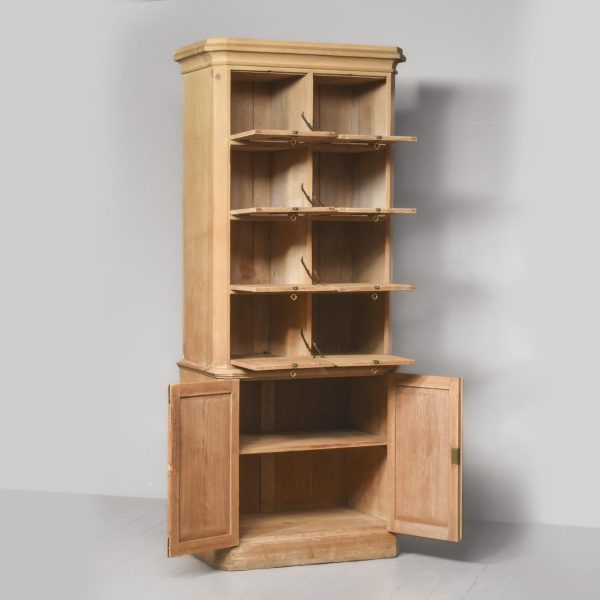 Circa 1880. A late Victorian yellow pine two-part estate cabinet. The generous moulded cornice with chamfered fore-edges, the chamfering on the fore-edges continues down from the top to the bottom. The top section with eight hinged doors each with a classic brass pull handle and a gothic style brass index plate, each of the sections when open is held in place by a brass arm. The top resting on the base with a moulded fore-edge, and a pair of cupboards below which open to reveal a single shelf, beneath this the bookcase rests on an enclosed pine plinth.
