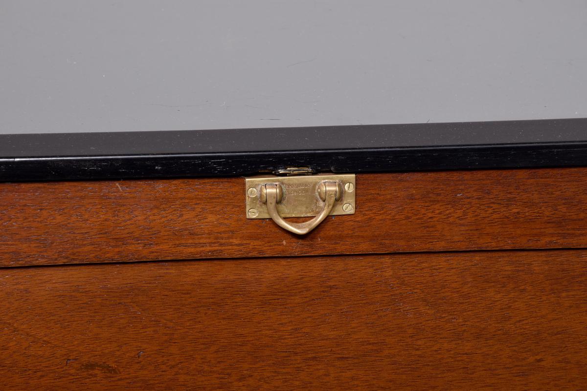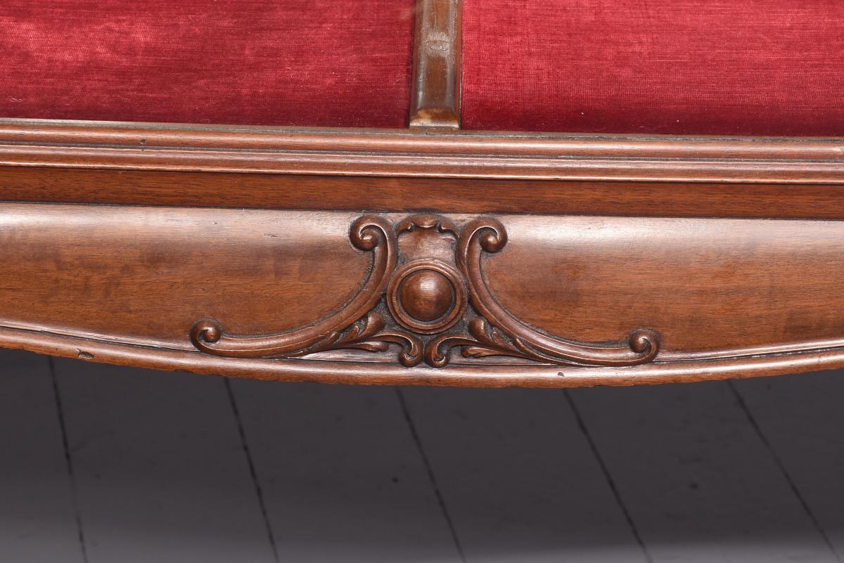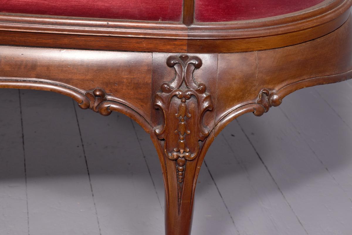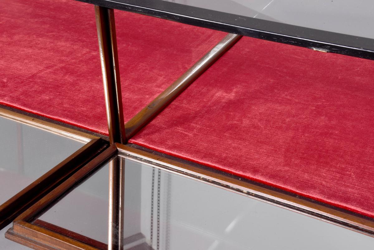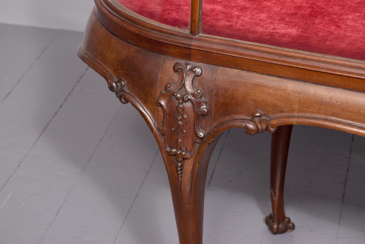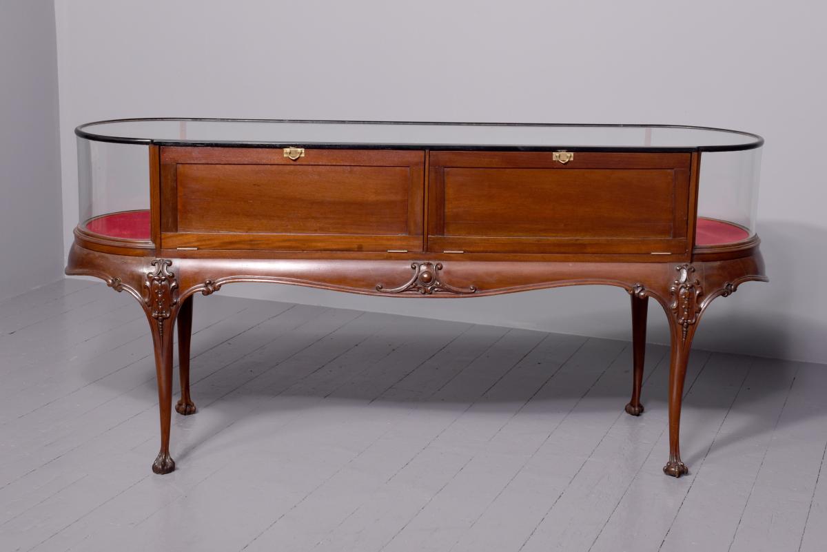 Circa 1880. A large stylish mahogany glass and mirrored display counter, the elongated counter with curved ends, glazed top and sides, the back section with two hinged mirror doors the inside is lined in red velour, with the fore-edges ebonized, with a shaped and carved frieze, the table rests on four elegant cabriole legs with cartouches carved on the top of the legs, finishing on an elegant neat sized ball and claw foot.