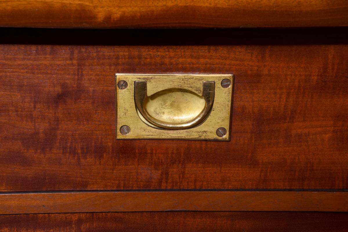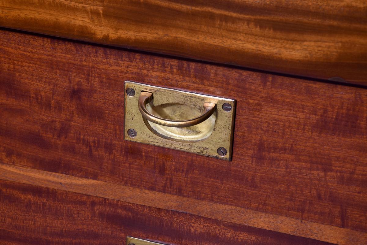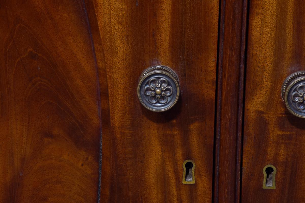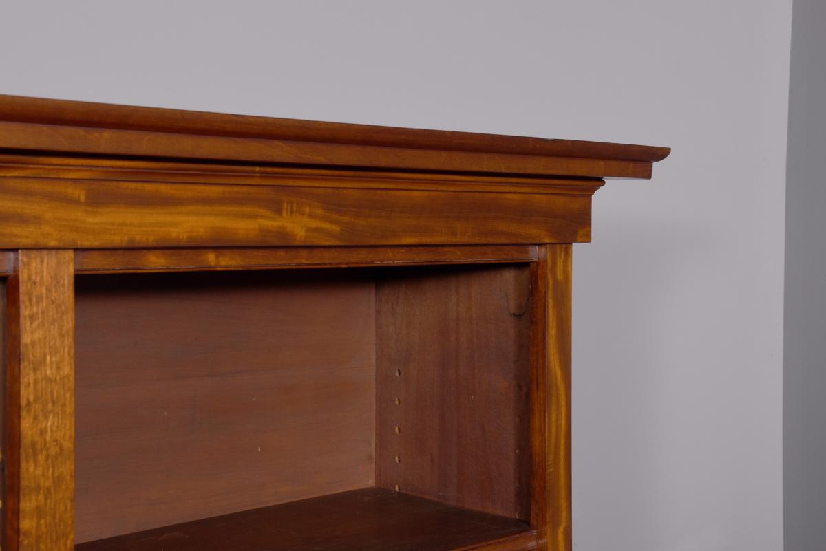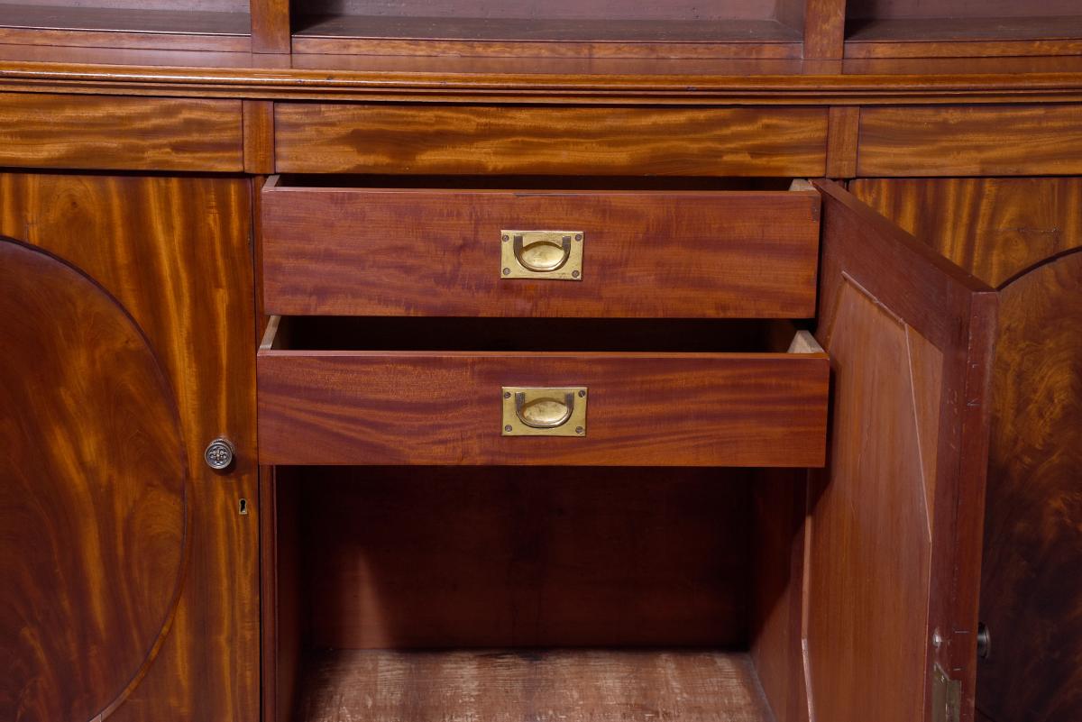 Circa 1850. An early Victorian mahogany three section open bookcase, the top with stylish moulded cornice with a simple beaded frieze, the top section with three open sections, each with three adjustable shelves separated by flat pilasters, the base with three concealed drawers in the frieze and three doors with oval flame mahogany panels with and cast brass knob handles, inside a variations including drawers and shelving, resting on an enclosed mahogany plinth.