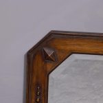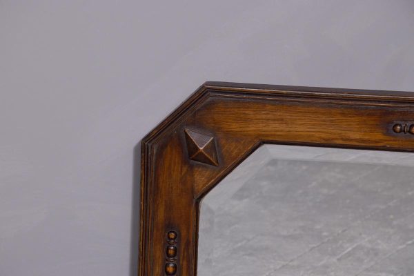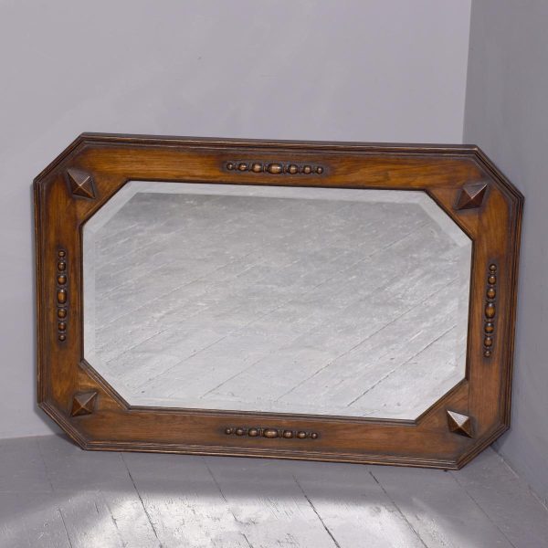 Circa 1920. Large oak Jacobean-revival bevelled edge rectangular wall mirror. The mirror frame with canted corners, beaded and diamond decorations and with a moulded edge surrounding the rectangular bevel edge mirror. Nice colour and patina and mirror in perfect condition.