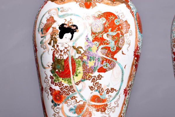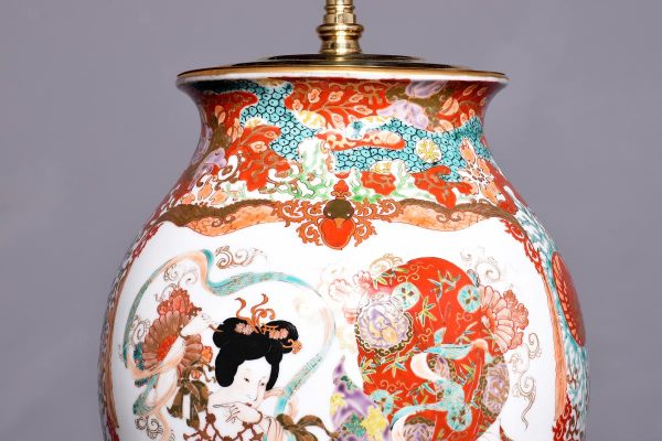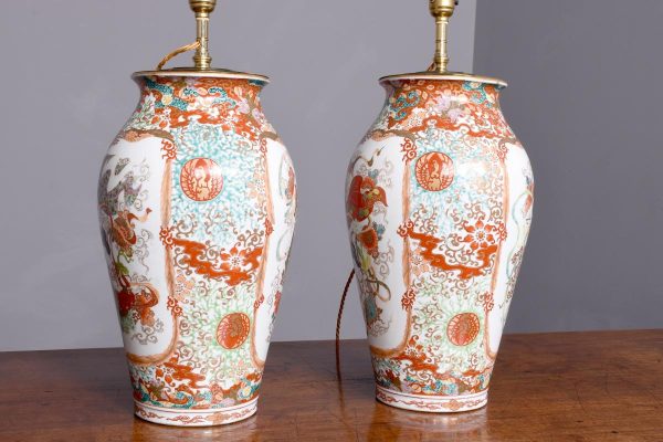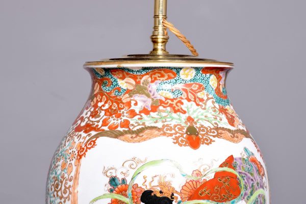 Circa 1930 A Large Pair of Canton vases recently converted to lamps, the tops with the brass lamp holders brown fabric cable, with a stylish brass cap, the bulbous bodies with classic decoration including musicians, birds and wonderful foliate painting, with   makers mark to the underside of the bottom.