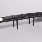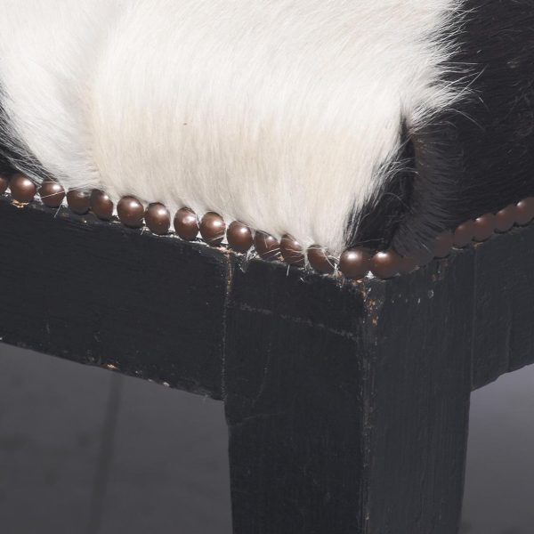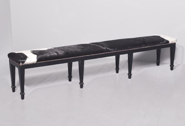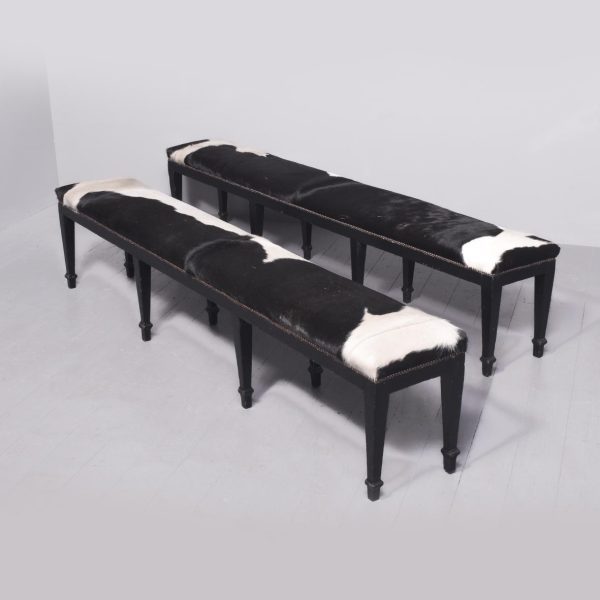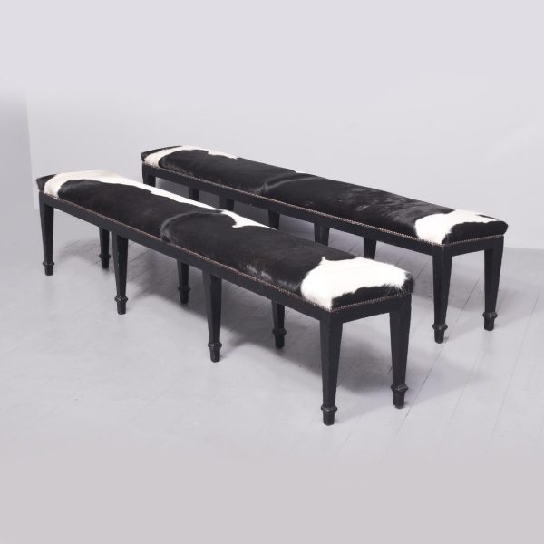 Circa 1870. A pair of stained pine country house benches, providence ex. ‘Kinross House’. The tops recently covered in cowhide with traditional horsehair and webbing beneath, the hide held in place by closed brass studding, onto a simple seat rail. The stools rest on eight square tapering legs with a small moulding towards the base, resting on a simple toe.